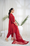The ensemble features a sindoori red mid-length A-line kattan silk tunic with three-quarter cutwork sleeves. Paired with organza dupatta embellished with cutwork thread embroidery all over. Finished with hand embroidered motifs and stones. Paired up with a matching kattan silk skinny shalwar to create an elegant and timeless look.