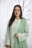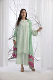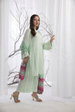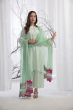 Jahaan'23: Spring green digital printed pure crepe georgette shirt. A-line shirt adorned with thread & sequins embroidery all over. Paired up with the same print culottes and cotton net dupatta with a fuchsia accent embroidery. A perfect chic look for this festive season.