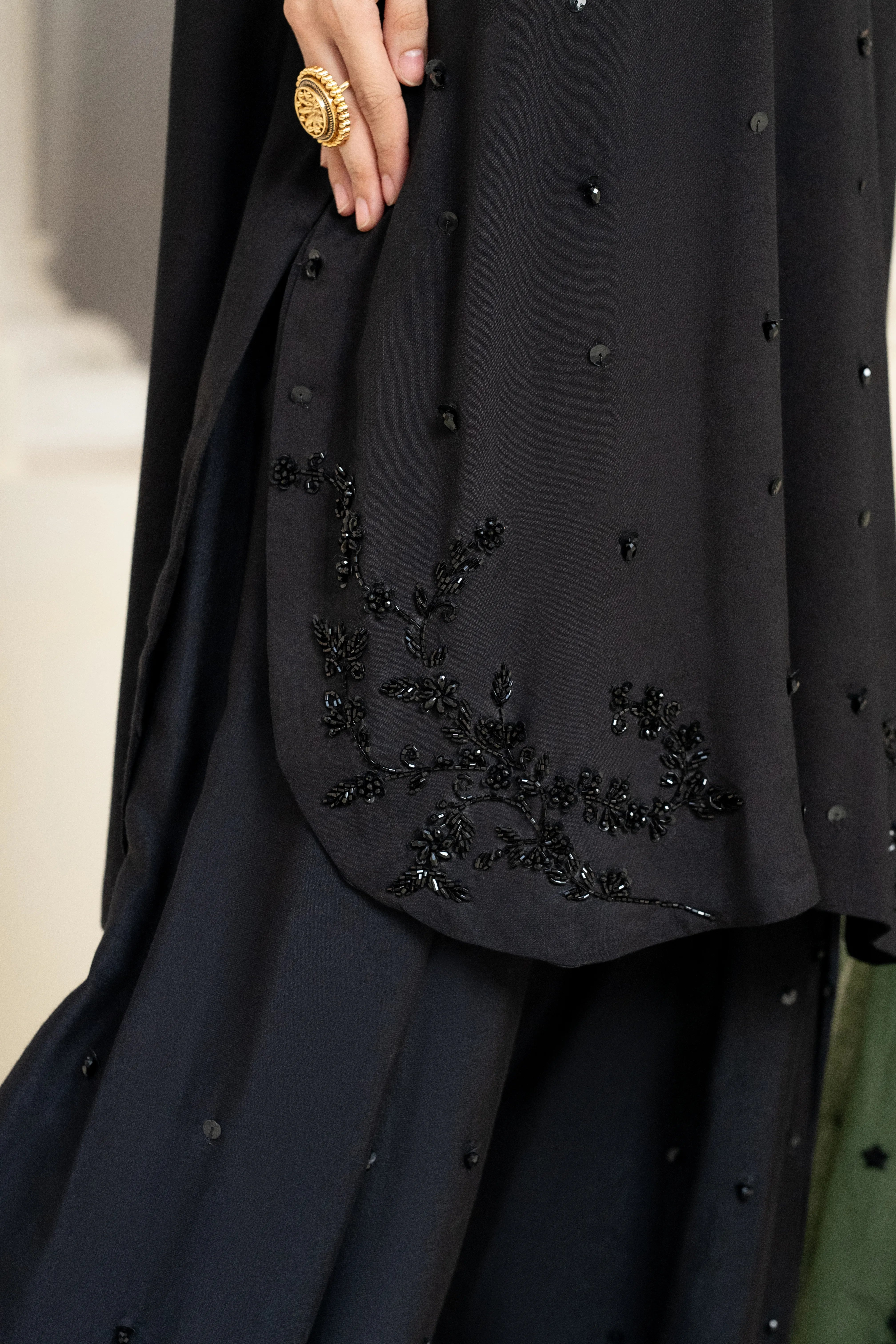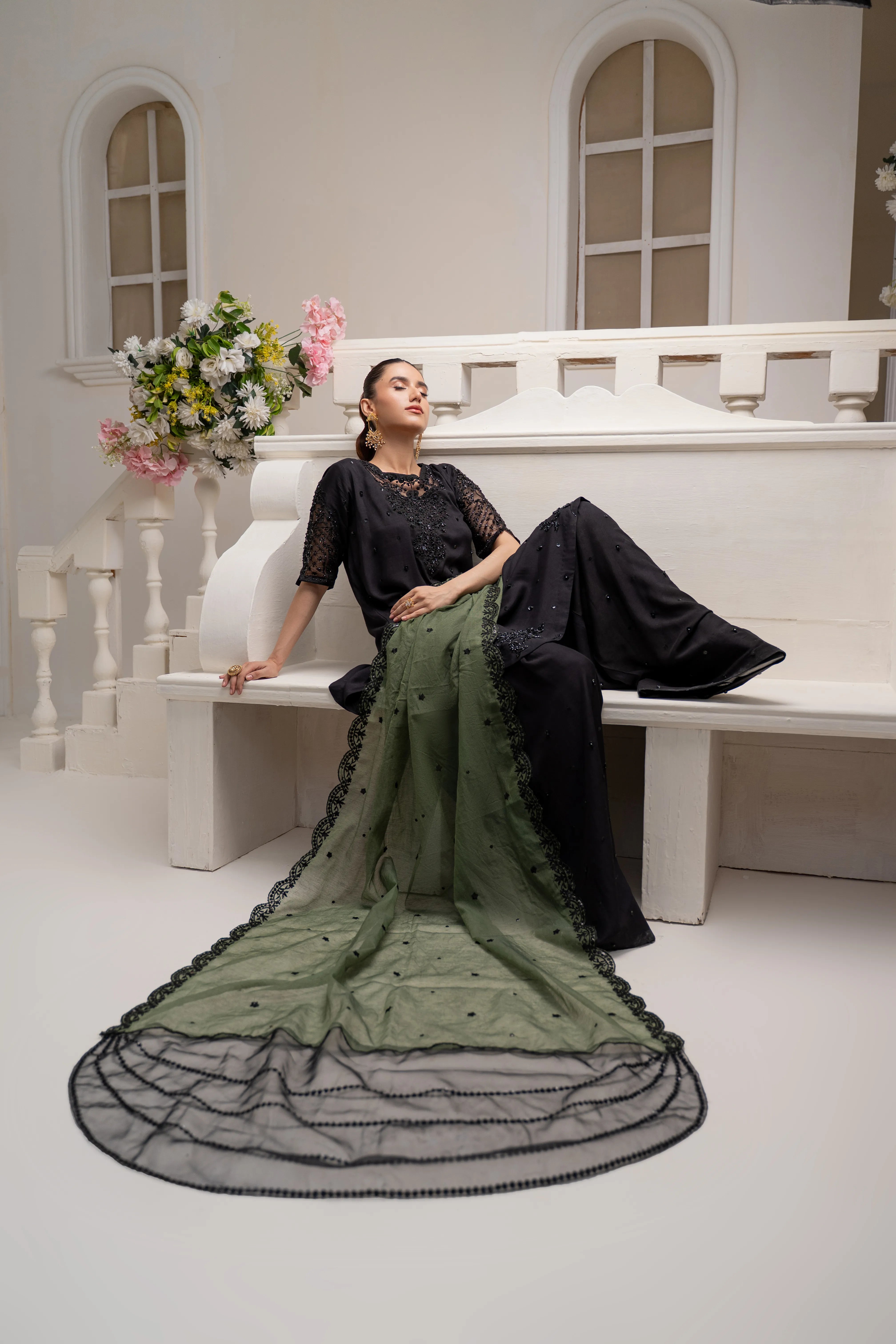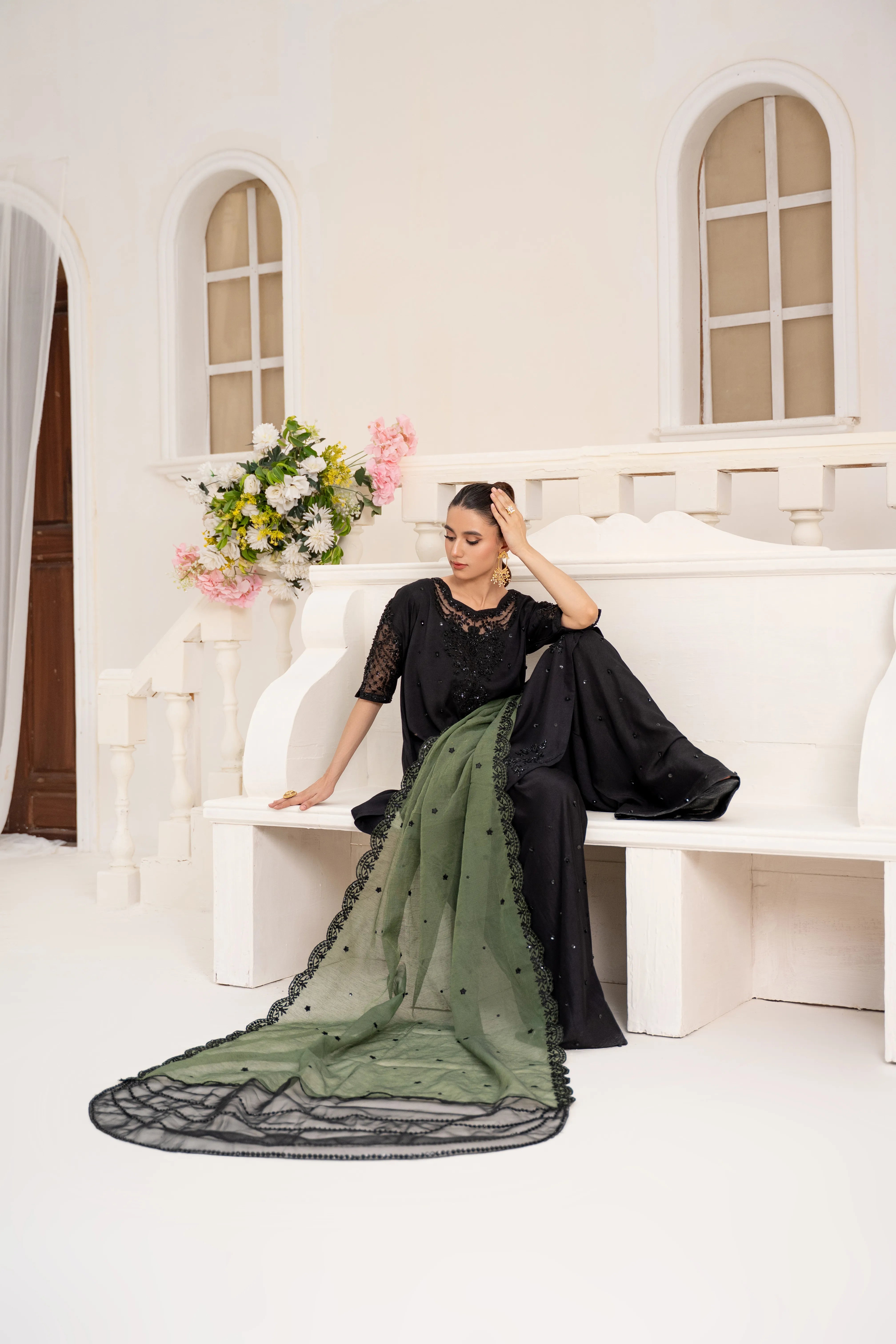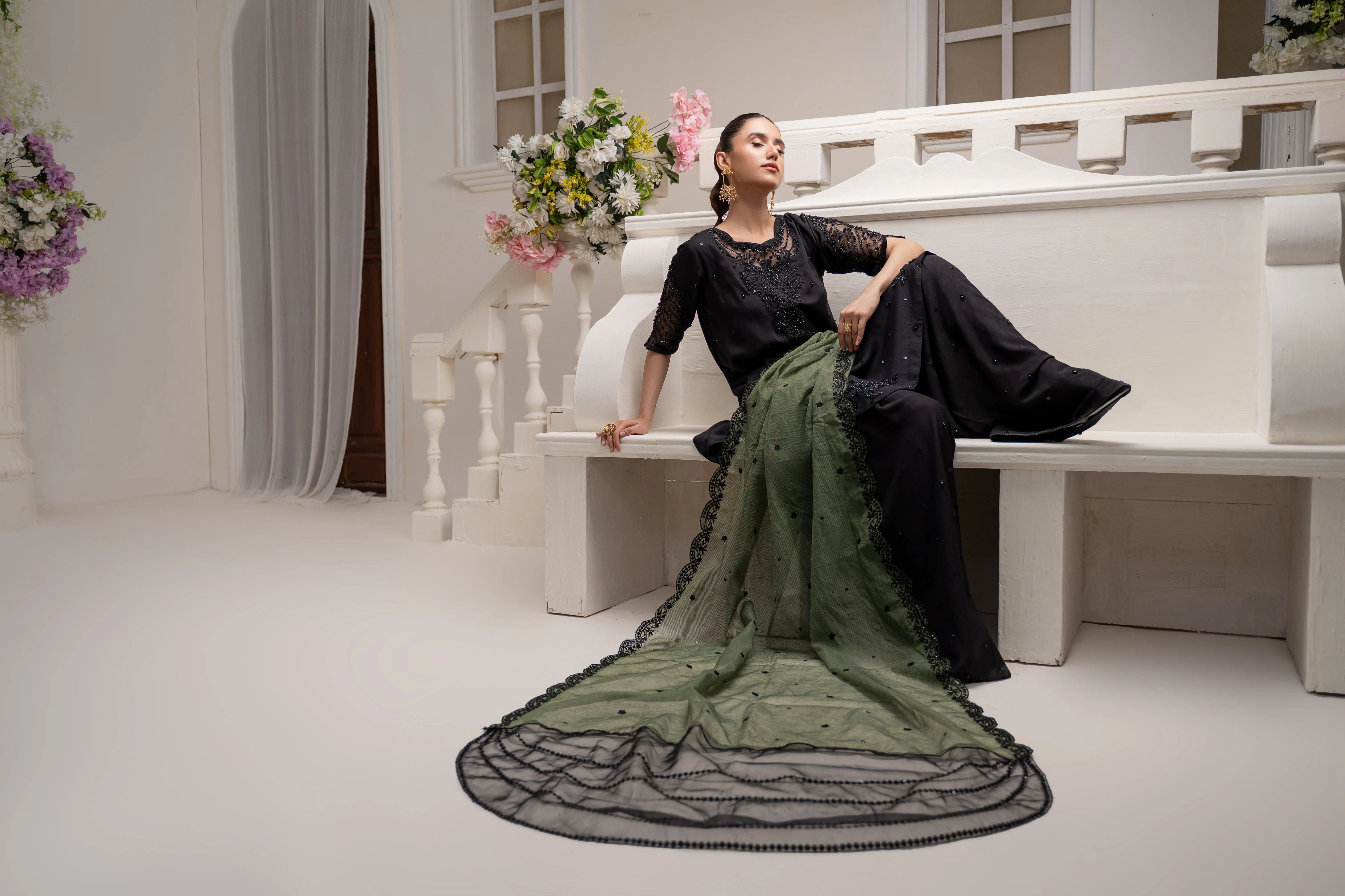 Minha - Eid Festive: The ensemble features a Black round Daman black short length pure sheesha silk tunic with short cutwork sleeves embellished with all black organza, thread, sequins and Swarovski hand embroidery. Paired with contrasting forest green Khaddi line silk dupatta embellished with black cutwork thread, sequins and Swarovski embroidery finished with black organza round hand embroidered edges. Paired up with a matching pure Sheesha rawsilk wide leg shalwar to create an elegant and timeless look.