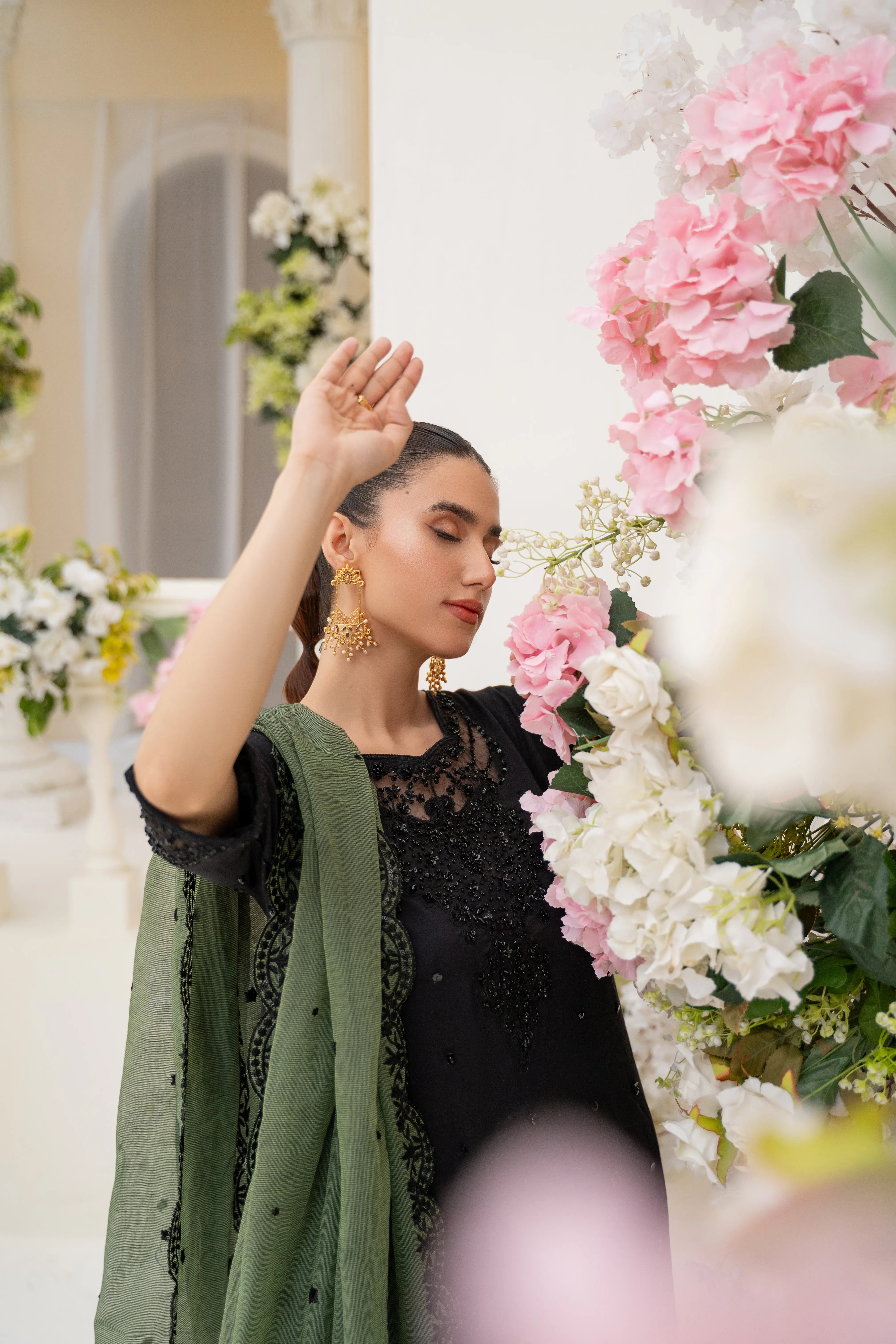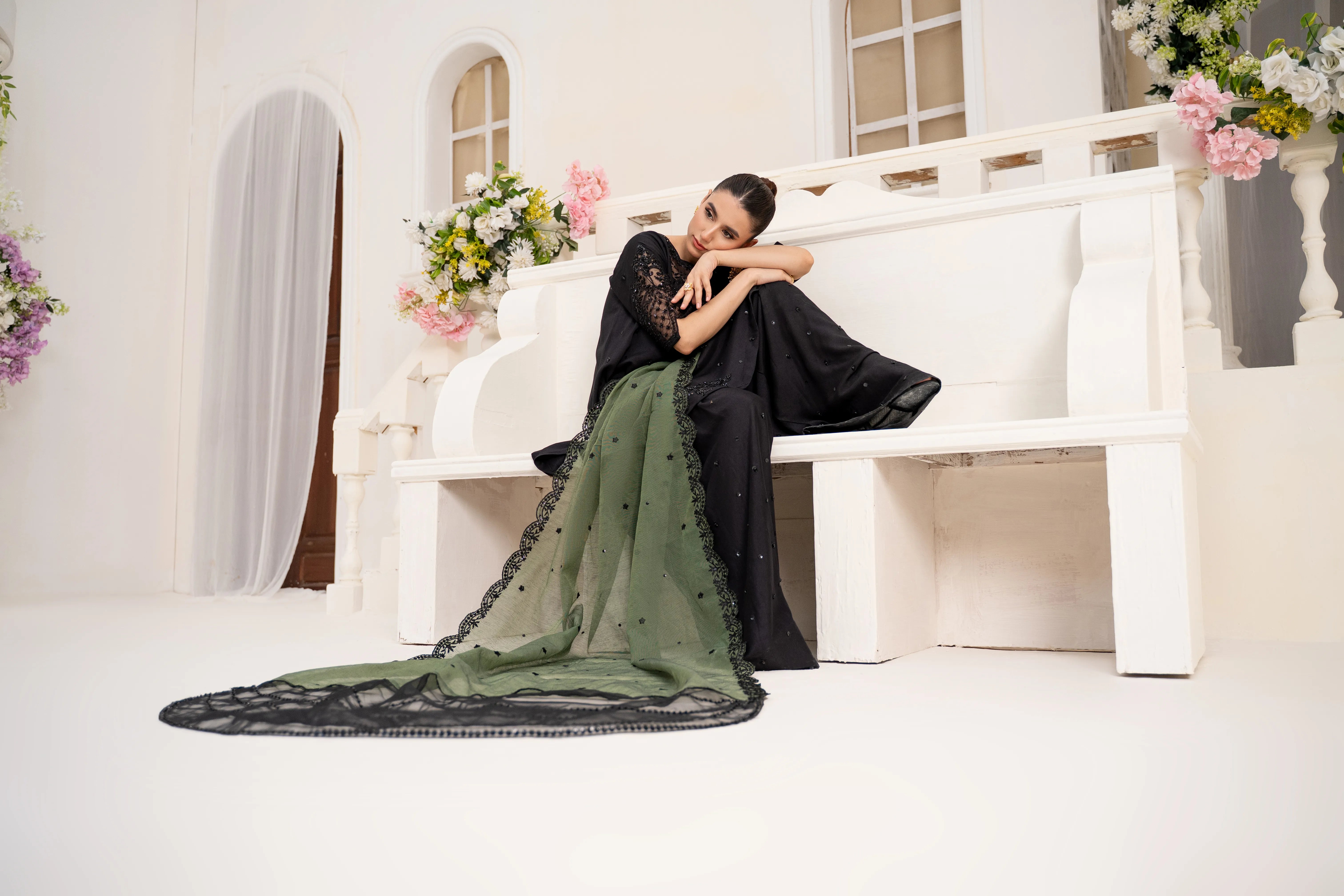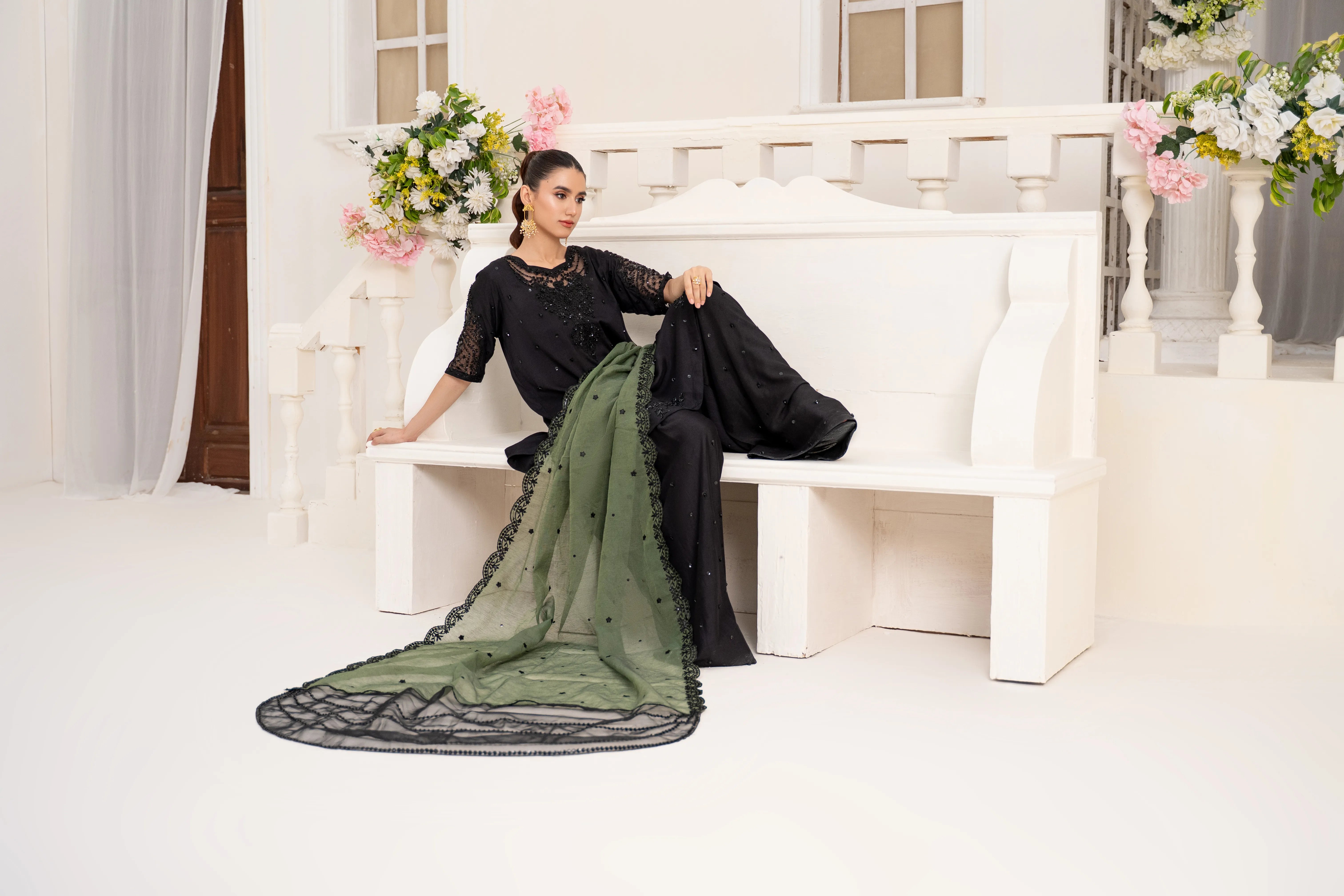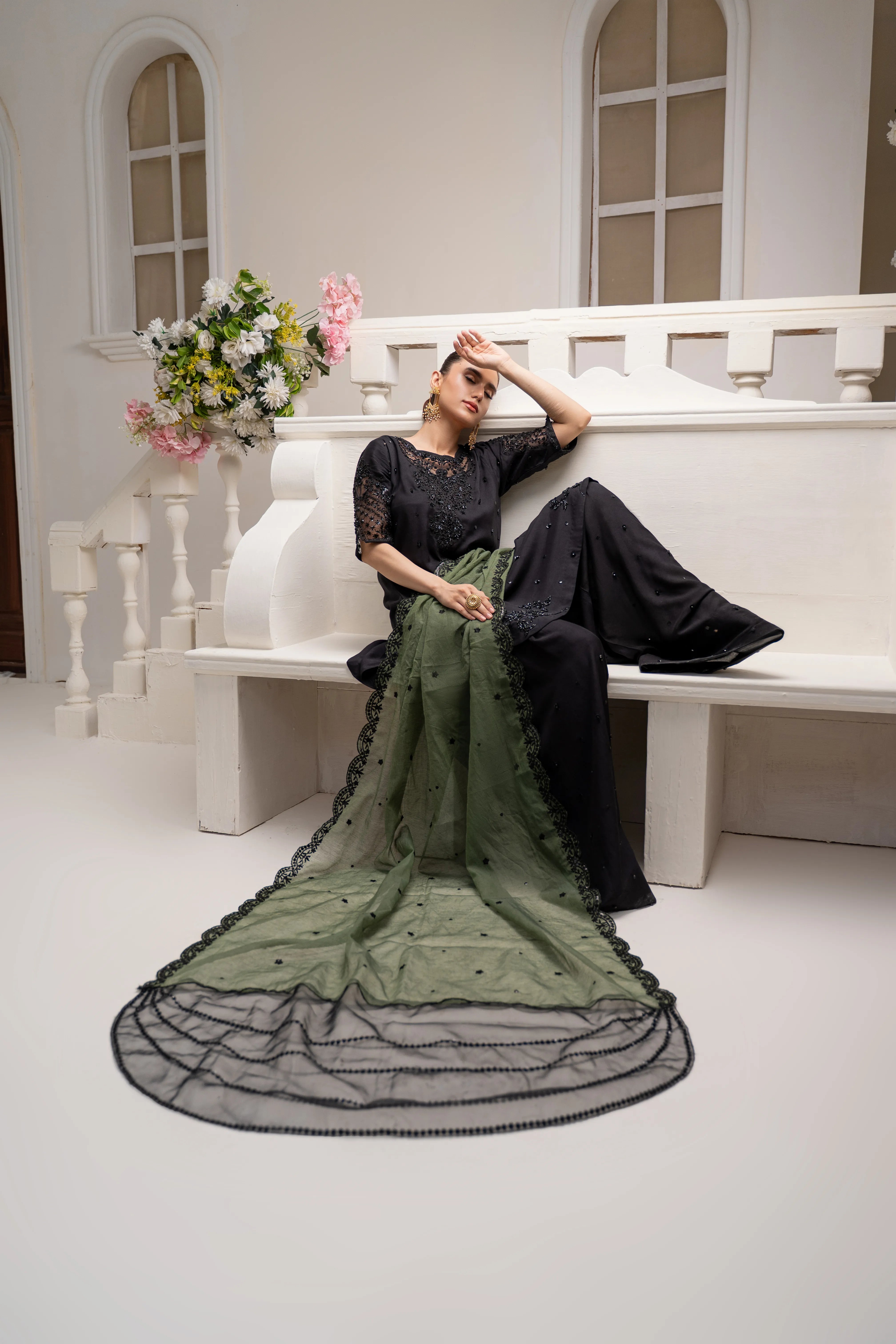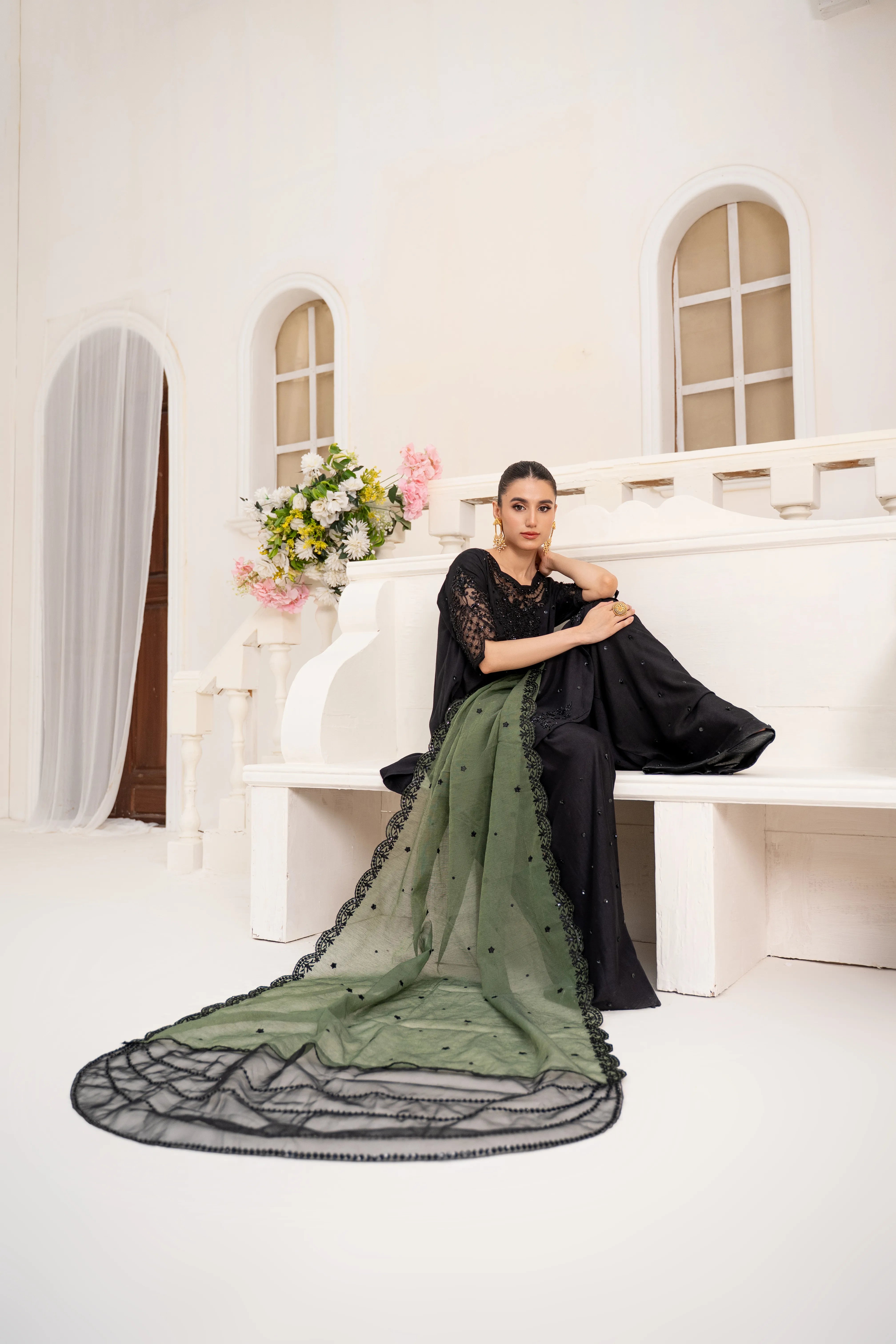 Minha - Eid Festive: The ensemble features a Black round Daman black short length pure sheesha silk tunic with short cutwork sleeves embellished with all black organza, thread, sequins and Swarovski hand embroidery. Paired with contrasting forest green Khaddi line silk dupatta embellished with black cutwork thread, sequins and Swarovski embroidery finished with black organza round hand embroidered edges. Paired up with a matching pure Sheesha rawsilk wide leg shalwar to create an elegant and timeless look.