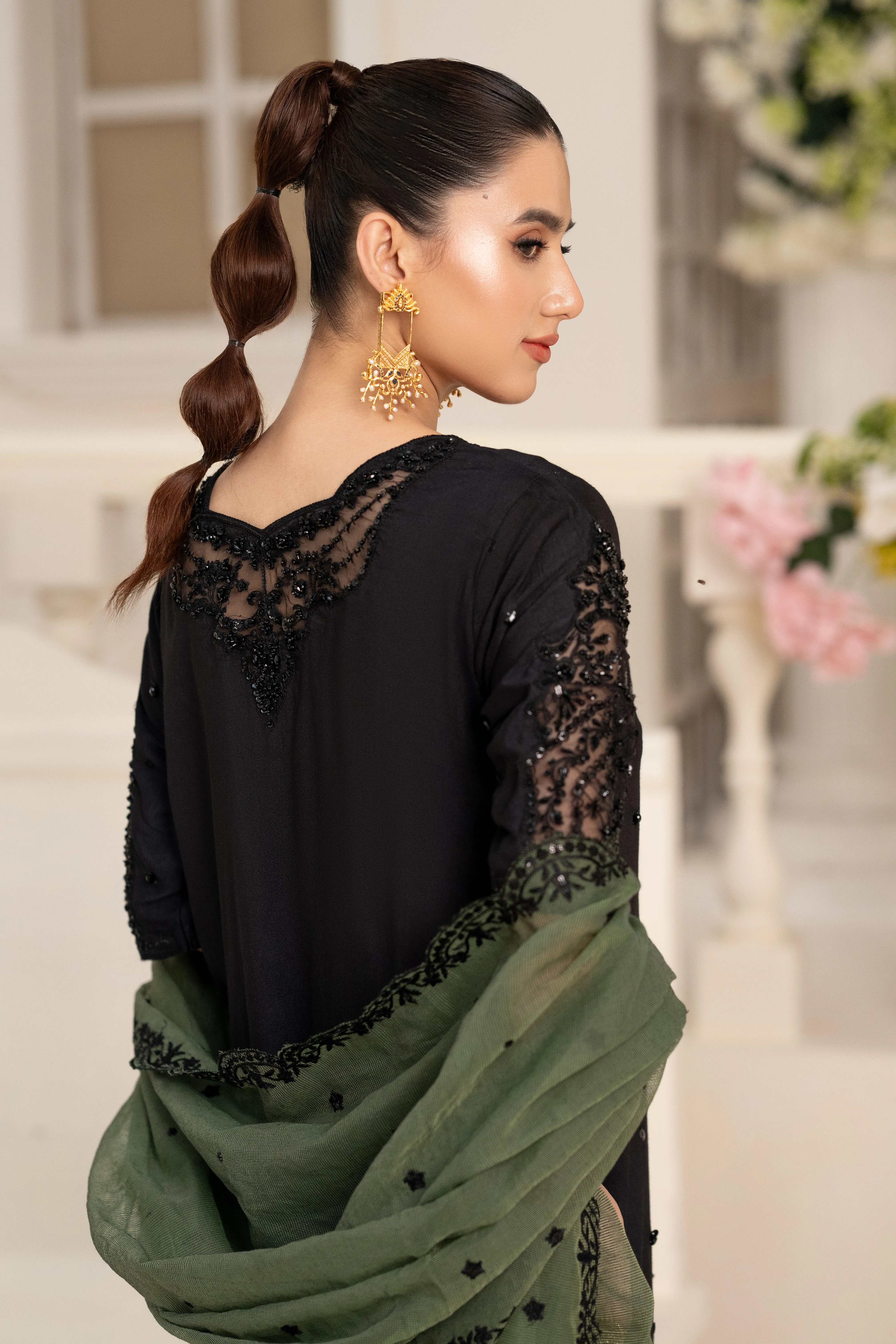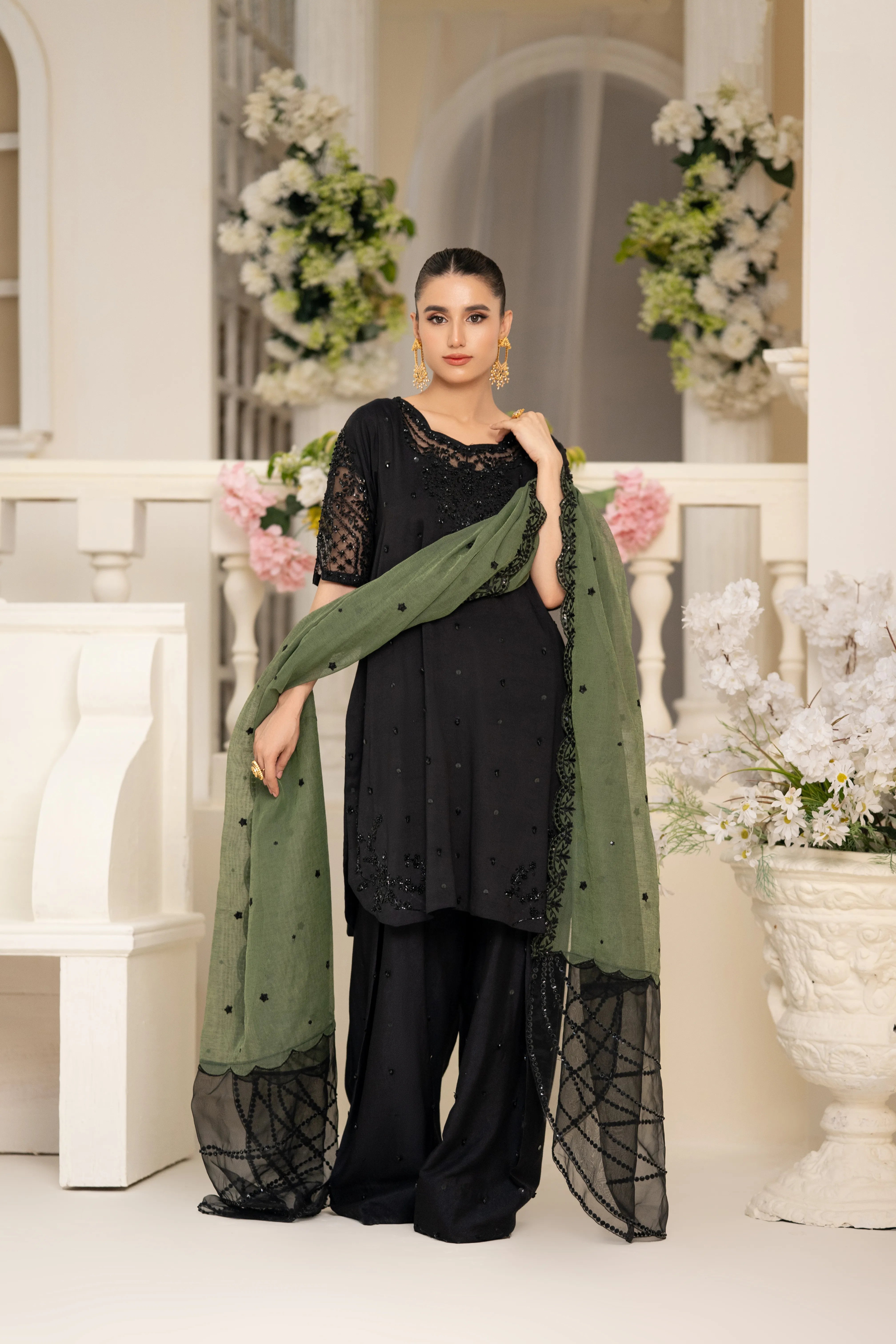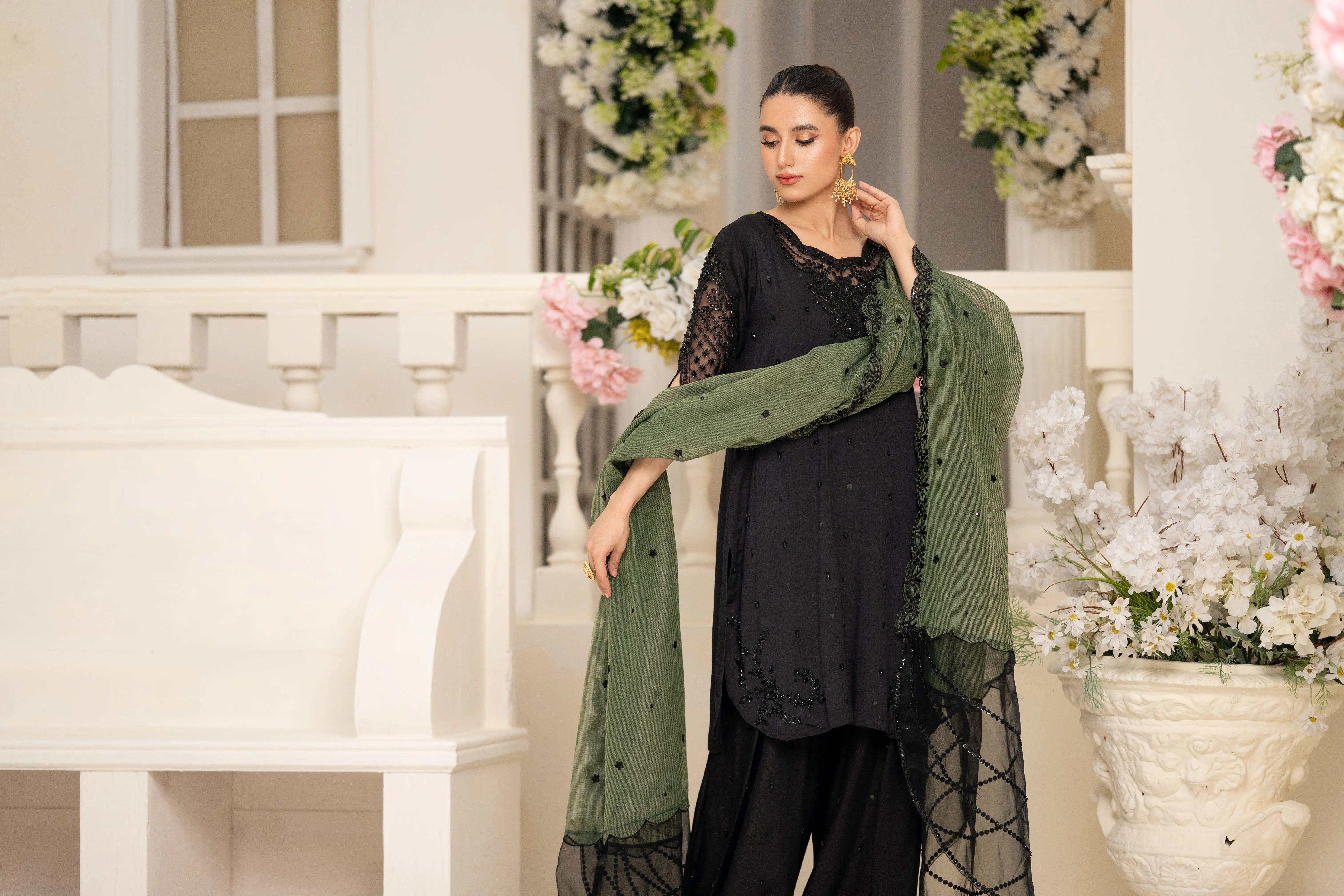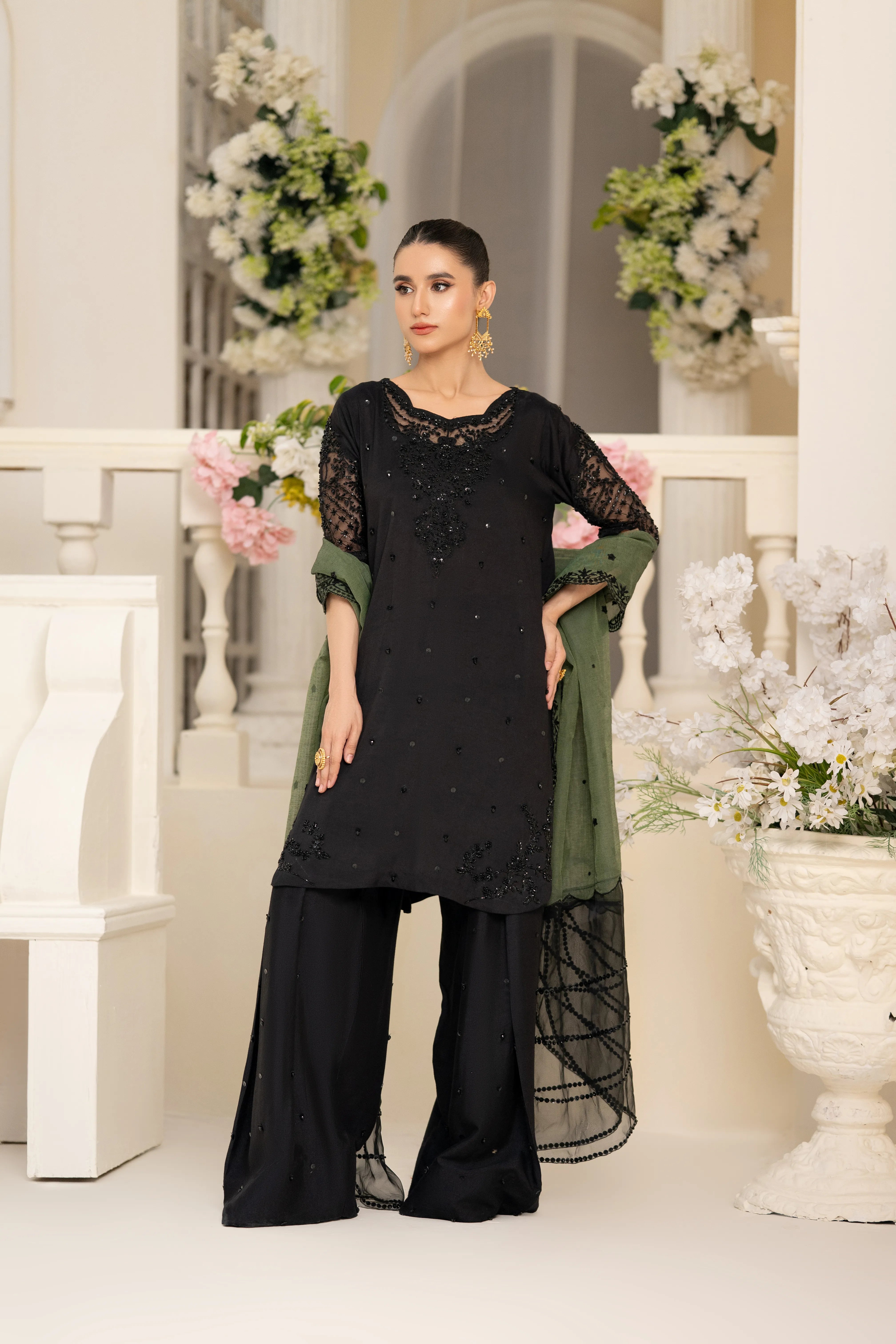 Minha - Eid Festive: The ensemble features a Black round Daman black short length pure sheesha silk tunic with short cutwork sleeves embellished with all black organza, thread, sequins and Swarovski hand embroidery. Paired with contrasting forest green Khaddi line silk dupatta embellished with black cutwork thread, sequins and Swarovski embroidery finished with black organza round hand embroidered edges. Paired up with a matching pure Sheesha rawsilk wide leg shalwar to create an elegant and timeless look.