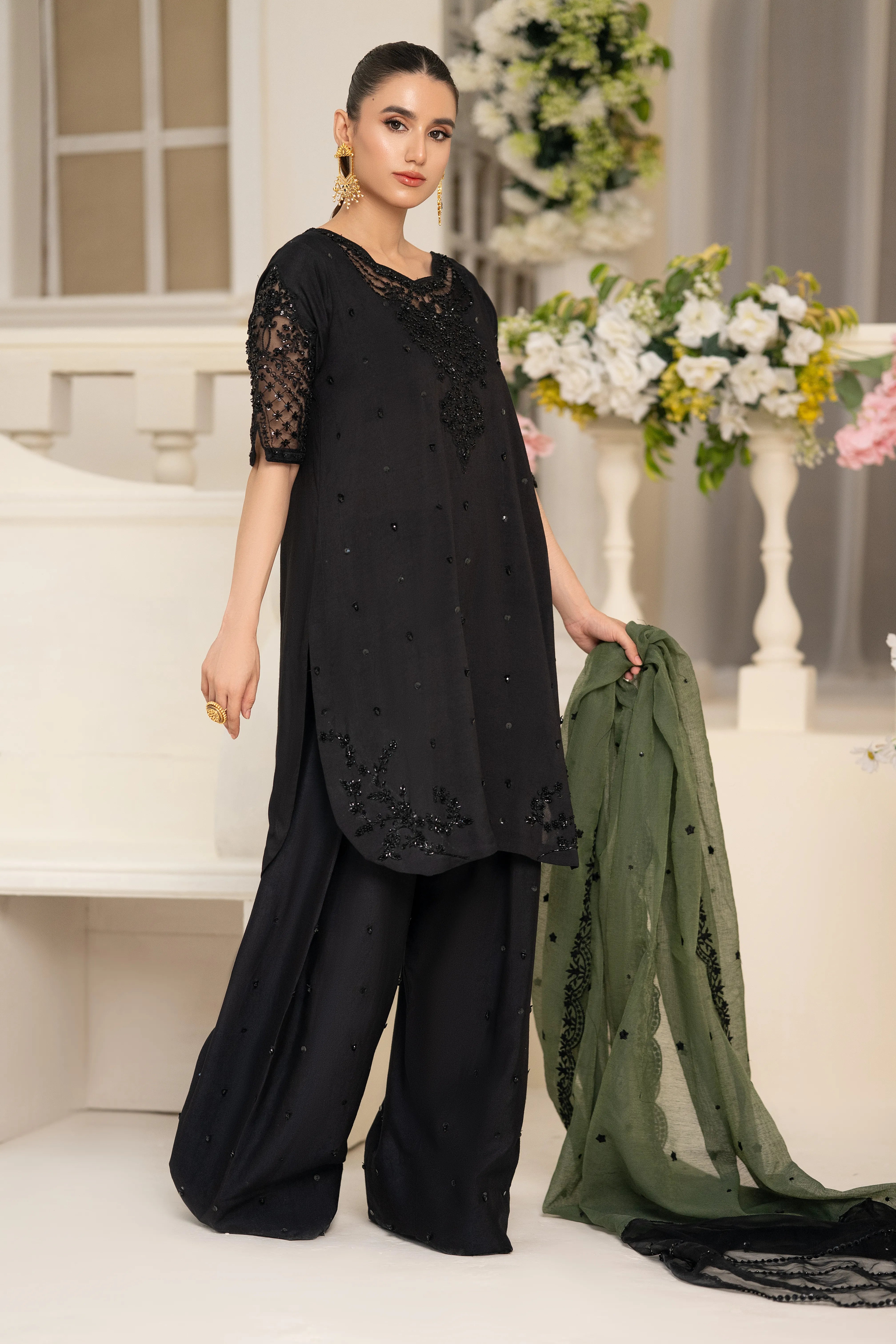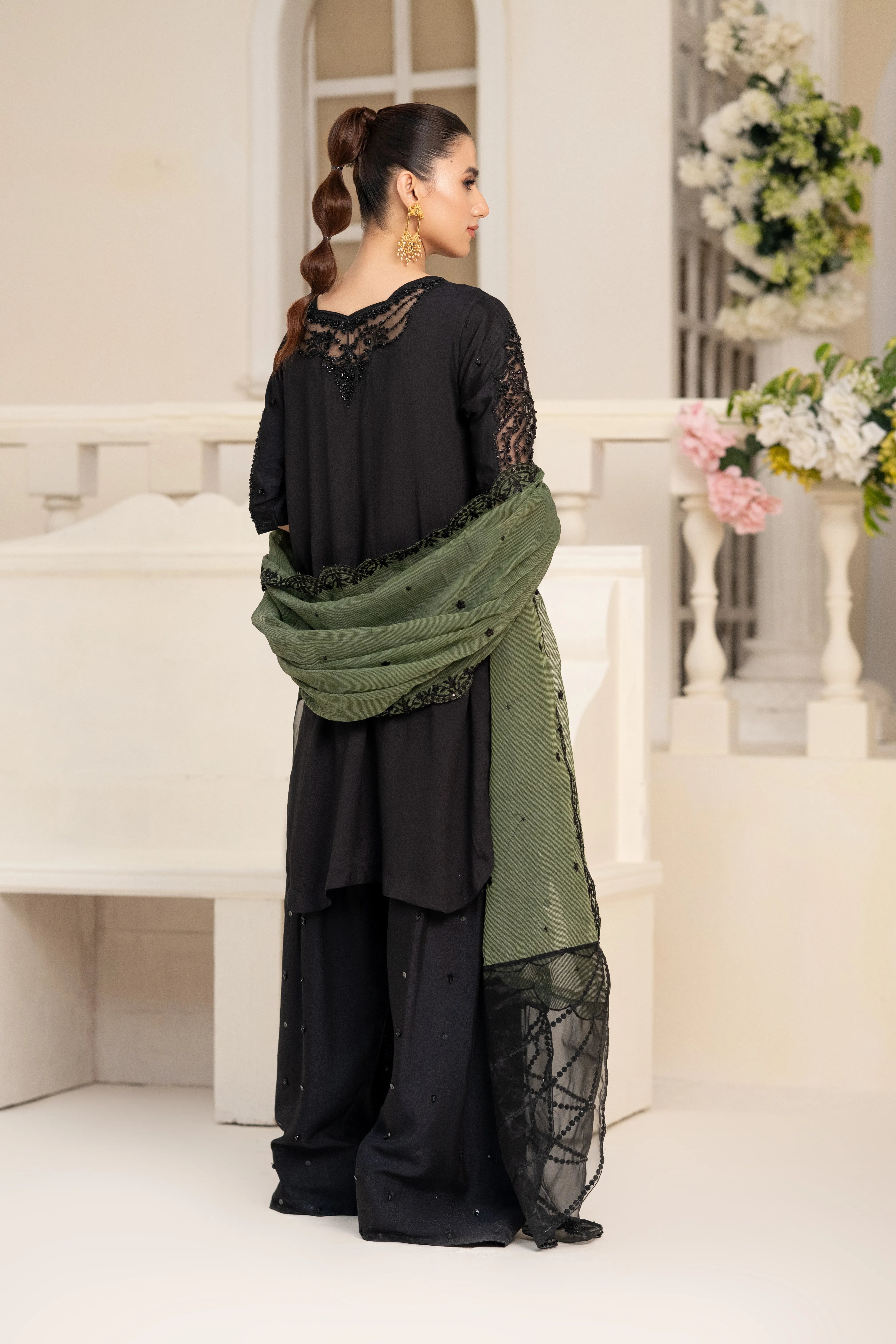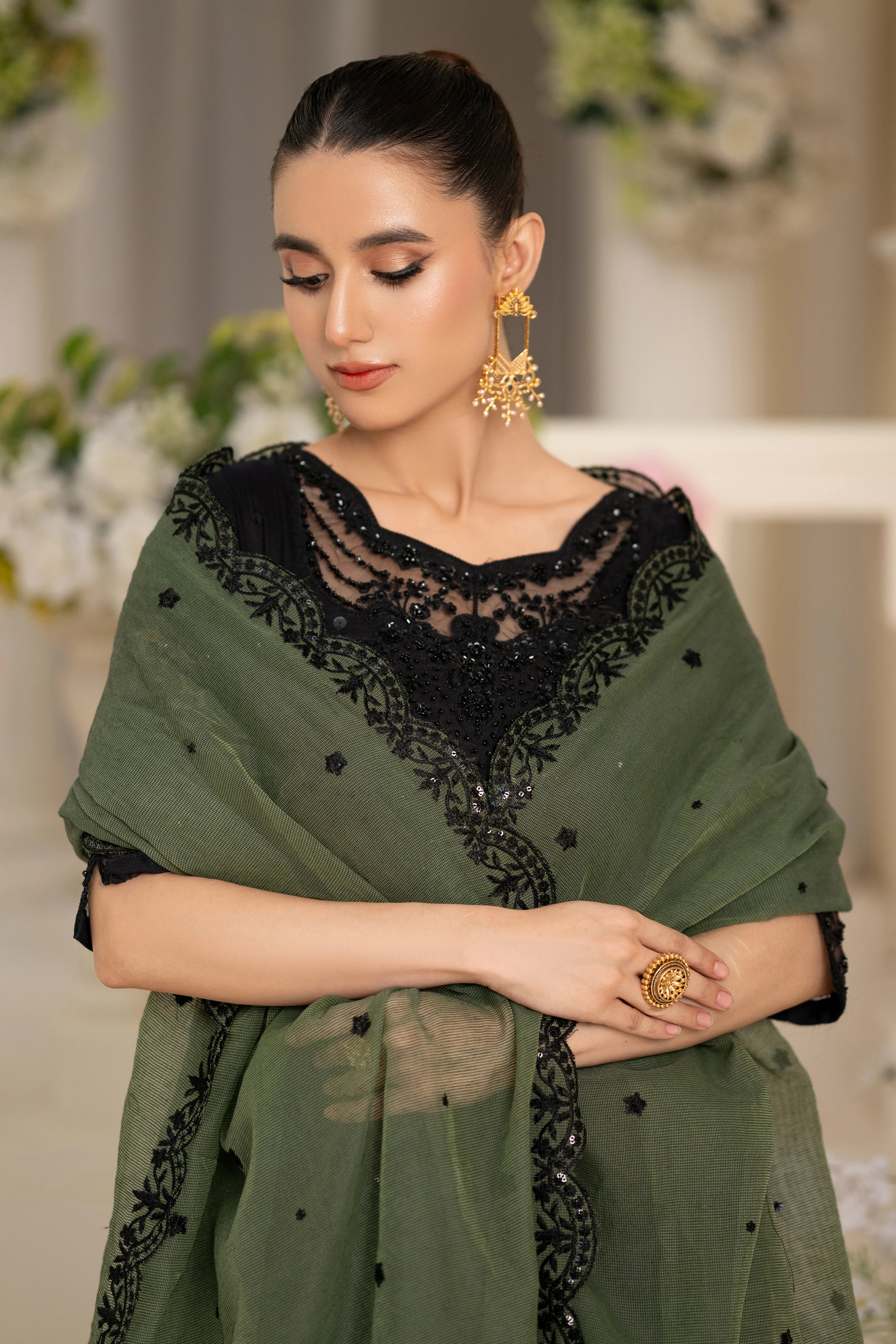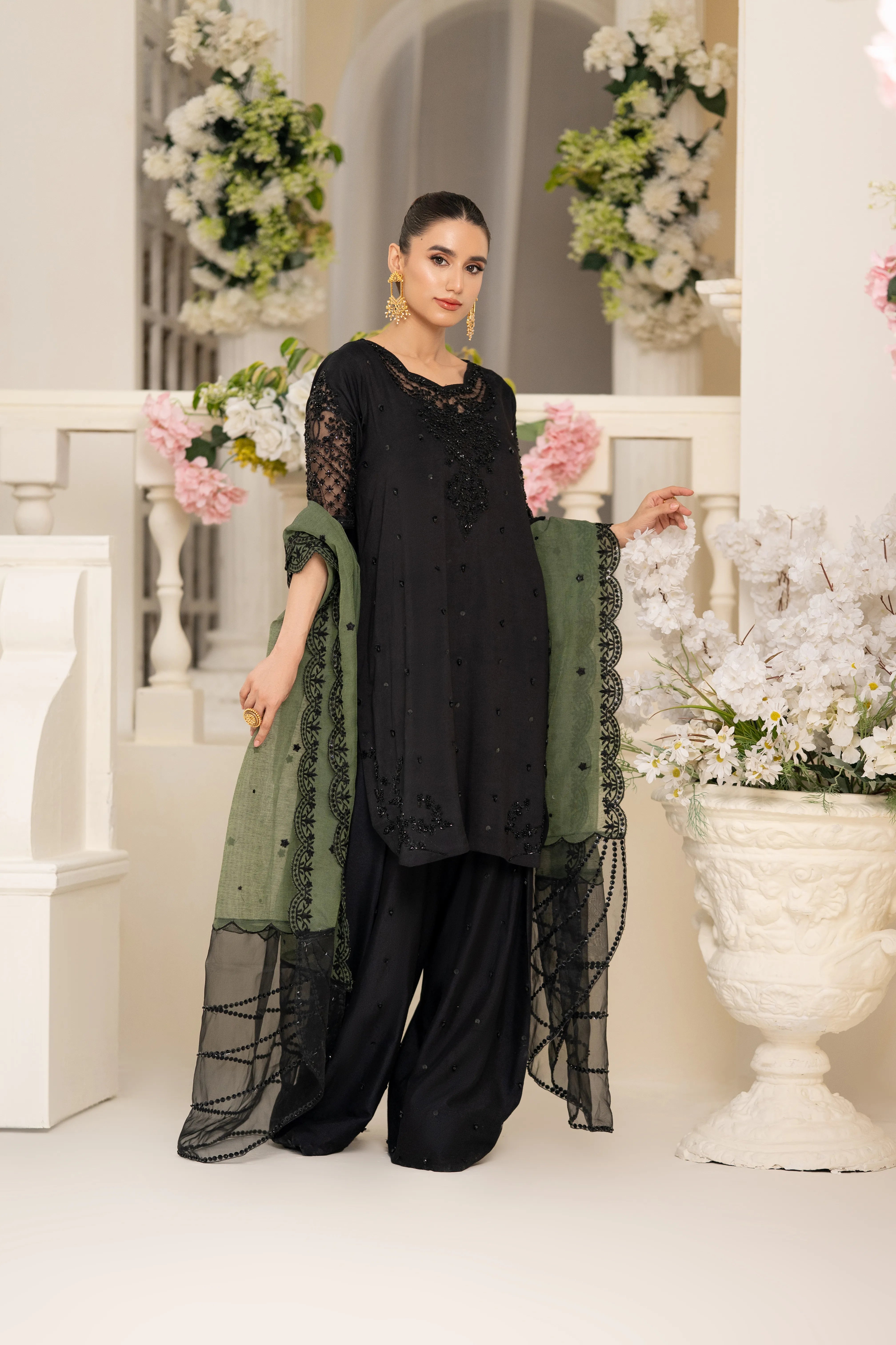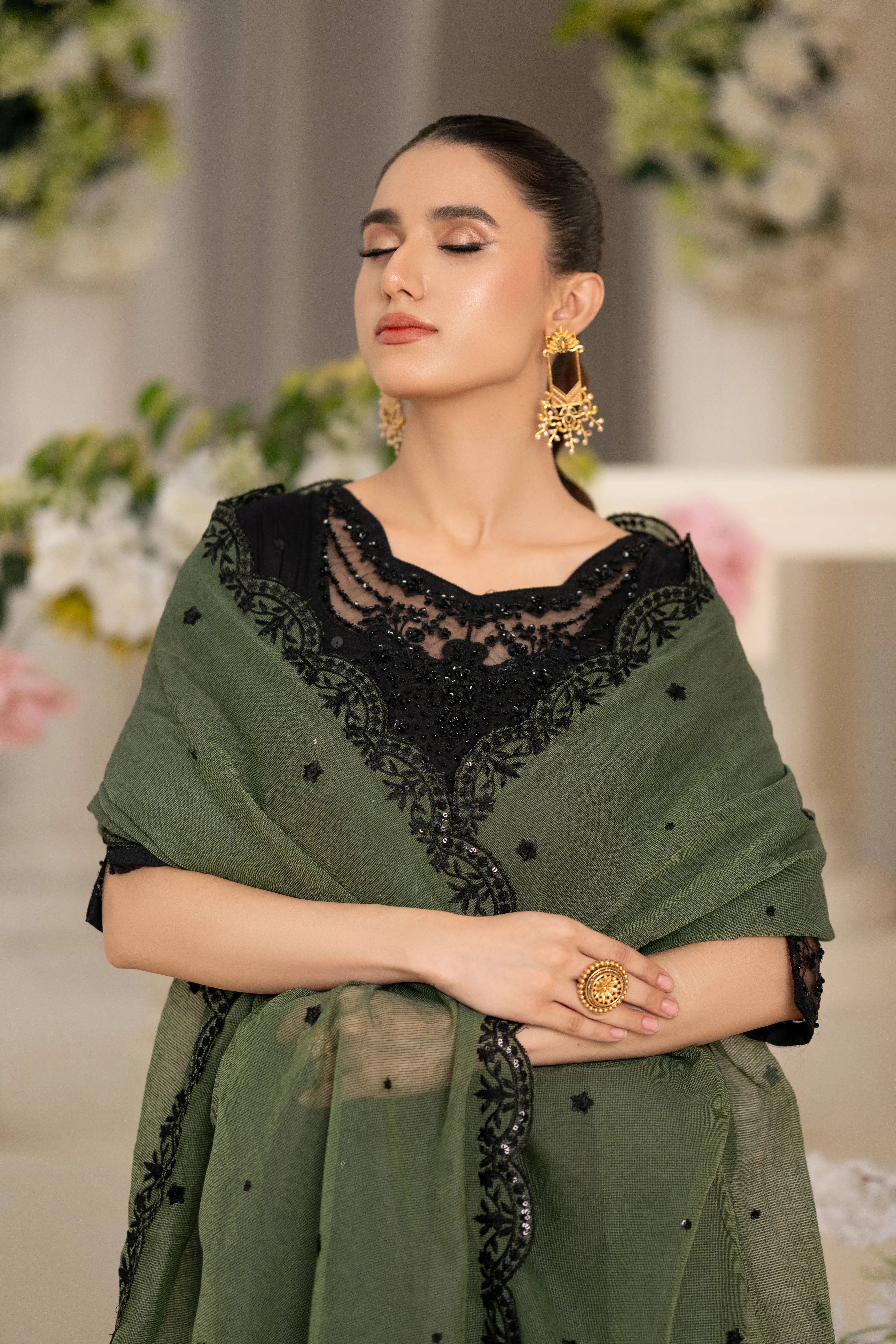 Minha - Eid Festive: The ensemble features a Black round Daman black short length pure sheesha silk tunic with short cutwork sleeves embellished with all black organza, thread, sequins and Swarovski hand embroidery. Paired with contrasting forest green Khaddi line silk dupatta embellished with black cutwork thread, sequins and Swarovski embroidery finished with black organza round hand embroidered edges. Paired up with a matching pure Sheesha rawsilk wide leg shalwar to create an elegant and timeless look.