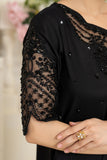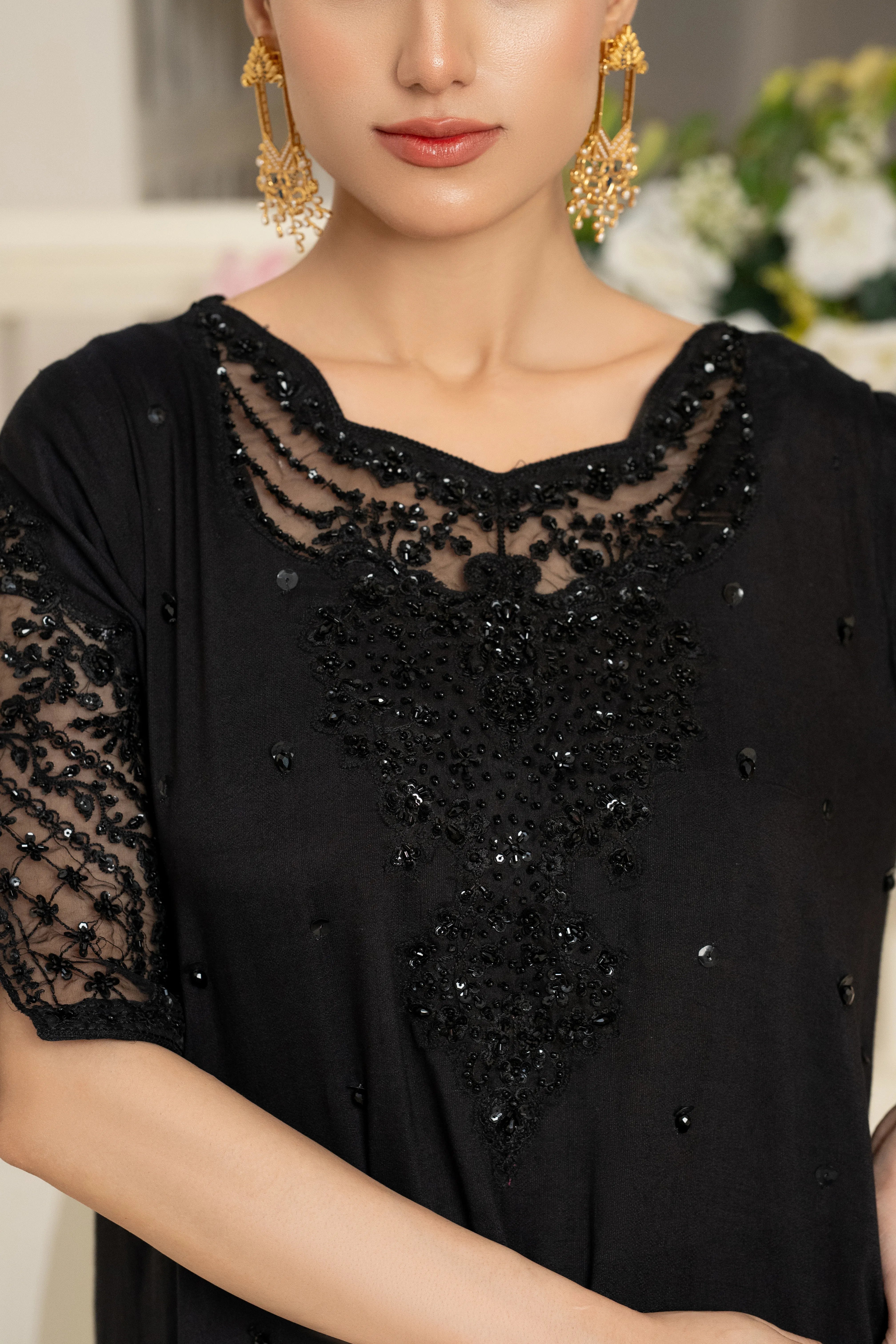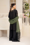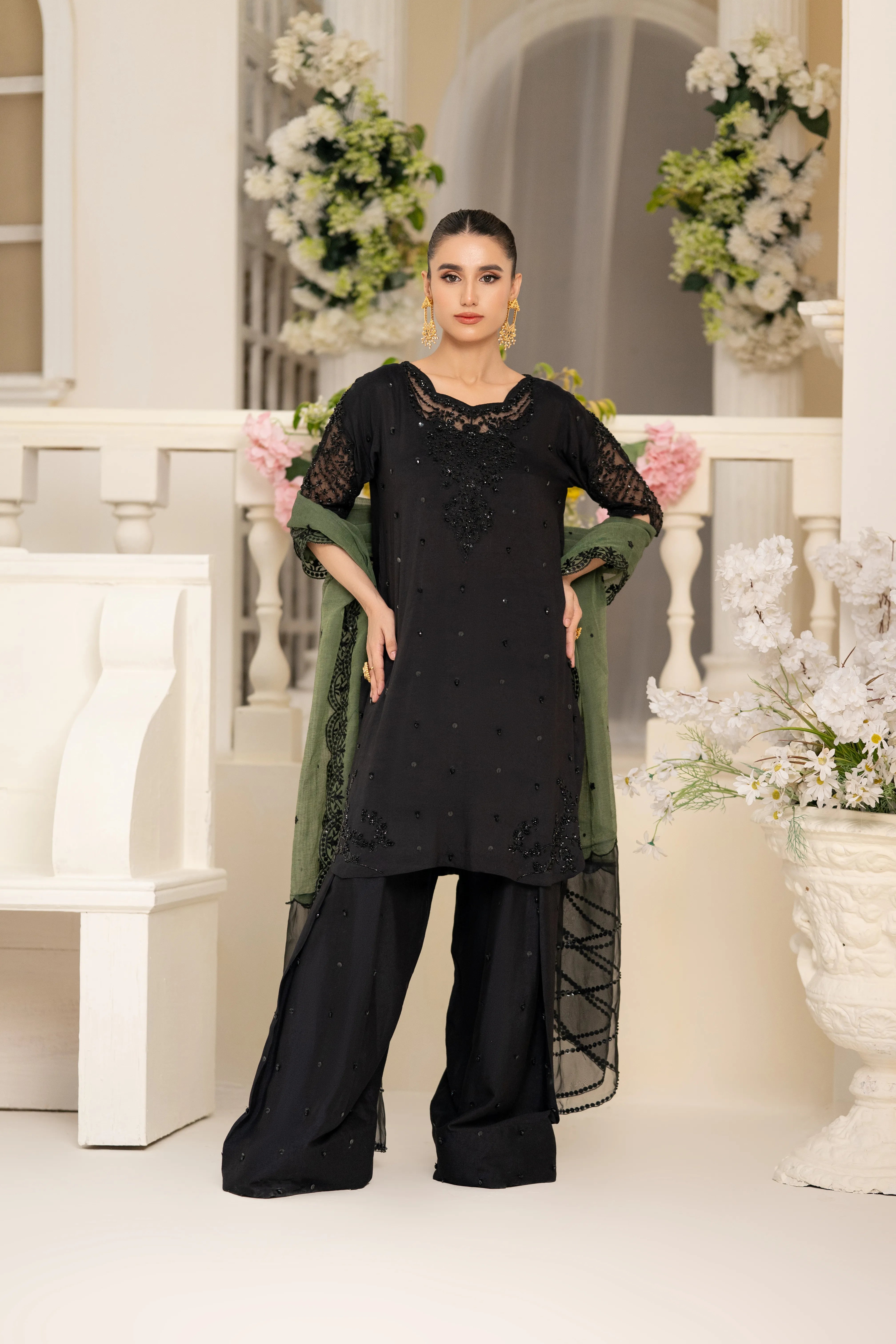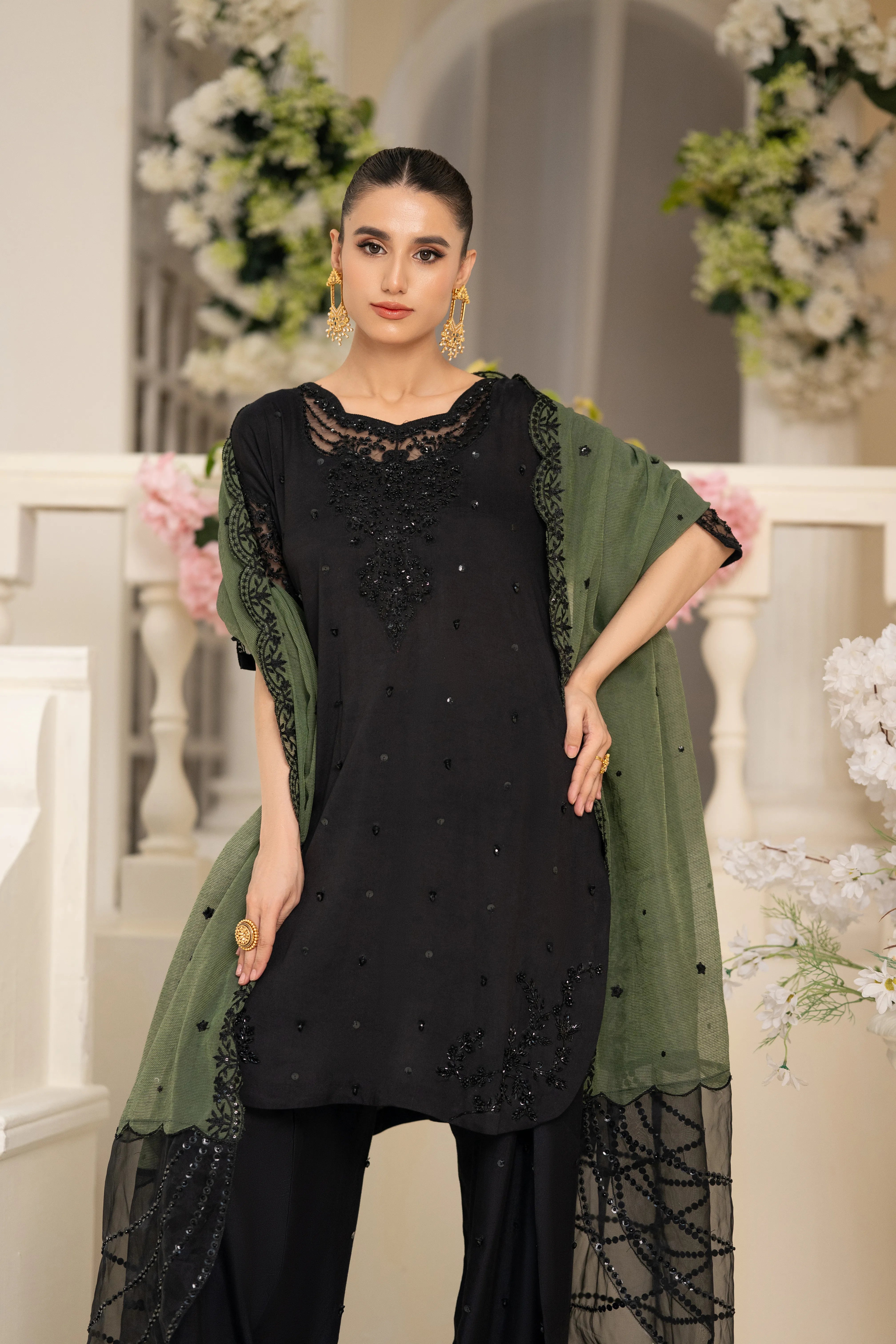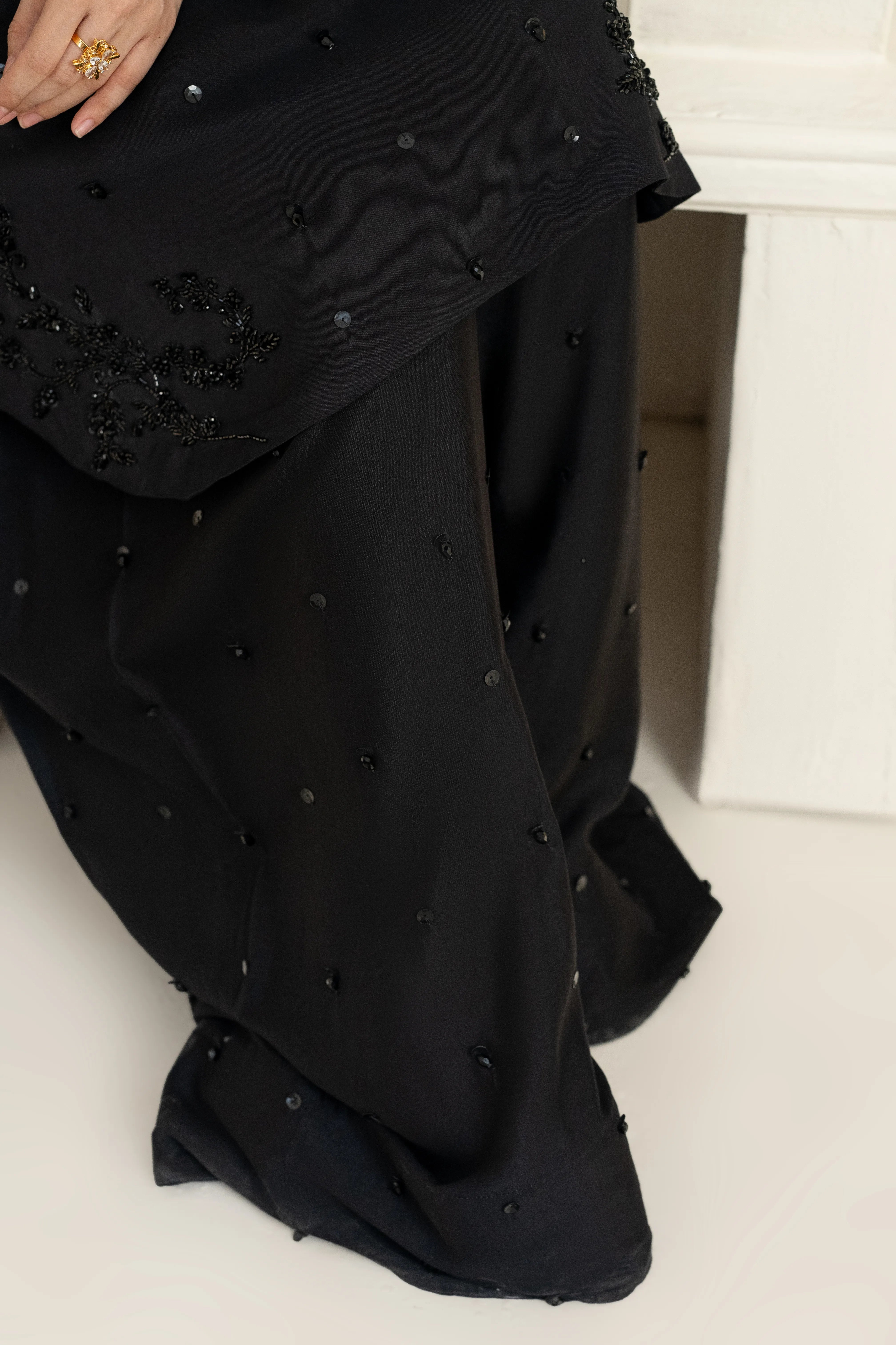 Minha - Eid Festive: The ensemble features a Black round Daman black short length pure sheesha silk tunic with short cutwork sleeves embellished with all black organza, thread, sequins and Swarovski hand embroidery. Paired with contrasting forest green Khaddi line silk dupatta embellished with black cutwork thread, sequins and Swarovski embroidery finished with black organza round hand embroidered edges. Paired up with a matching pure Sheesha rawsilk wide leg shalwar to create an elegant and timeless look.