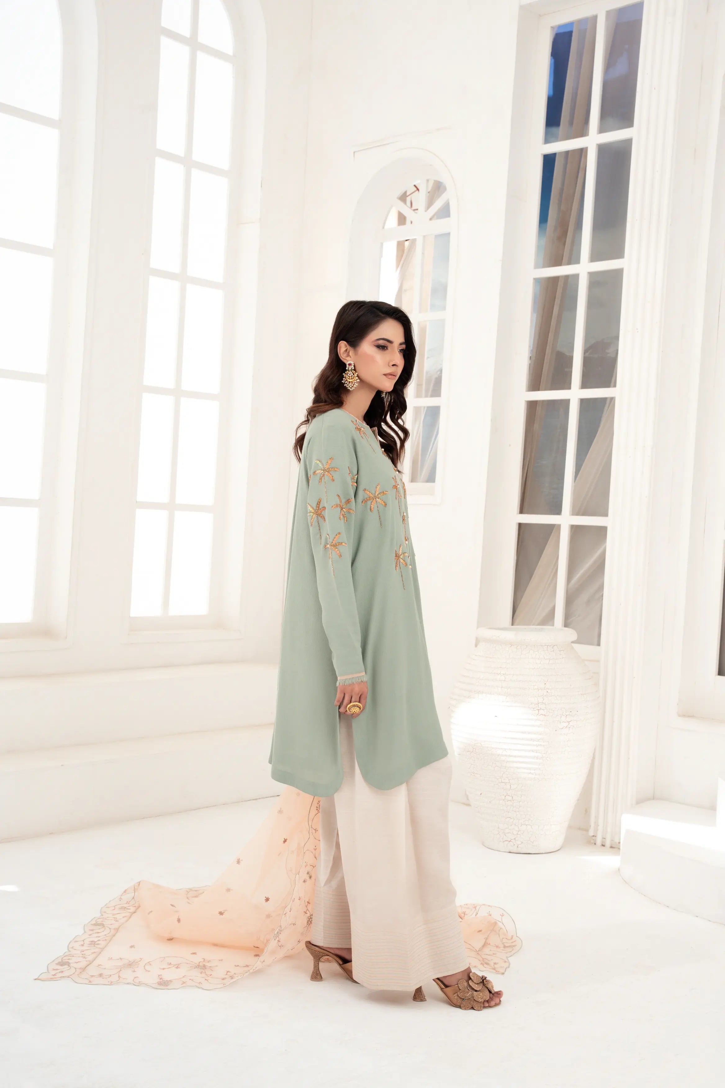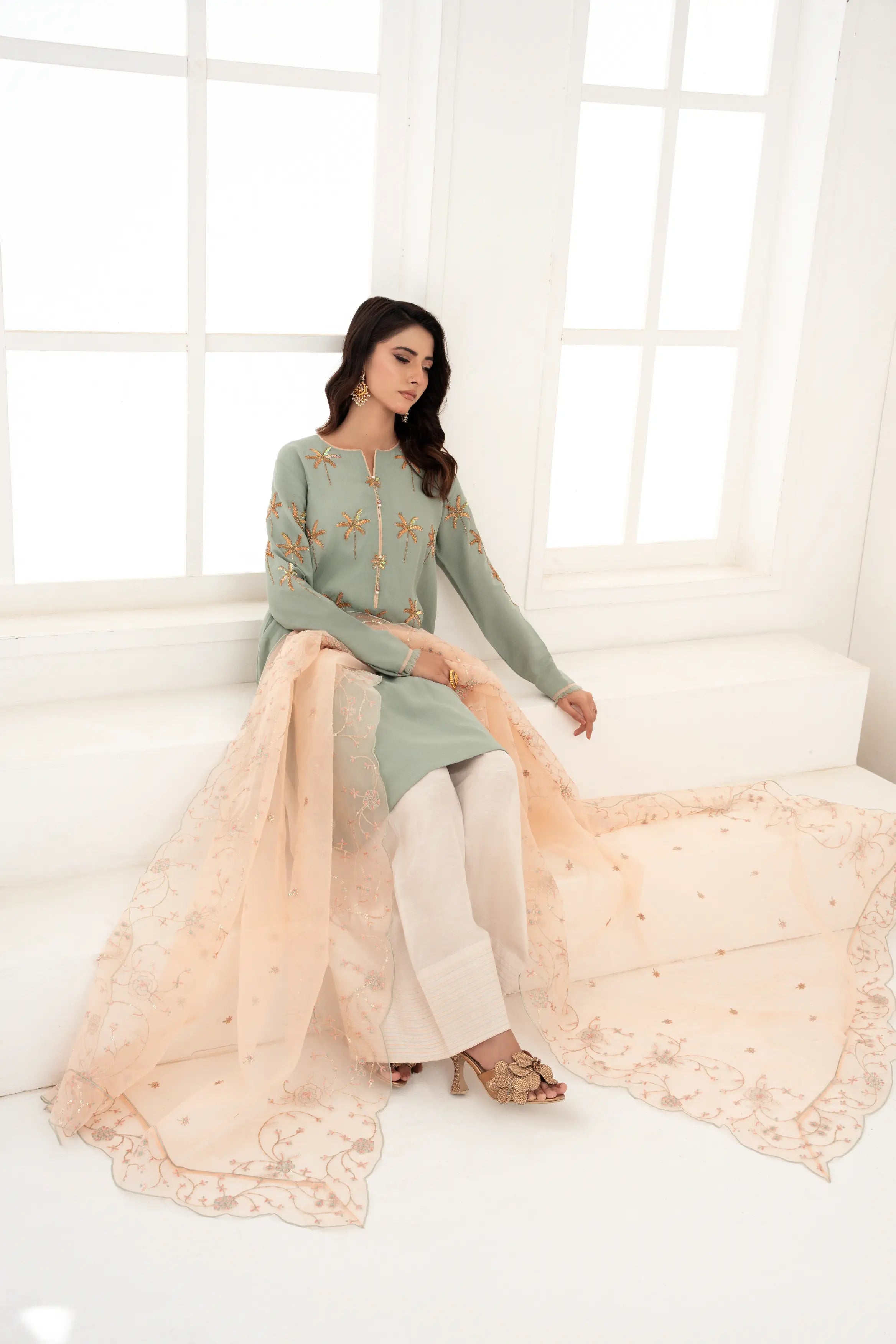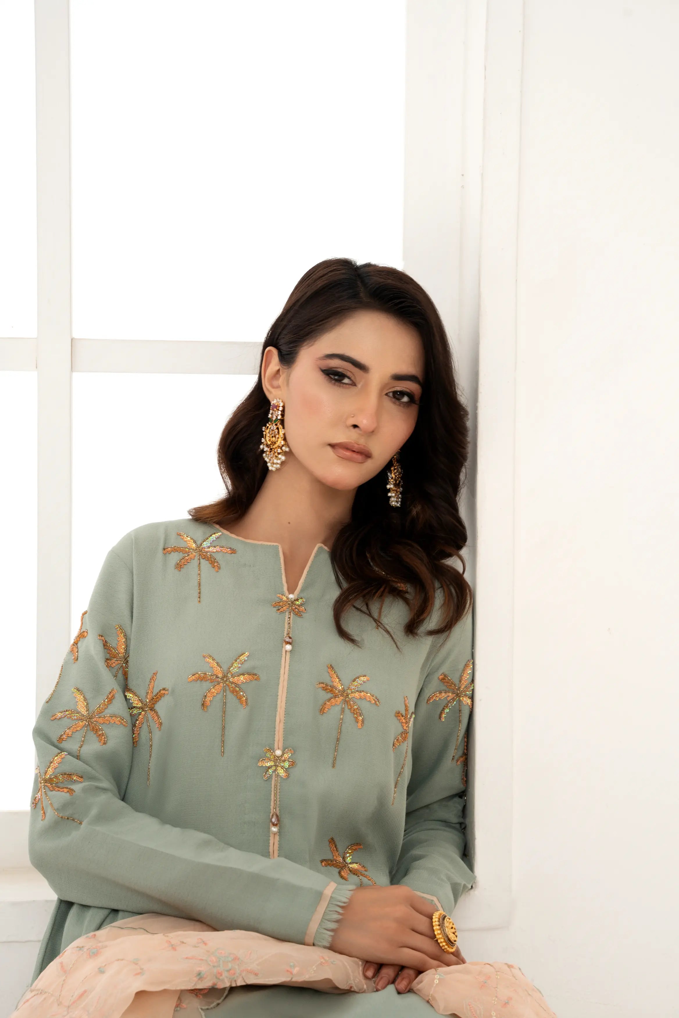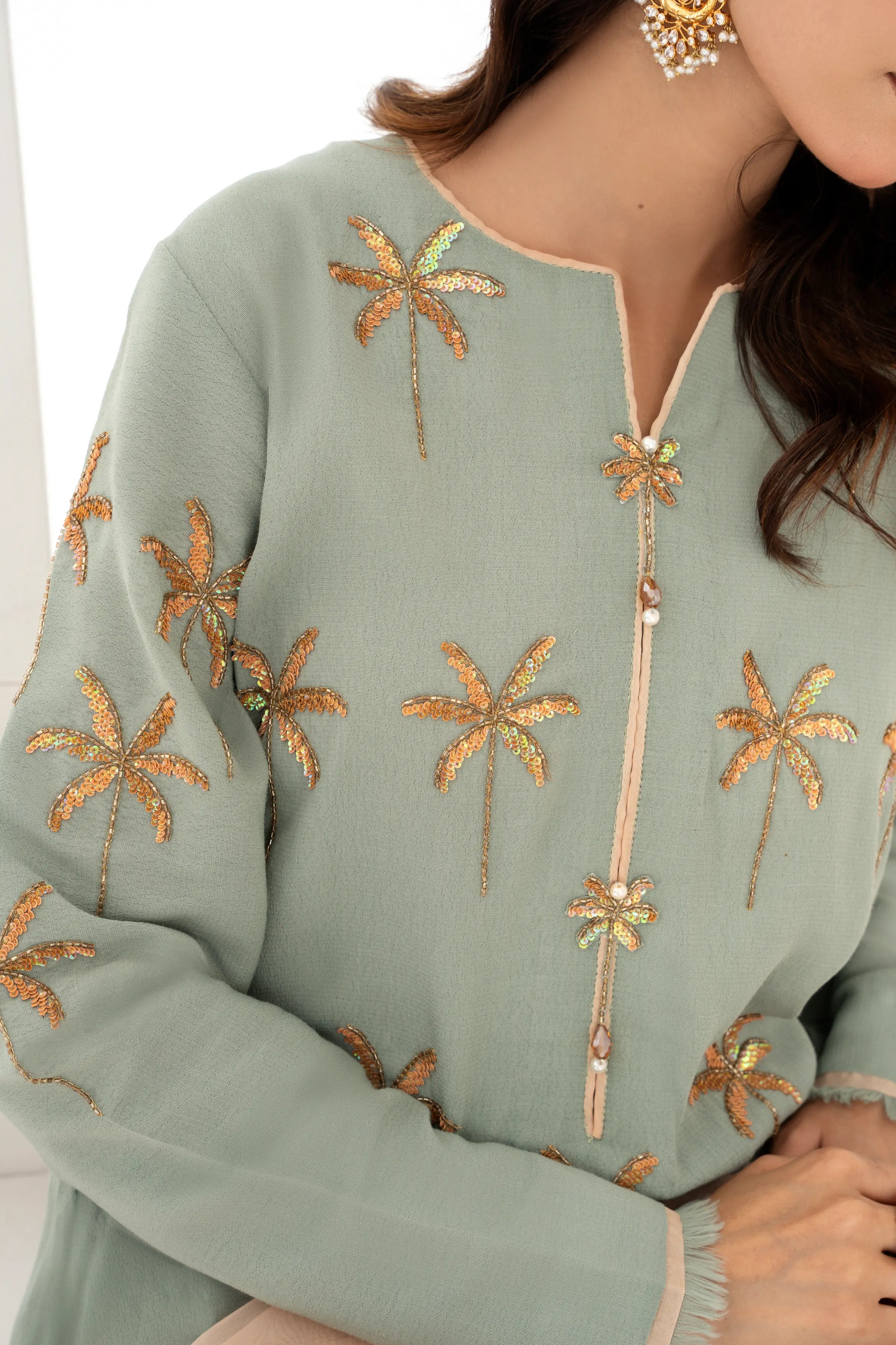 FLORA & FAUNA - Eid Festive: A dusty mint crepe georgette mid length round neck shirt features contrasting peach kaat dana and sequins hand embroidery of palm trees. Peach organza, pearls and beads finishing on the neckline. Fitted sleeves embellished with hand embroidery, peach organza and frayed edges finishing. Paired with cream bamboo raw silk wide leg shalwar finished with contrasting running stitches. Organza dupatta adorned with thread and sequins embroidery.