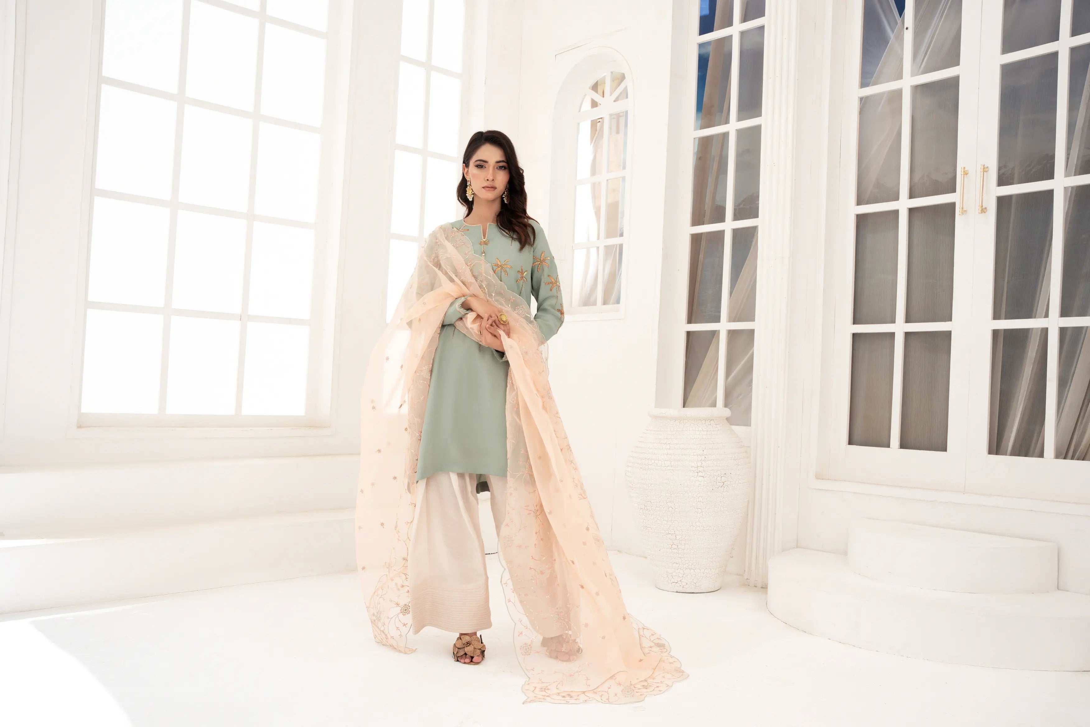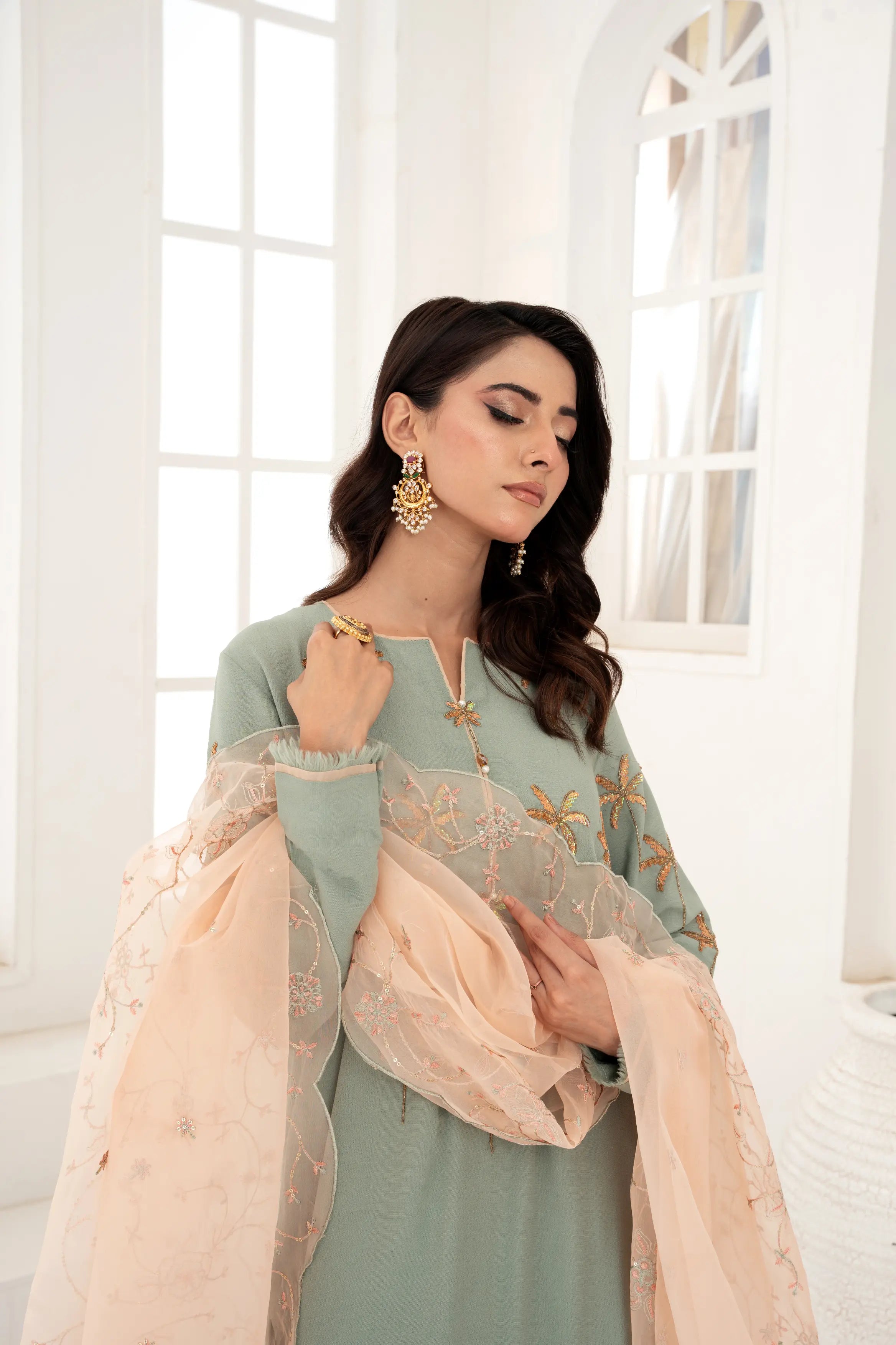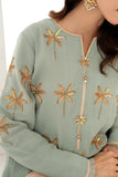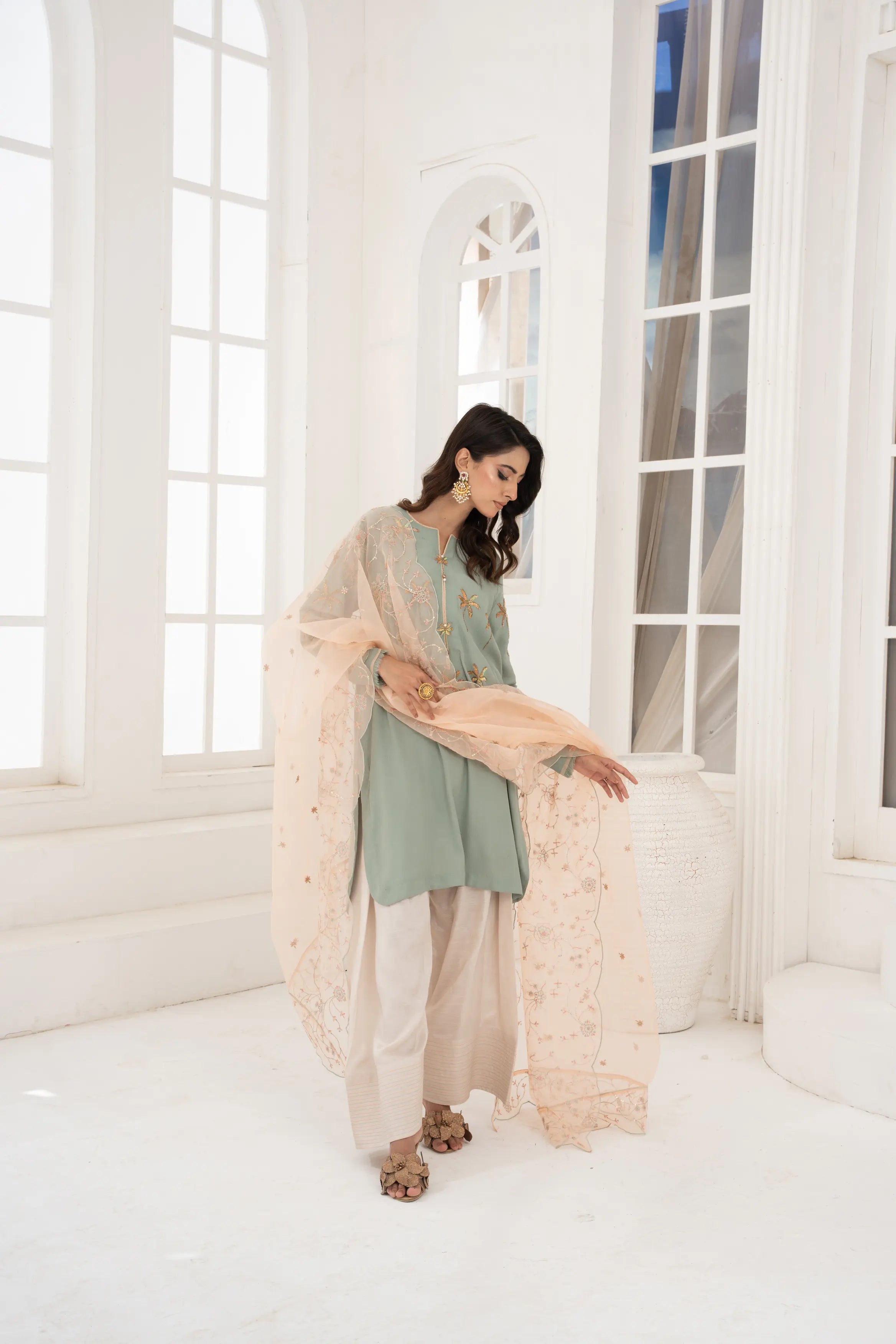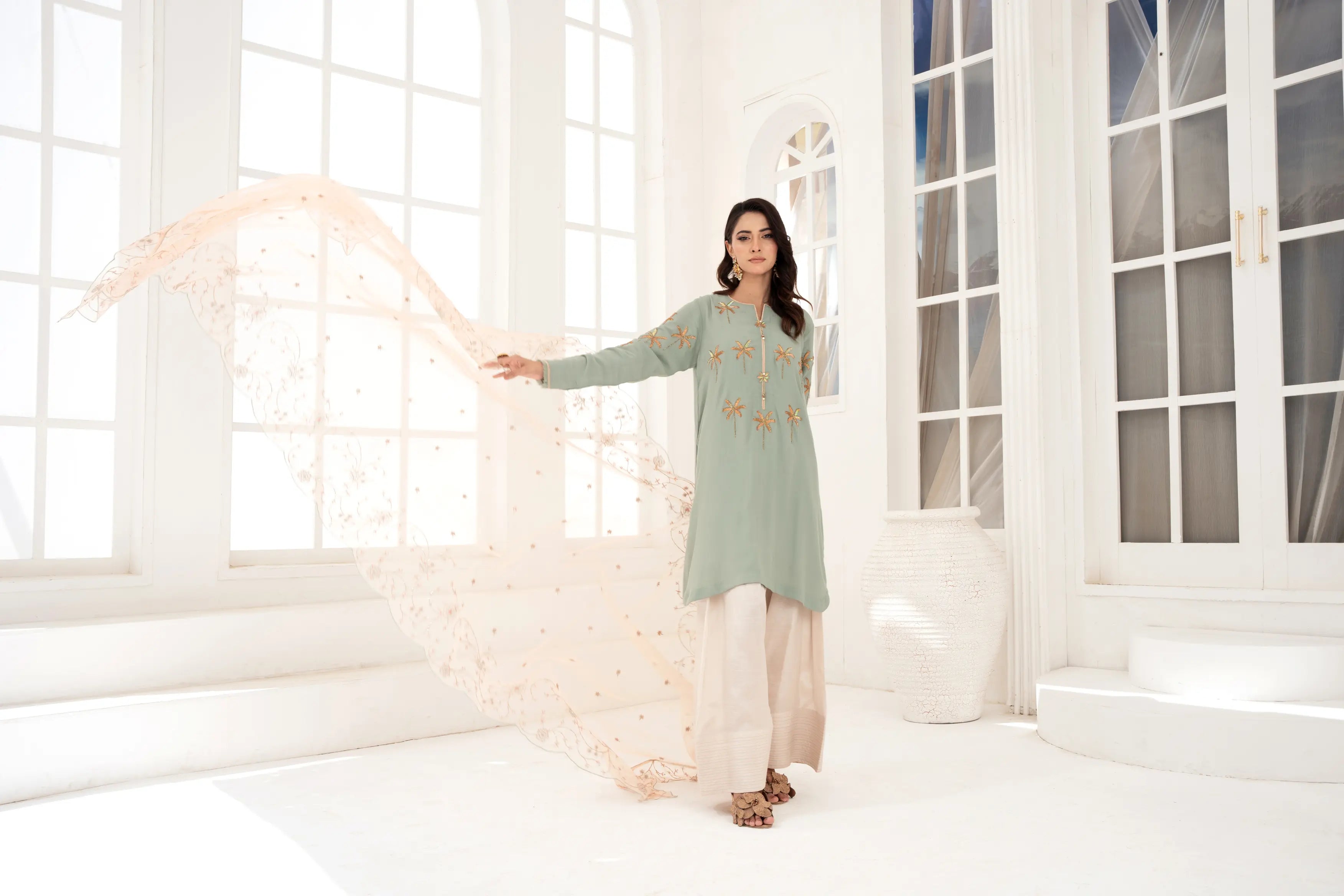 FLORA & FAUNA - Eid Festive: A dusty mint crepe georgette mid length round neck shirt features contrasting peach kaat dana and sequins hand embroidery of palm trees. Peach organza, pearls and beads finishing on the neckline. Fitted sleeves embellished with hand embroidery, peach organza and frayed edges finishing. Paired with cream bamboo raw silk wide leg shalwar finished with contrasting running stitches. Organza dupatta adorned with thread and sequins embroidery.