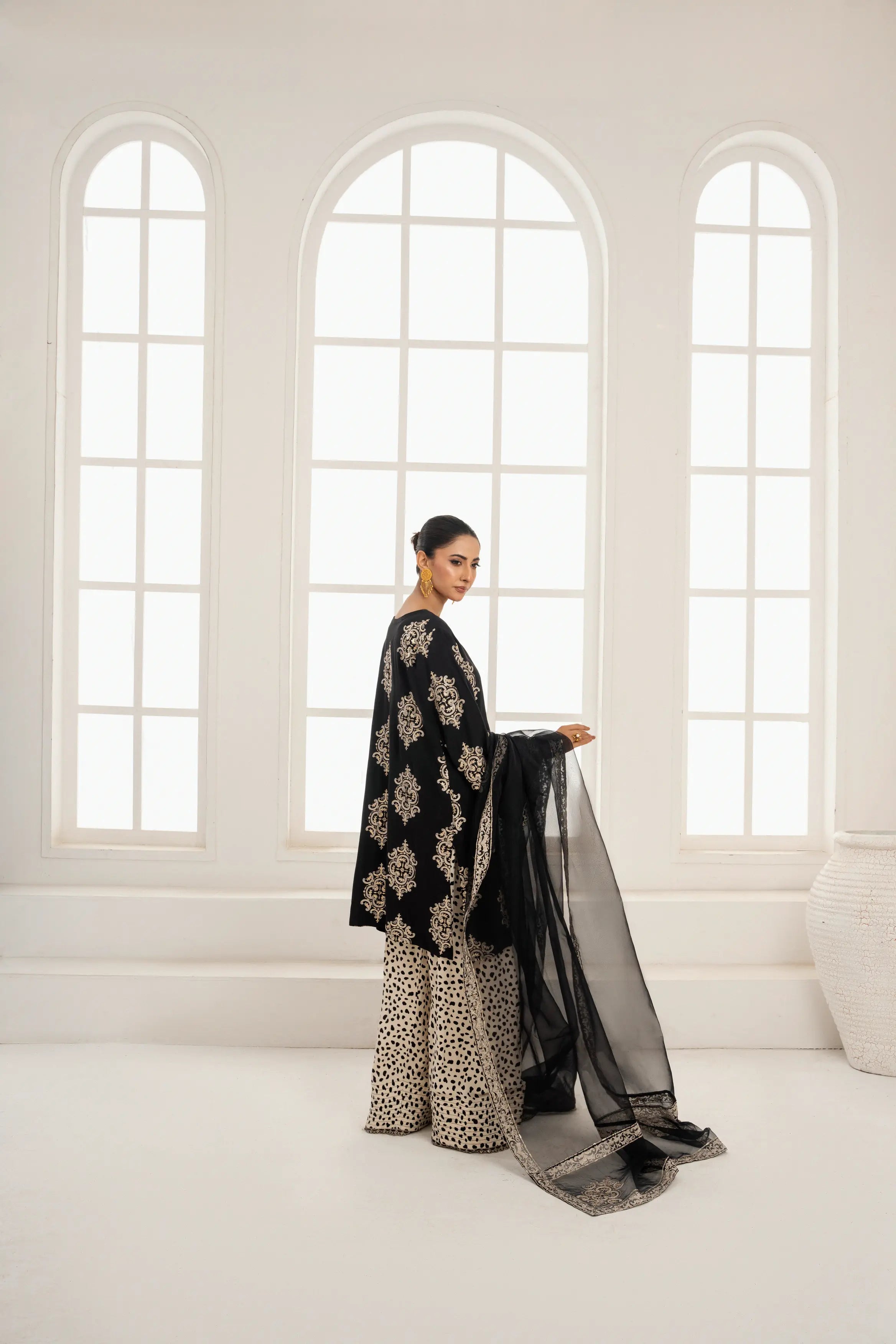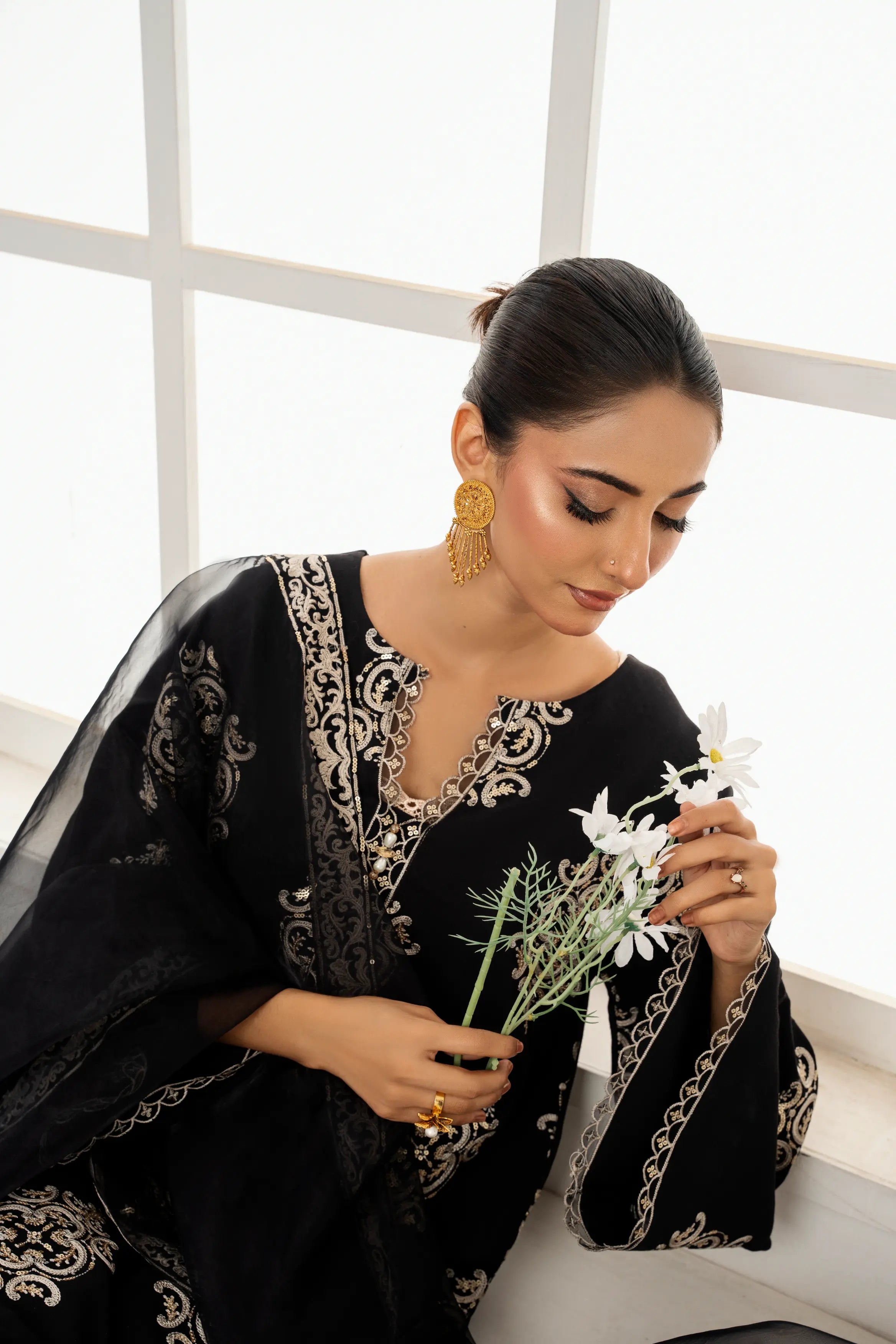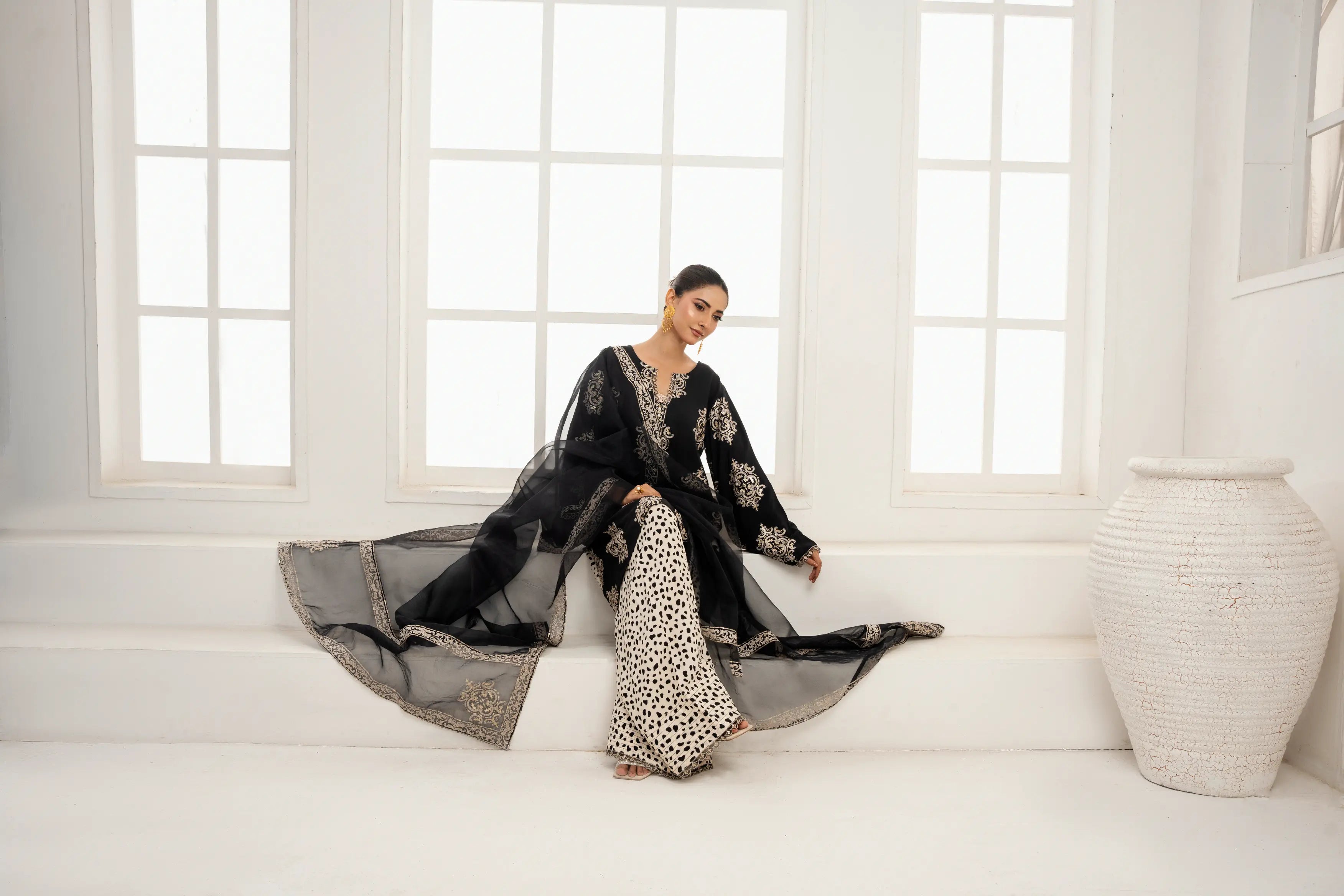 FLORA & FAUNA - Eid Festive: A black crepe georgette mid length round neck shirt features detailed thread embroidery with sequins. Kurta sleeves with organza lace finishing. The printed crepe georgette  wide leg shalwar finished with running stitches and organza lace. Paired with black organza dupatta adorned with thread and sequins embroidery motifs and border.