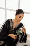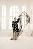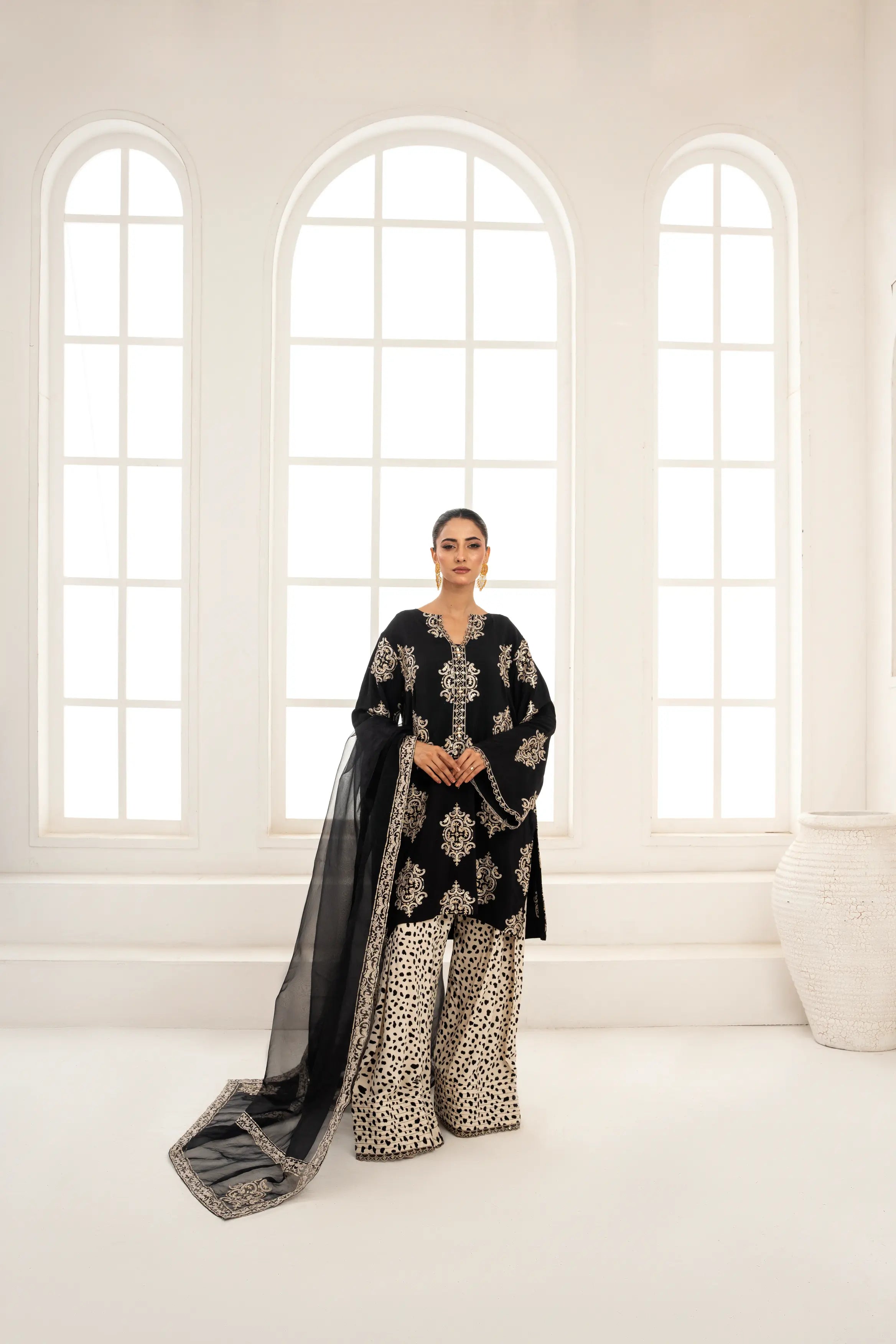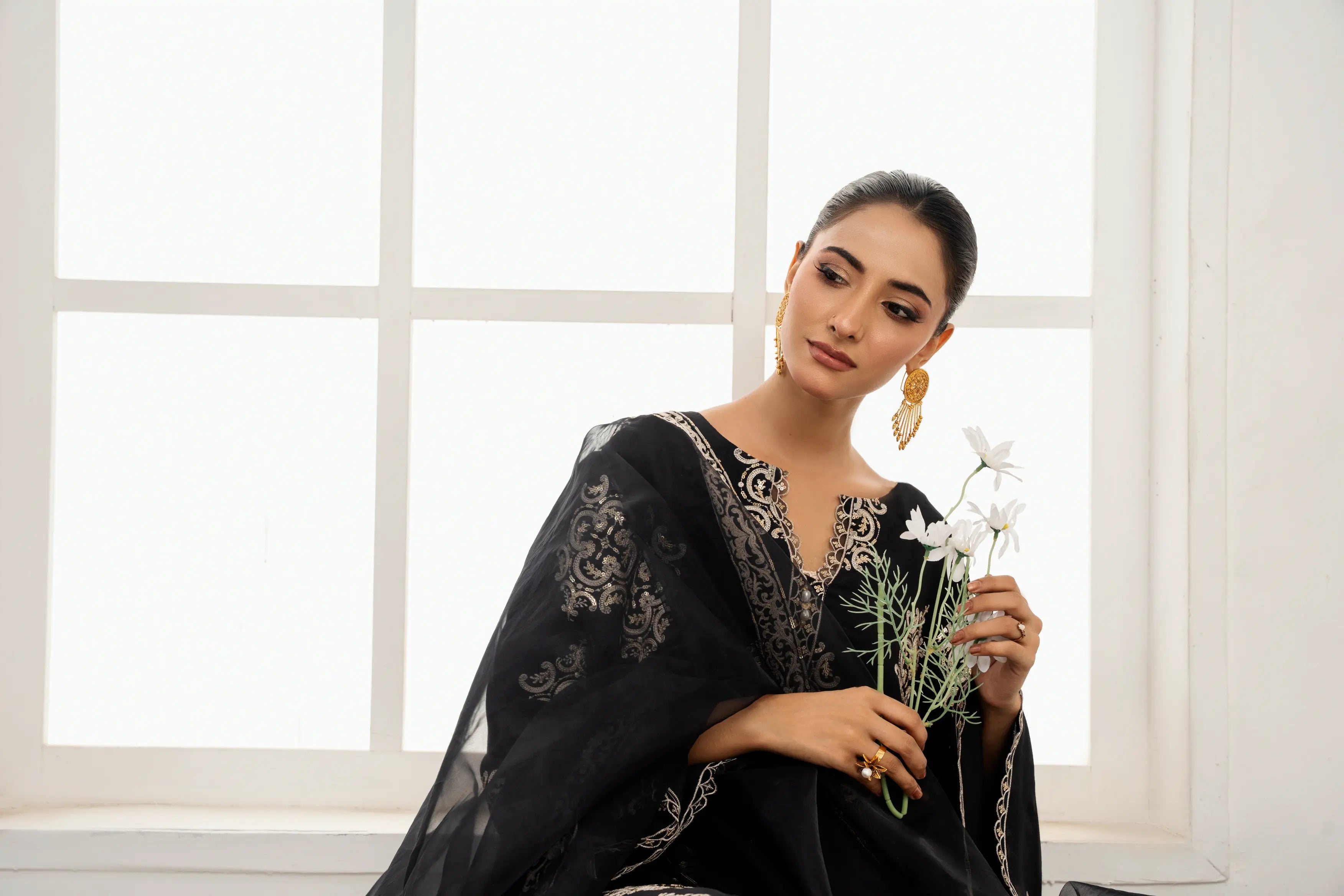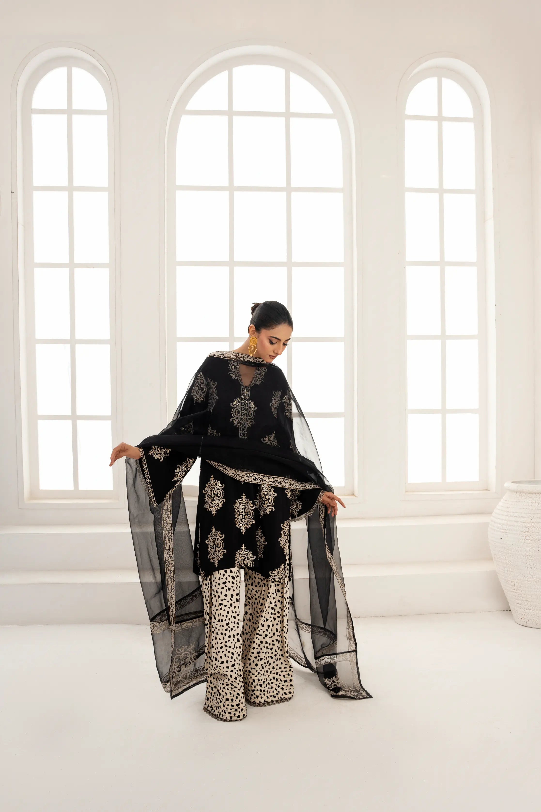 FLORA & FAUNA - Eid Festive: A black crepe georgette mid length round neck shirt features detailed thread embroidery with sequins. Kurta sleeves with organza lace finishing. The printed crepe georgette  wide leg shalwar finished with running stitches and organza lace. Paired with black organza dupatta adorned with thread and sequins embroidery motifs and border.