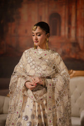LIA - Festive Formal - VOL 2: Basking in a soft ivory pastel hue, this shamooz silk digital printed long A-Line shirt is adorned with pastel florals infusing it with playful charm. Zardoze, sequins, Swarovski crystals, beads, blush organza petals and gota embroidery enrich...- PKR 40,500