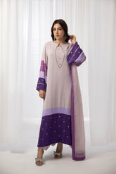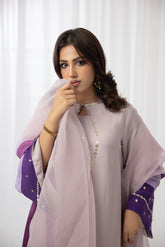 Jahaan'23: Color-blocked pure crepe georgette lavender shirt with shades of purple. A line long shirt adorned with pearls & sequins hand embroidery all over. Paired up with the same color fabric asymmetrical Dhaka pajama and organza dupatta. A perfect chic look for this festive...- PKR 29,300
