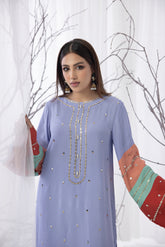 Jahaan'23: Color-blocked pure crepe georgette light blue shirt. A line long shirt adorned with pearls & sequins hand embroidery all over. Paired up with light blue pure crepe georgette culottes. A perfect chic look for this festive season.Colour: Light Blue2 pieces Shirt &trousers.Shirt &...- PKR 26,350