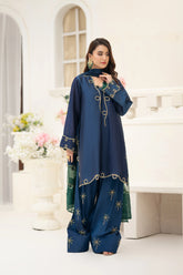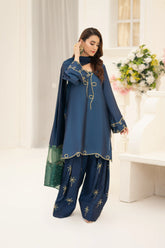 Minha - Eid Festive: The ensemble features a Midnight blue sheesha silk short shirt adorned with intricate contrasting gold and emerald green hand embroidery with zardozi, bead and sequins. Paired with wide leg shalwar emblazoned with contrasting hand embroidery of palm trees and medium...- PKR 52,100
