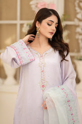 Minha - Eid Festive: The ensemble features a lavender pure sheesha rawsilk short shirt with Kurta sleeves finished with a thread embroidery border and organza. Intricate silver zardozi, pearl, sequins and Swarovski hand embroidery with a bit of accent colours. Paired with the same...- PKR 44,500