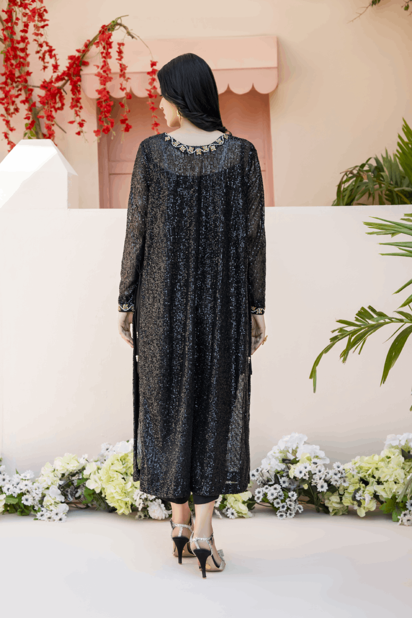 Black sequin shirt with head embroidery. A line side slit shirt adorned with pearls & sequins embroidery...