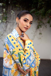 IRA - Luxury Printed Co-ords: A playful blend of comfort and flair, this crepe silk co-ord set stuns with its Amalfi coast inspired print. The collared button down shirt paired with culottes and striking bold print makes this ensemble perfect companion for everything from...- PKR 15,200