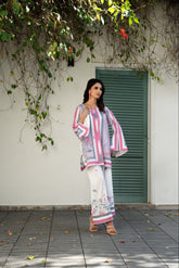 IRA - Luxury Printed Co-ords: Exude confidence in this effortlessly tailored co-ord set made of crepe silk. Adorned with timeless print, combination of Mughal arches and floral. The button down shirt and flared culottes presents endless styling opportunities; making it an excellent pick for...- PKR 15,200
