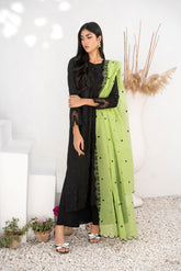 Melia'24: The ensemble features a black soft katan long tunic with a contrasting apple green khaddi woven dupatta with black thread and sequins cutwork embroidery. Shirt is embellished with black on black hand and thread embroidery all over in sequins, bugle beads and crystals....- PKR 23,500
