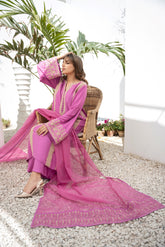 Melia'24: The ensemble features a deep mauve panelled pure crepe georgette long tunic with a matching khaddi woven dupatta with chikan embroidery borders. Shirt is embellished with beige color machine Aari embroidery on neckline, panels and sleeves. Finished with glass crystal beads. This outfit...- PKR 24,000