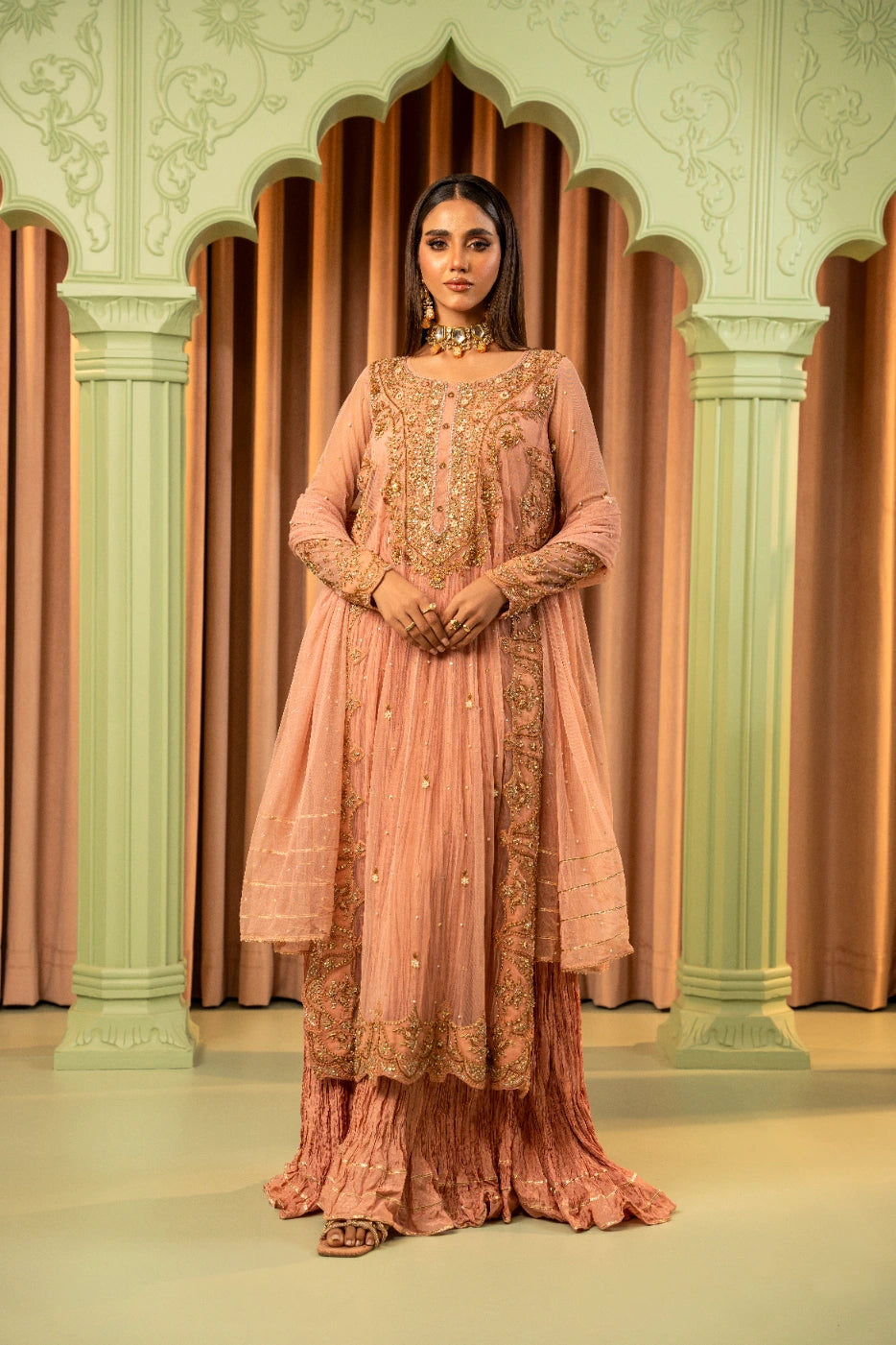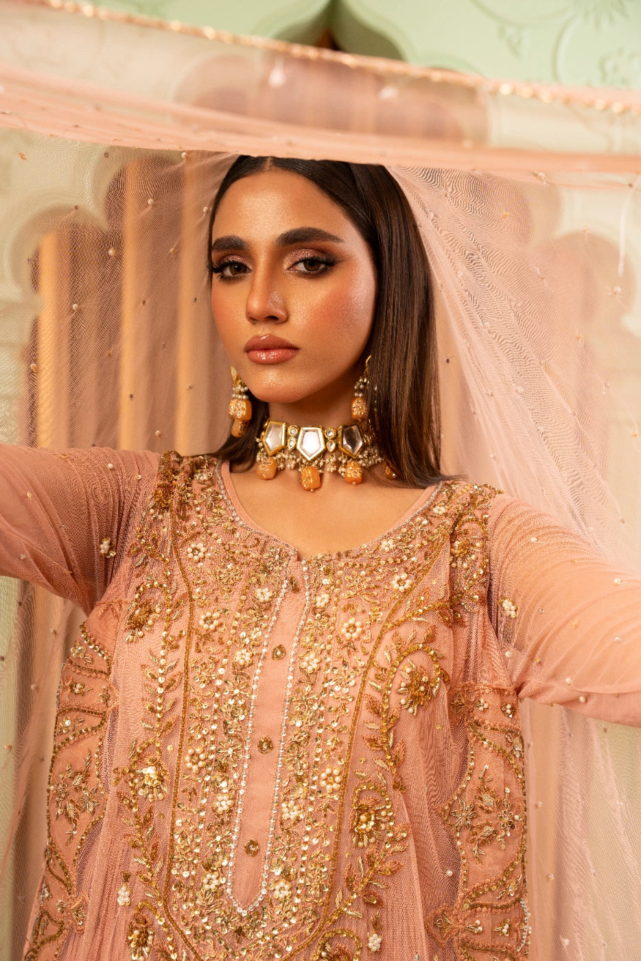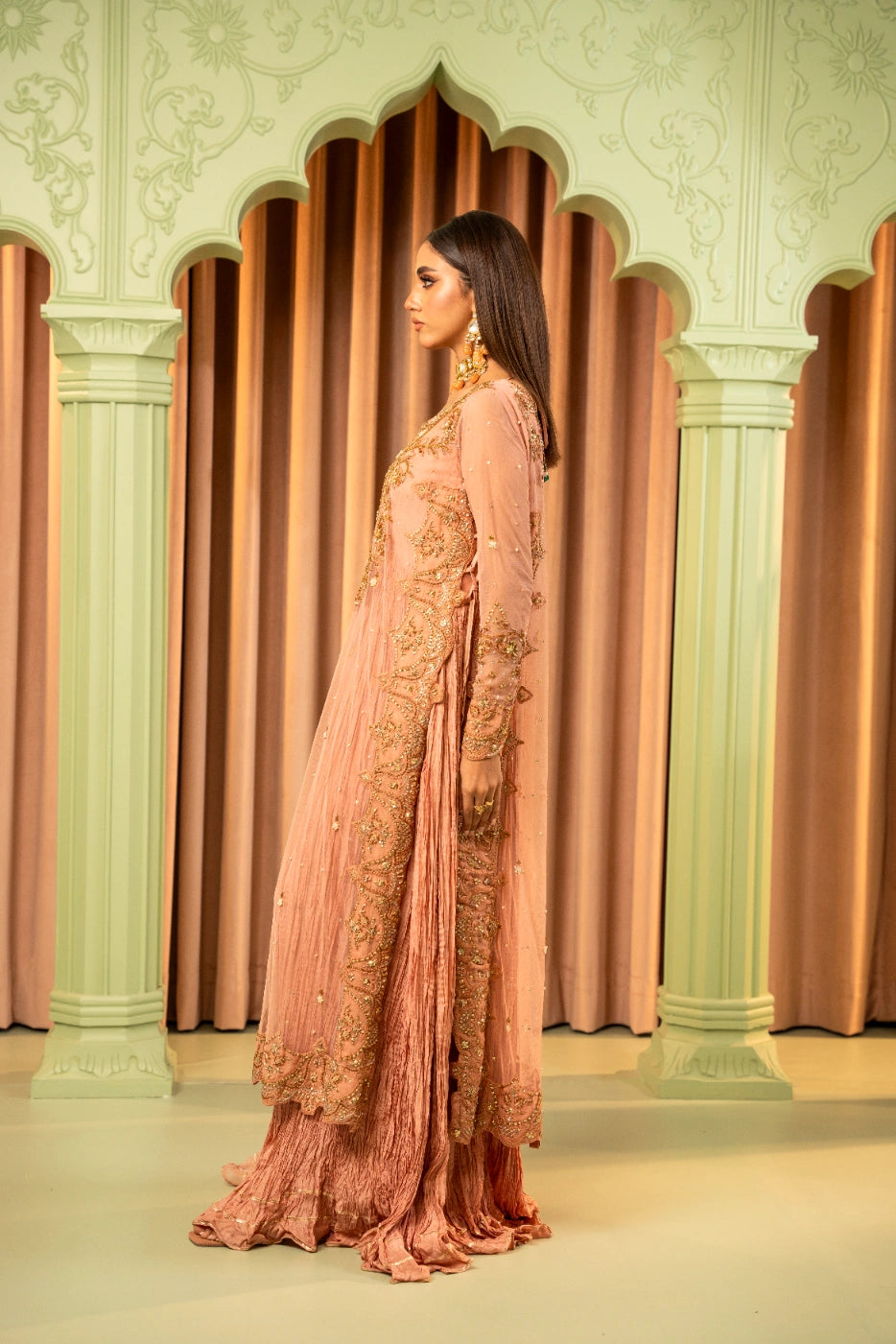 A peach net straight shirt features heavy hand embroidery with side slit cotton silk crushed dress is a modern silhouette with zardozi work composed on shirt front, back and sleeves. The piece is paired with a same net dupatta adorned with gota and sequins chaan. Paired it with peach cotton silk straight pants.