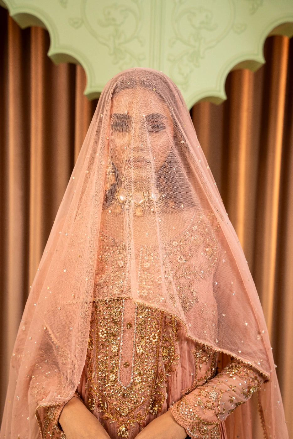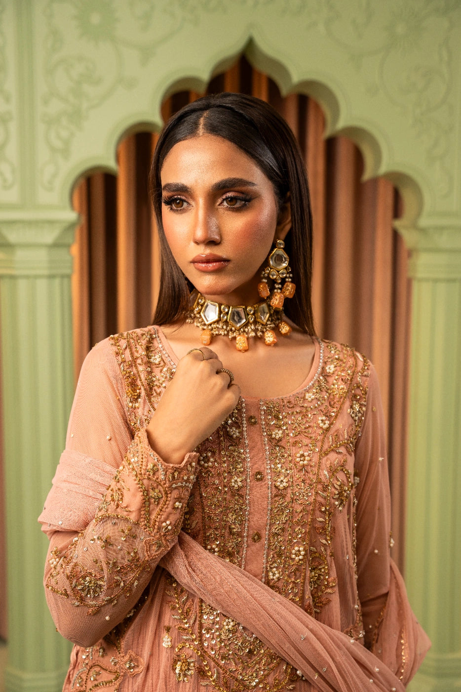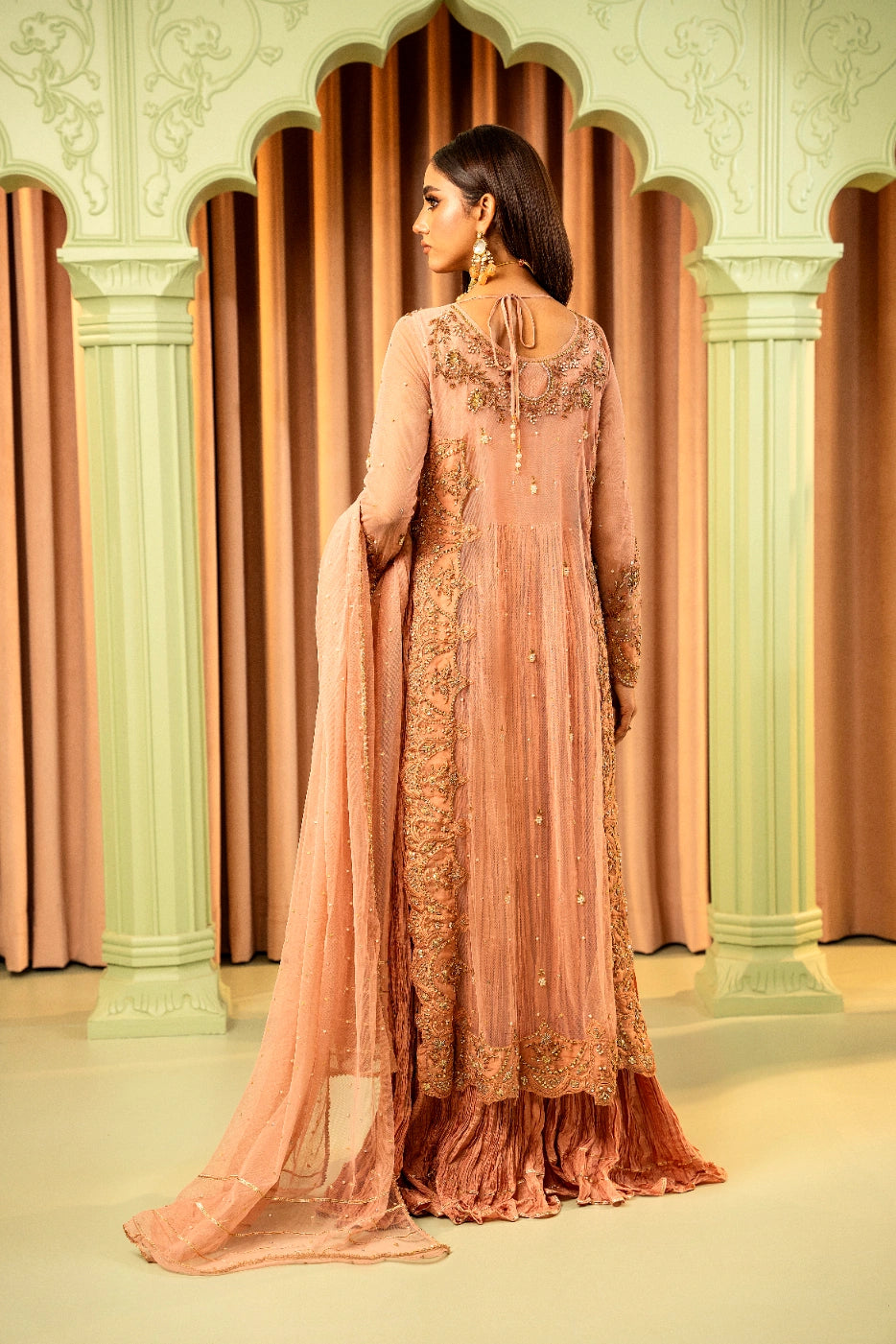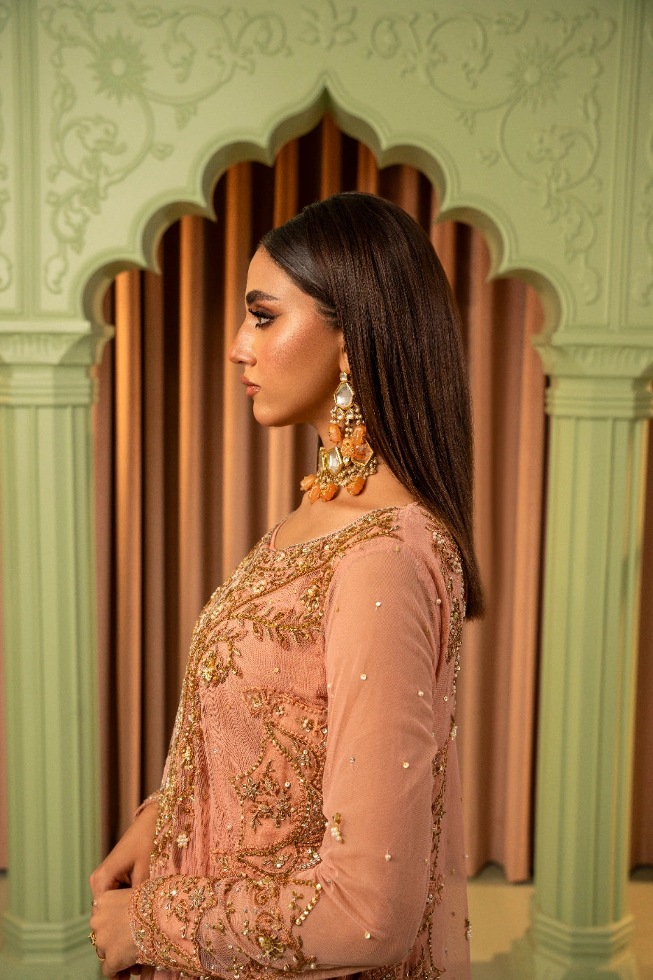 A peach net straight shirt features heavy hand embroidery with side slit cotton silk crushed dress is a modern silhouette with zardozi work composed on shirt front, back and sleeves. The piece is paired with a same net dupatta adorned with gota and sequins chaan. Paired it with peach cotton silk straight pants.