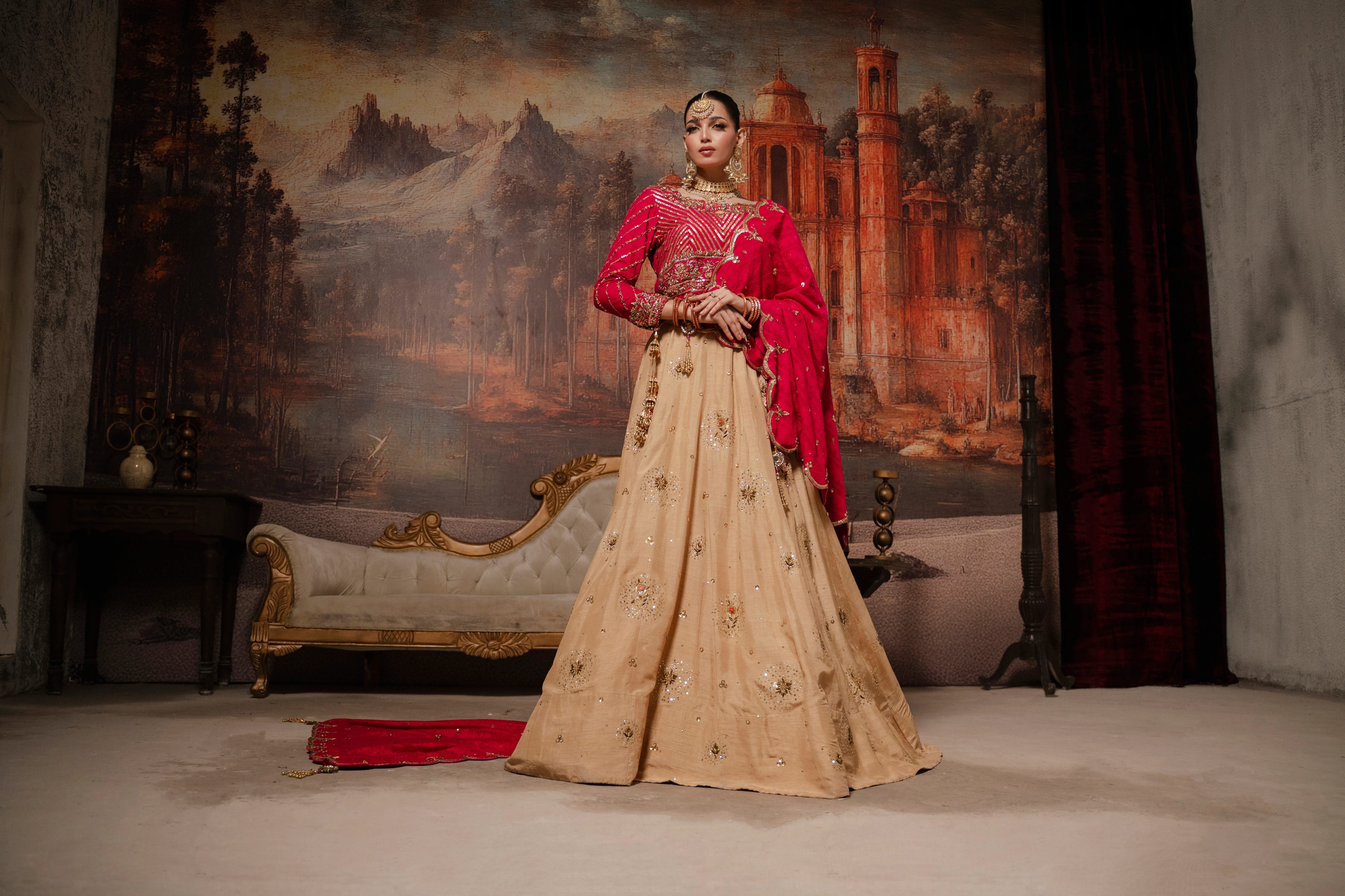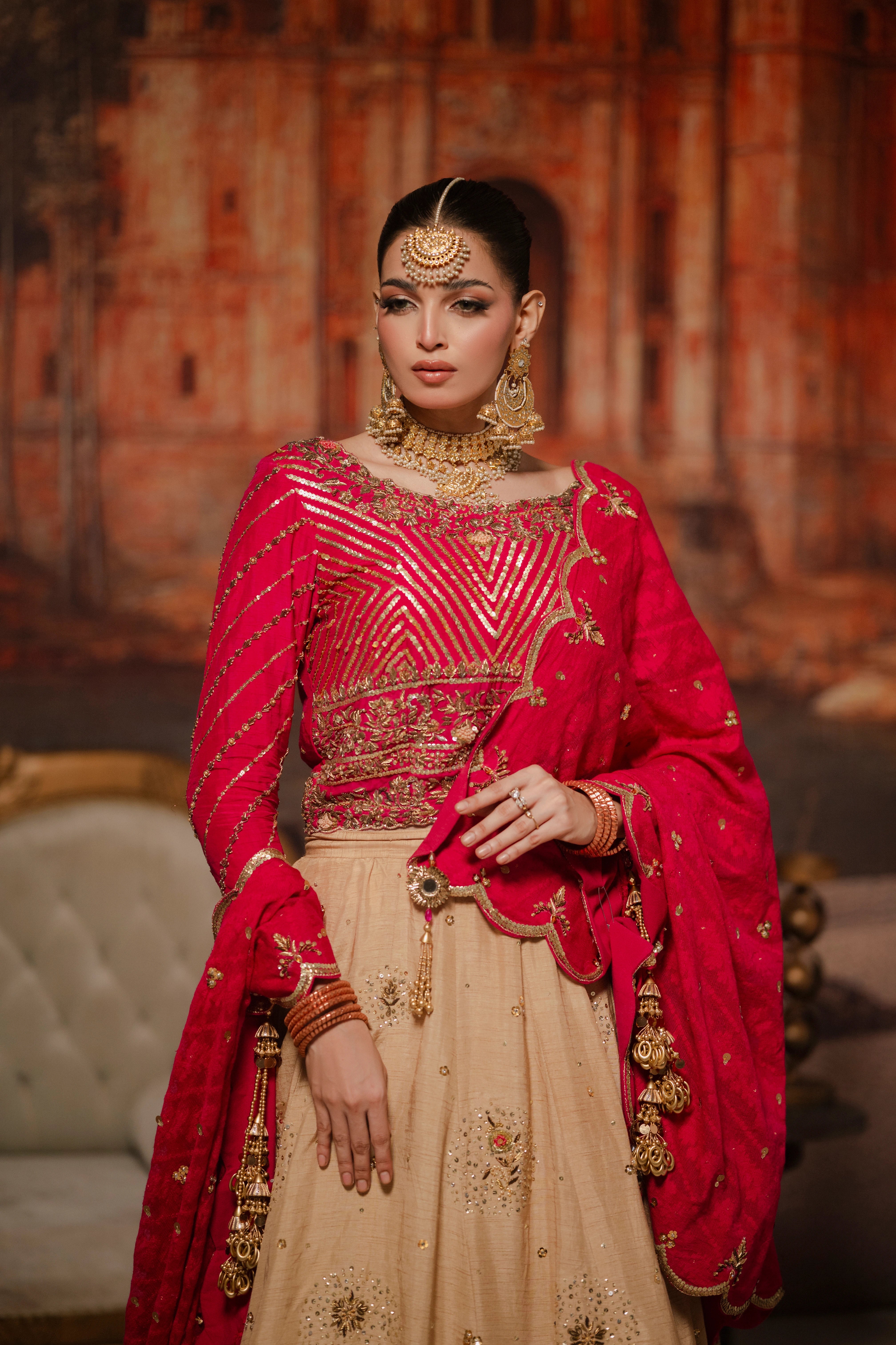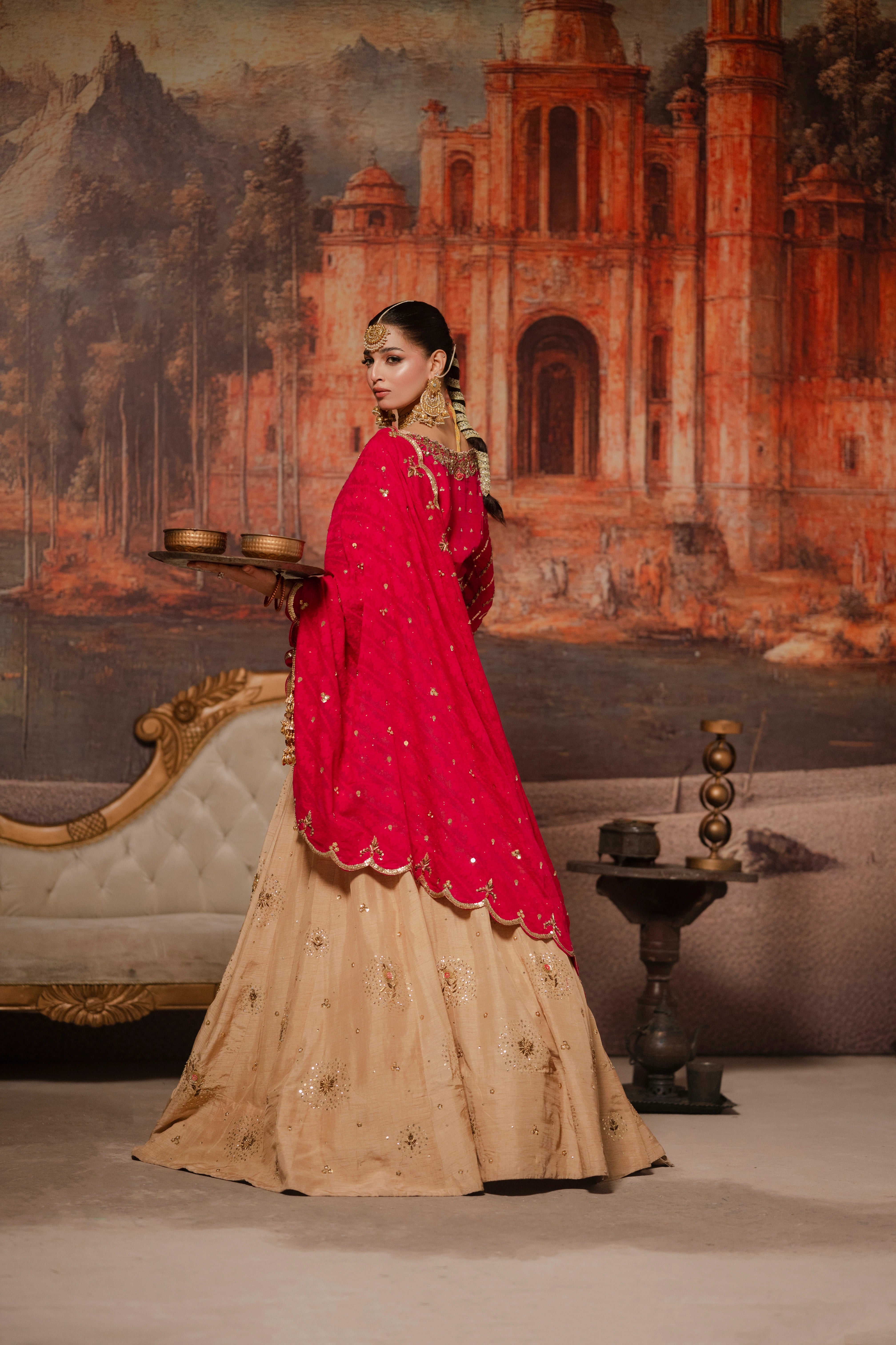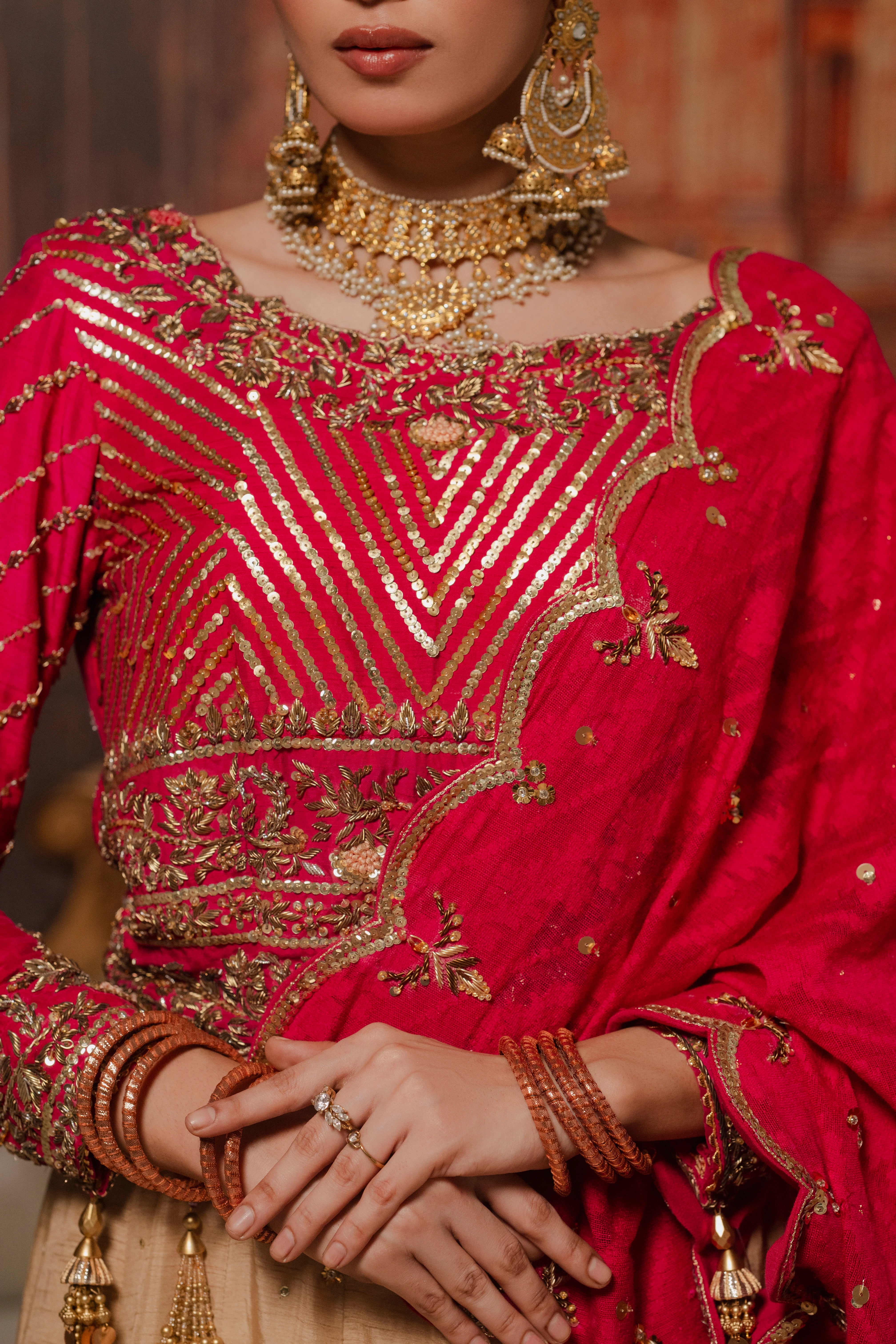 LIA - Festive Formal - VOL 3: A glamorous fuchsia pink hued choli is elevated with khaddi net dupatta, resplendent in a cutwork scallop border embroidered with zardoze and sequins. The gold Korean rawsilk voluminous lehenga creating a regal contrast, embellished with handwork motifs, pairing perfectly with a fully embroidered choli cut from Korean rawsilk fabric. The hand embroidery details in gold create a floral borders of zardoze, resham, and glistening sequins chevron on the choli. Sleeve hem and dupatta edges finished with tassels; evoking a timeless charm.