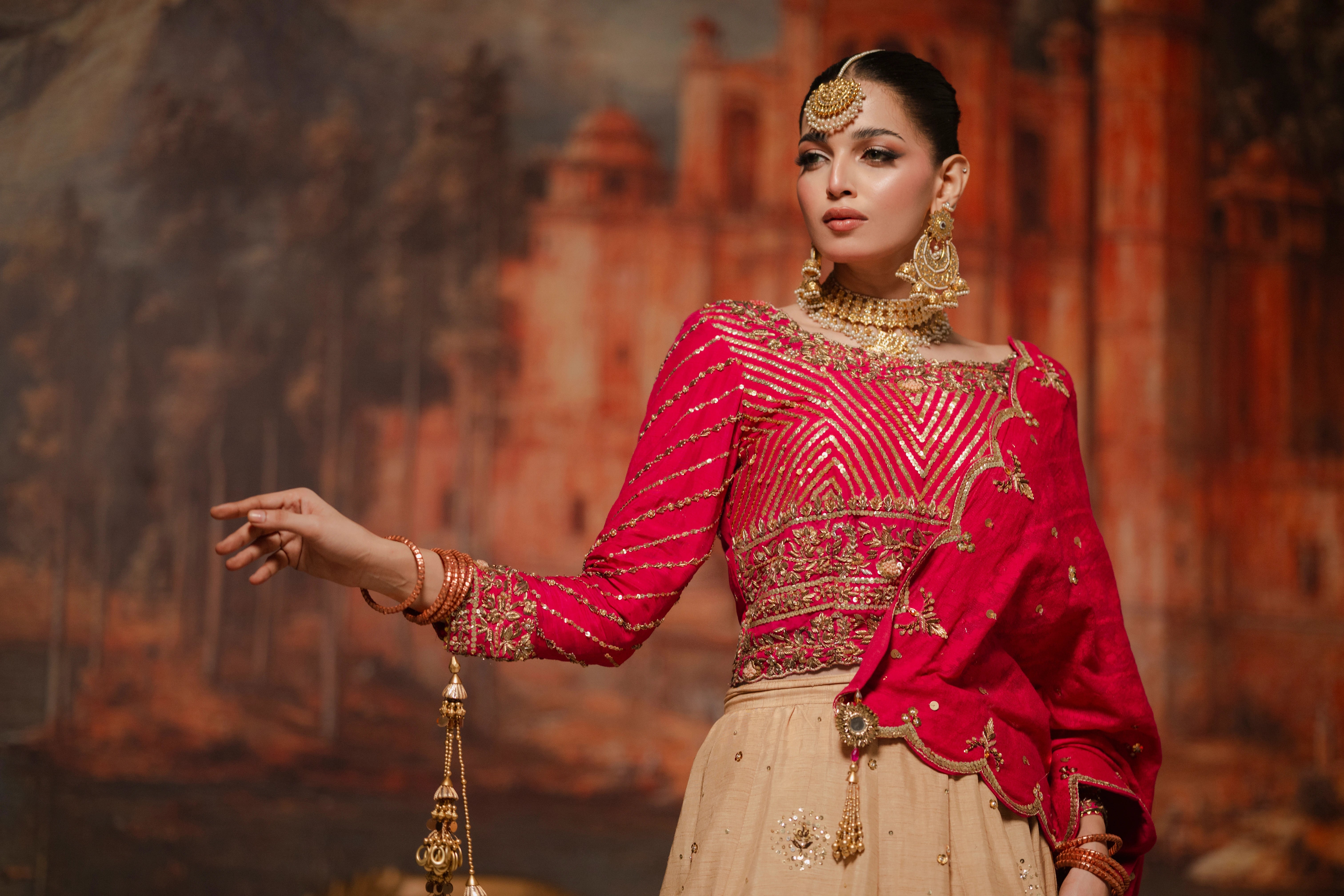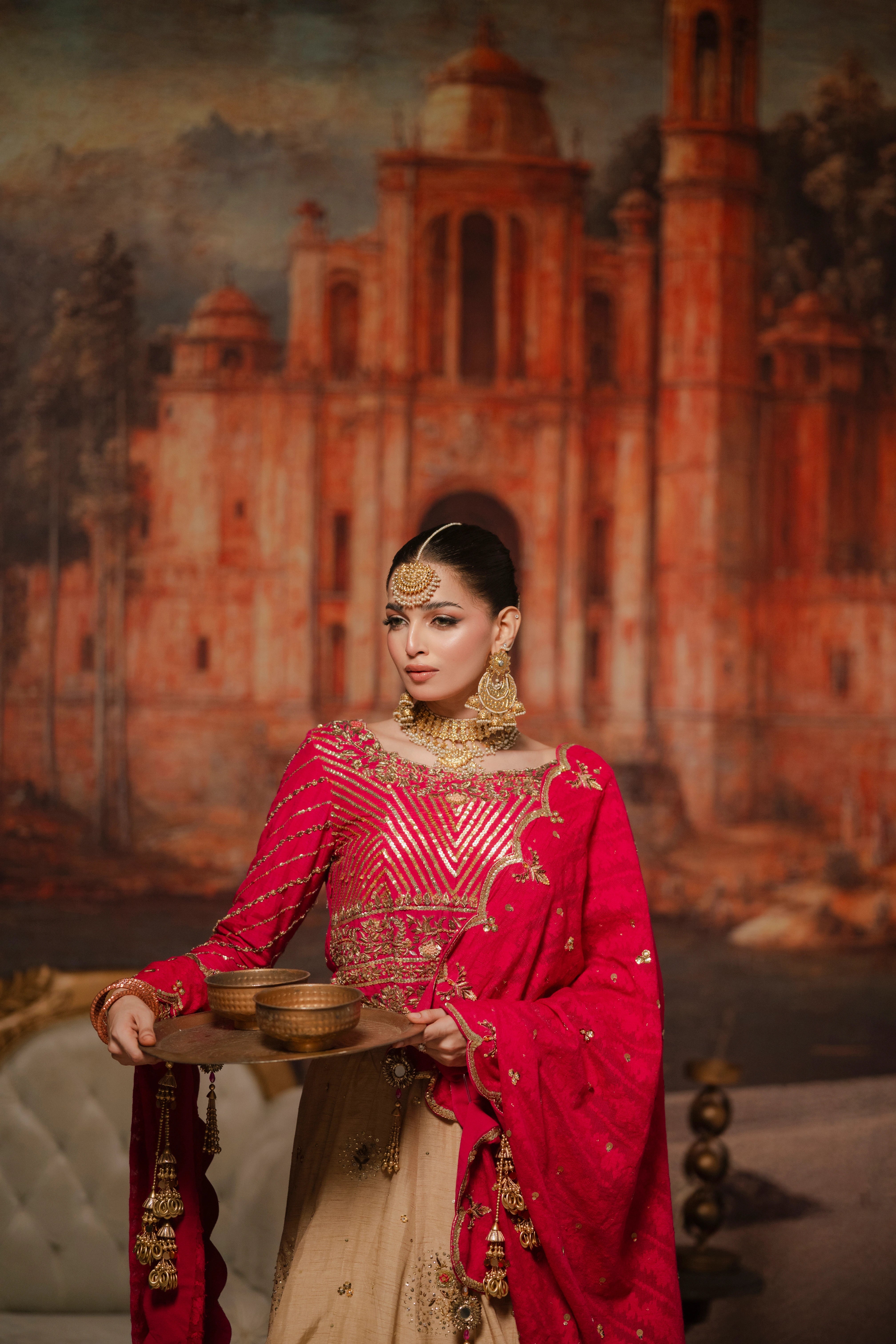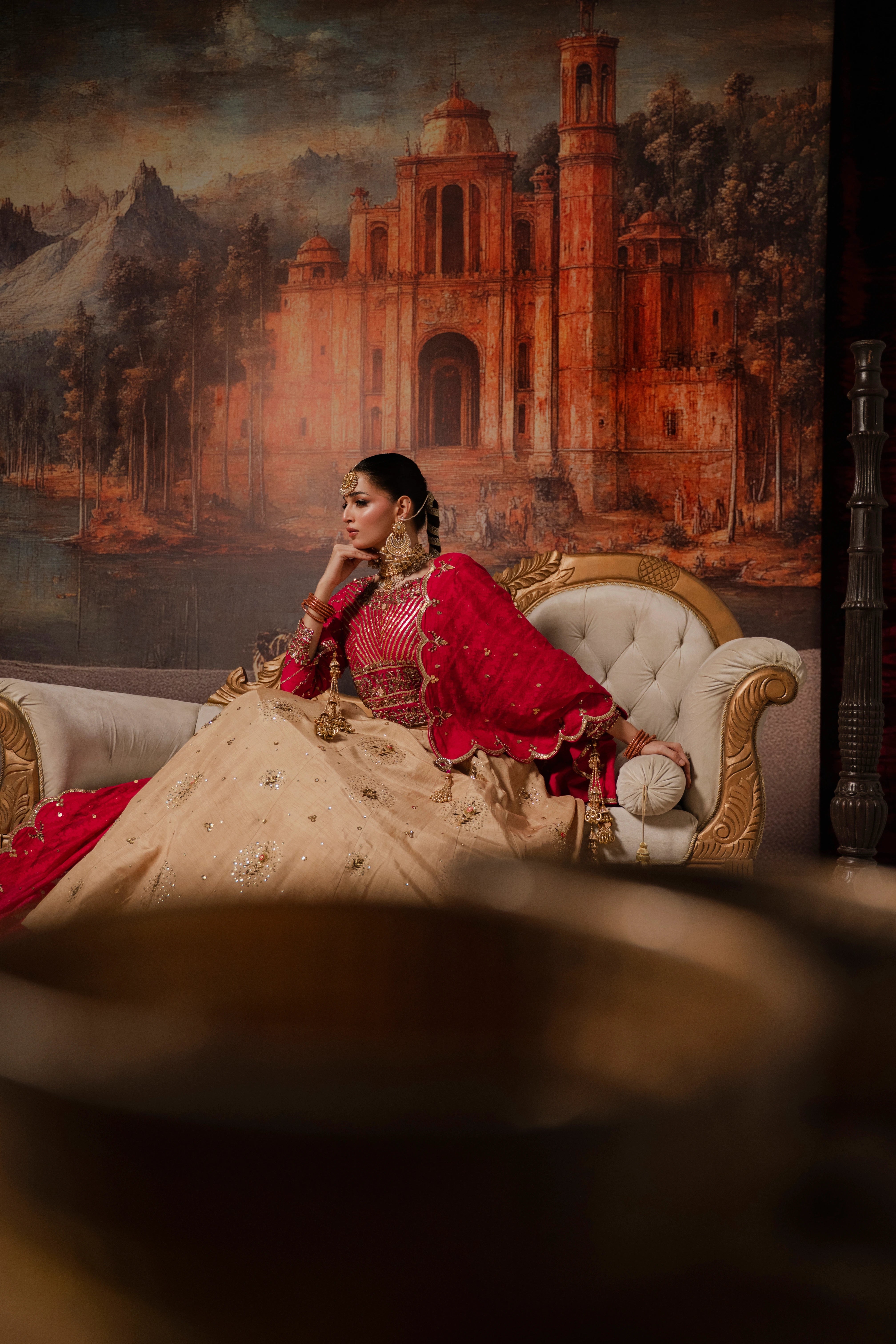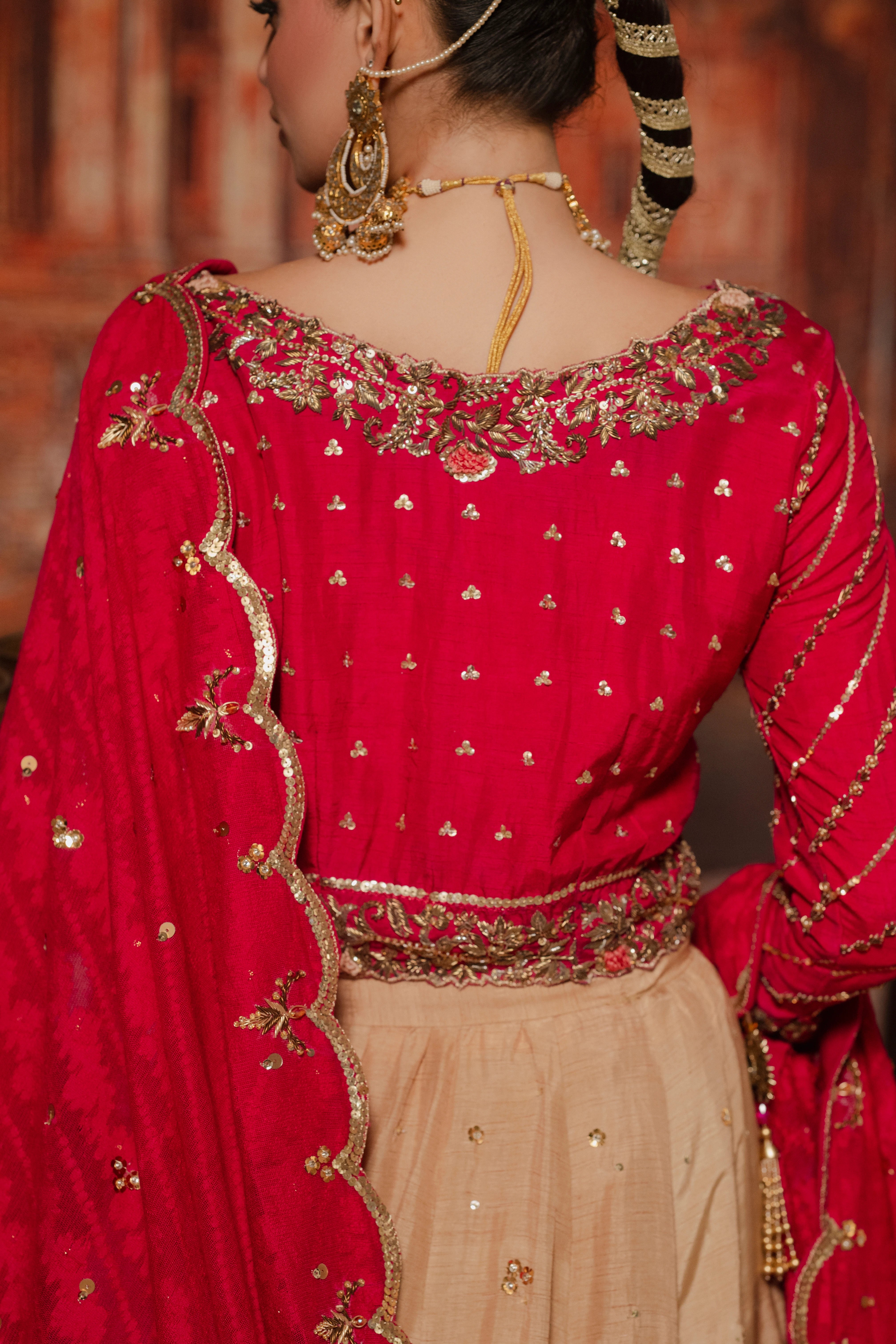 LIA - Festive Formal - VOL 3: A glamorous fuchsia pink hued choli is elevated with khaddi net dupatta, resplendent in a cutwork scallop border embroidered with zardoze and sequins. The gold Korean rawsilk voluminous lehenga creating a regal contrast, embellished with handwork motifs, pairing perfectly with a fully embroidered choli cut from Korean rawsilk fabric. The hand embroidery details in gold create a floral borders of zardoze, resham, and glistening sequins chevron on the choli. Sleeve hem and dupatta edges finished with tassels; evoking a timeless charm.
