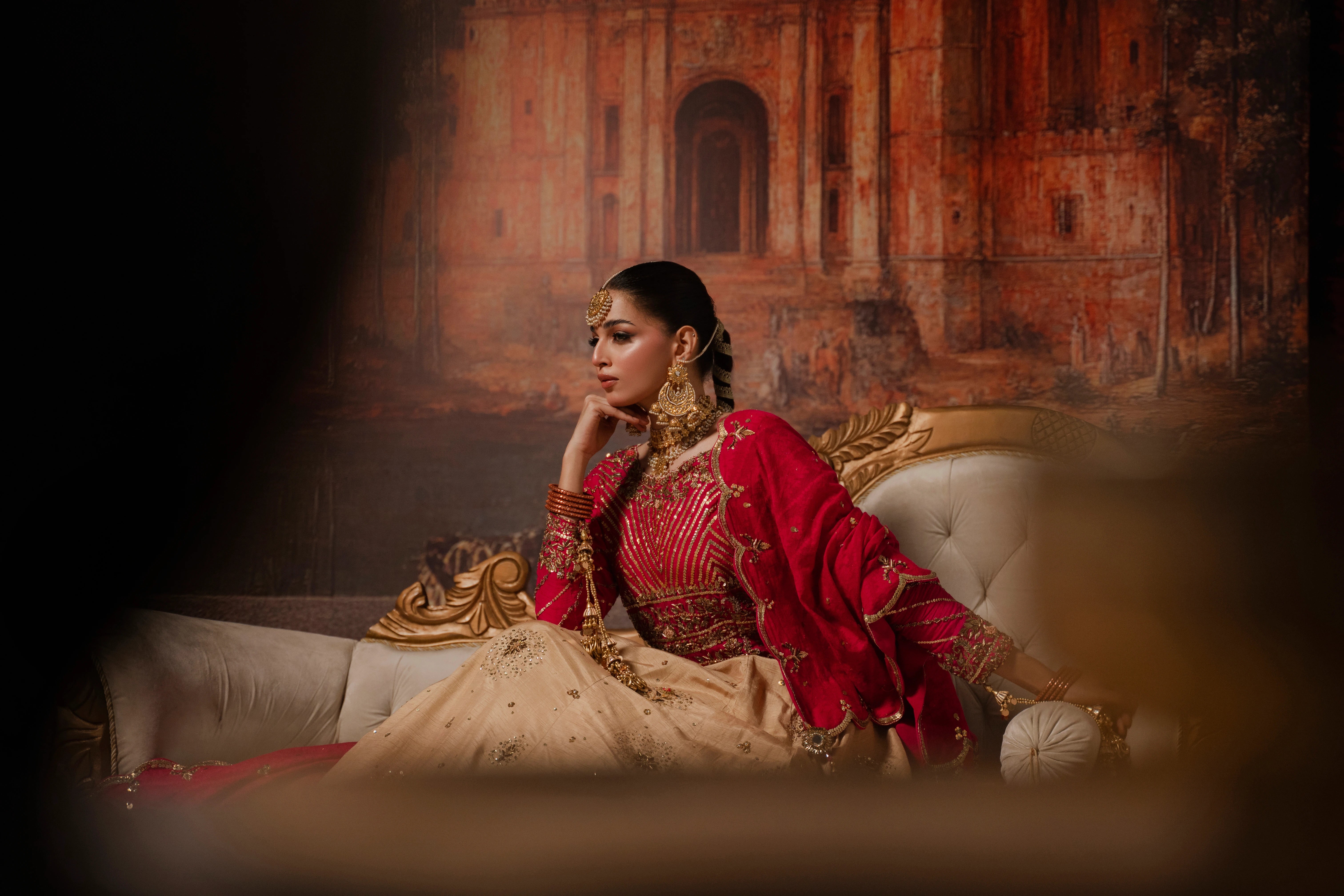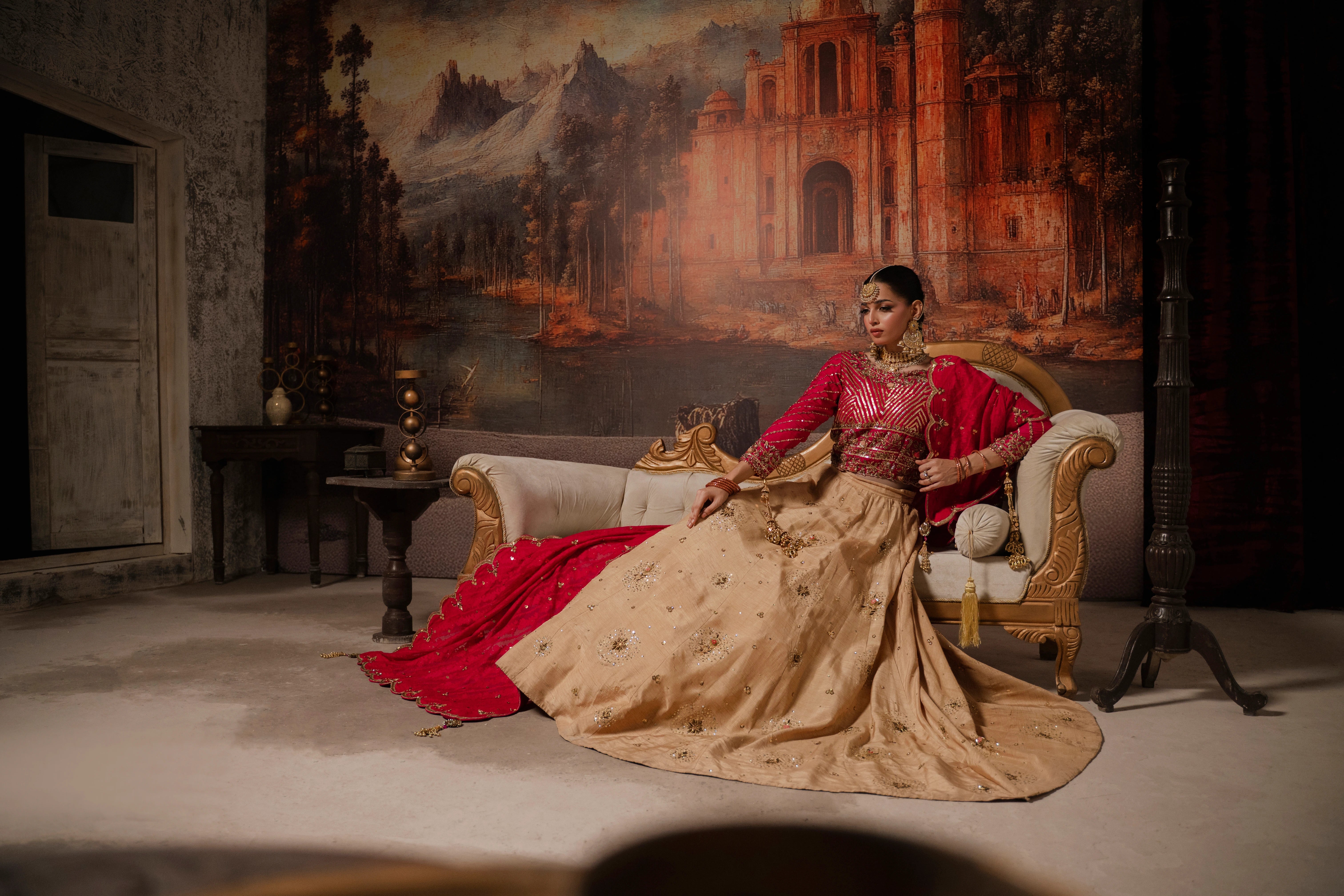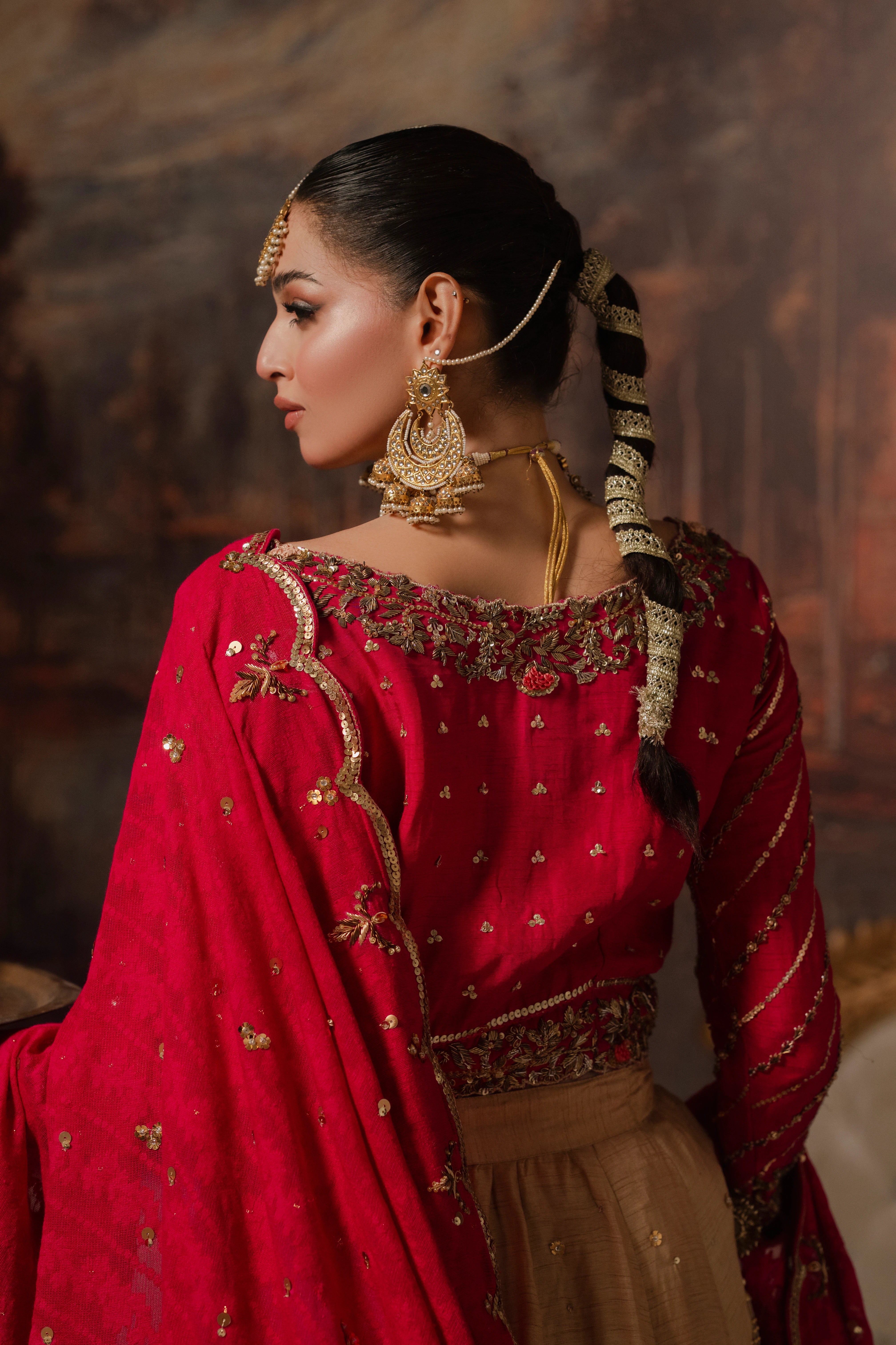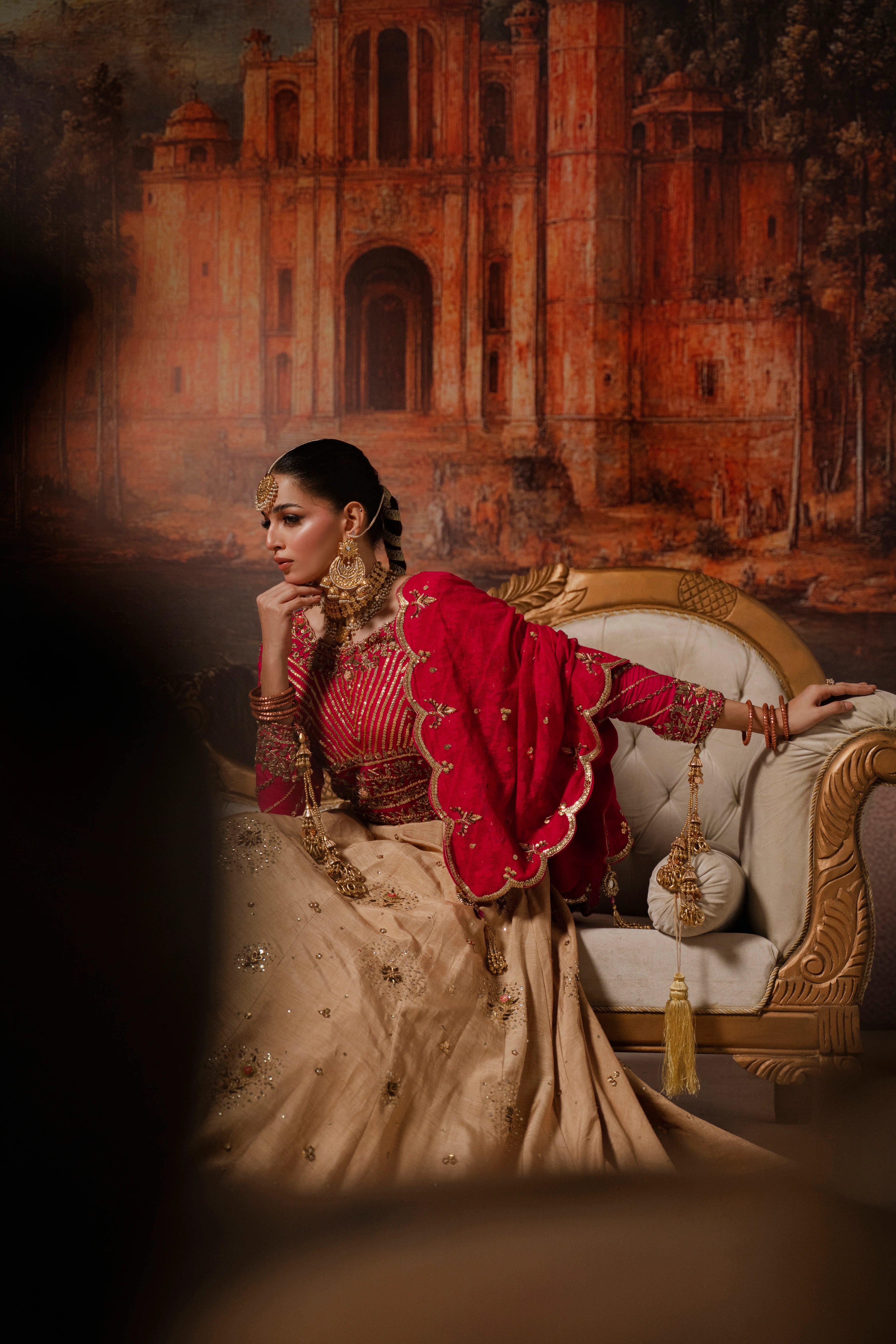 LIA - Festive Formal - VOL 3: A glamorous fuchsia pink hued choli is elevated with khaddi net dupatta, resplendent in a cutwork scallop border embroidered with zardoze and sequins. The gold Korean rawsilk voluminous lehenga creating a regal contrast, embellished with handwork motifs, pairing perfectly with a fully embroidered choli cut from Korean rawsilk fabric. The hand embroidery details in gold create a floral borders of zardoze, resham, and glistening sequins chevron on the choli. Sleeve hem and dupatta edges finished with tassels; evoking a timeless charm.