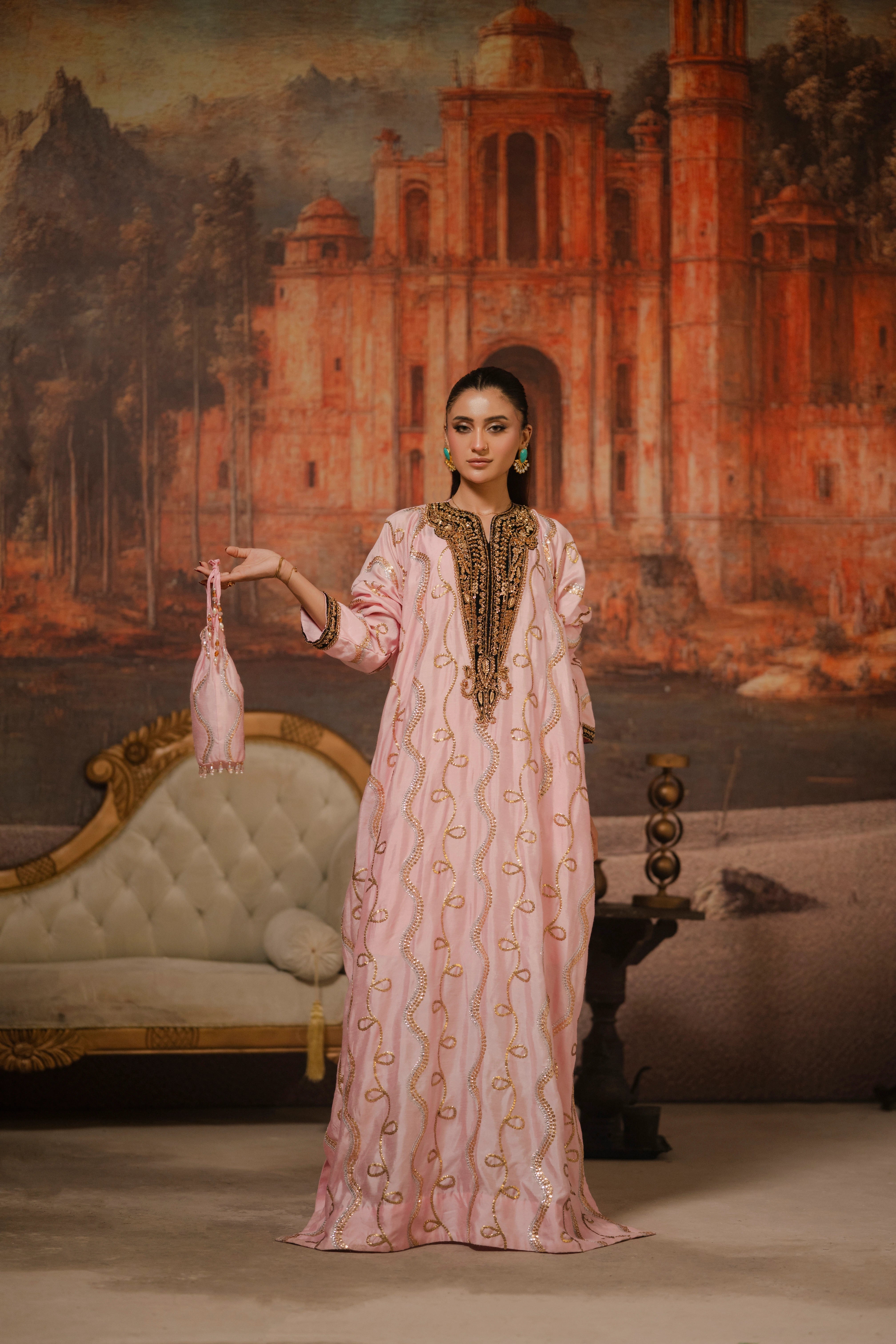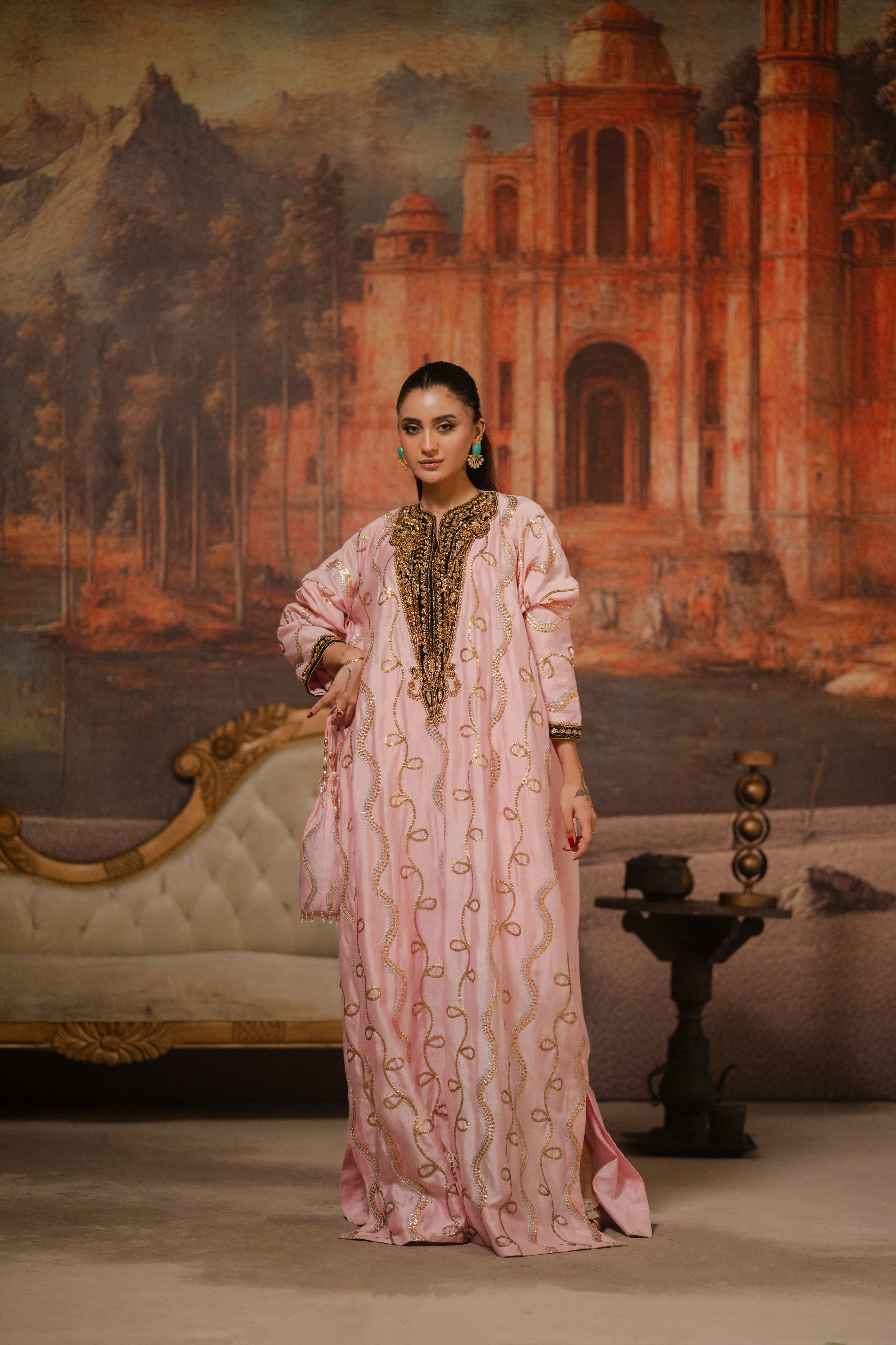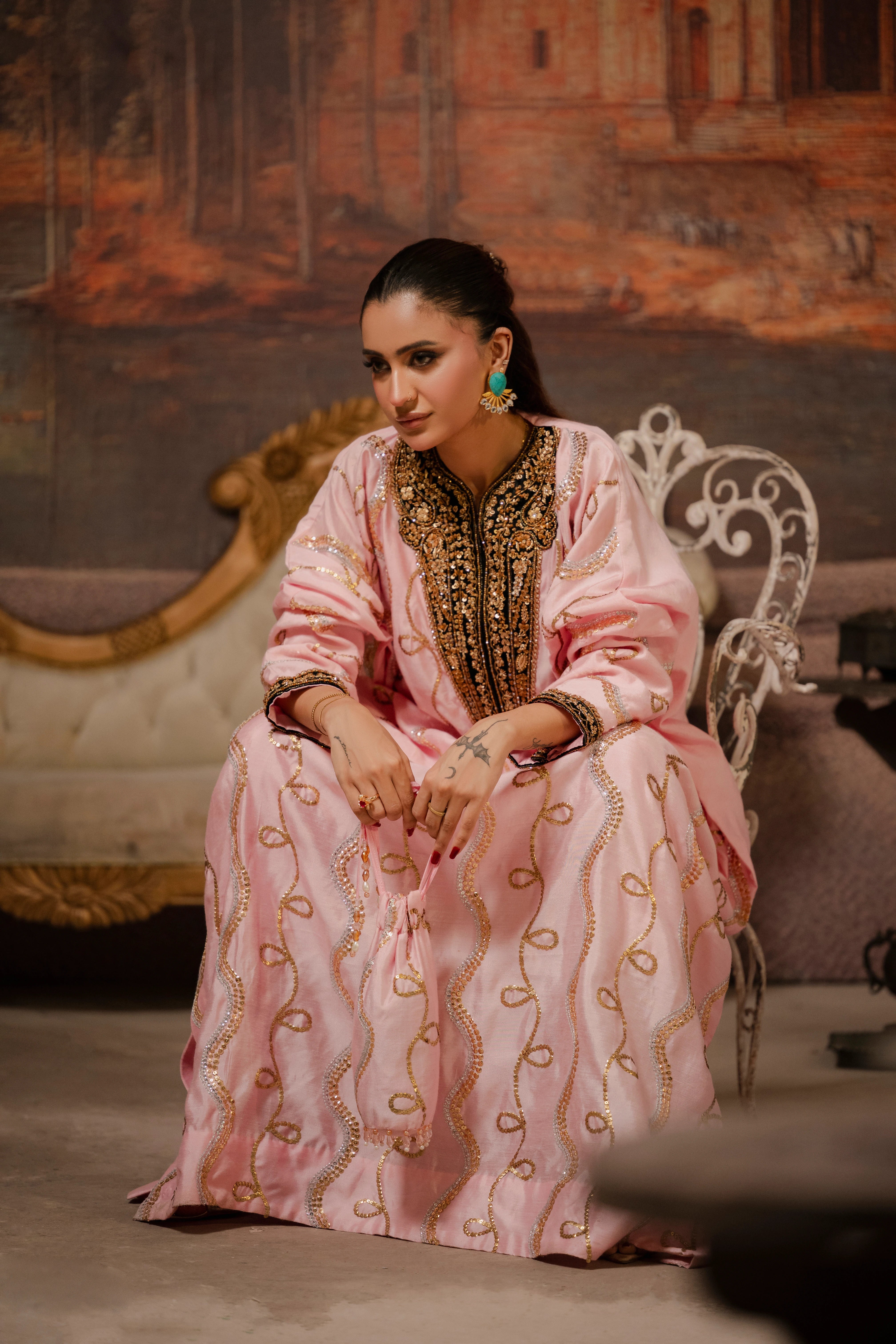 LIA - Festive Formal - VOL 3: Crafted from sheesha rawsilk, this candy floss hued kaftan is intricately adorned with sequins hand embroidery in gold and silver. The flowing silhouette features black appliquéd velvet accent neckline and sleeves hem, the V-shaped contrasting neckline and sleeve hem are embellished with sequin and zardoze handwork embroidery. Complete the look with matching cotton silk straight pants, striking a harmonious blend of tradition and understated elegance.
