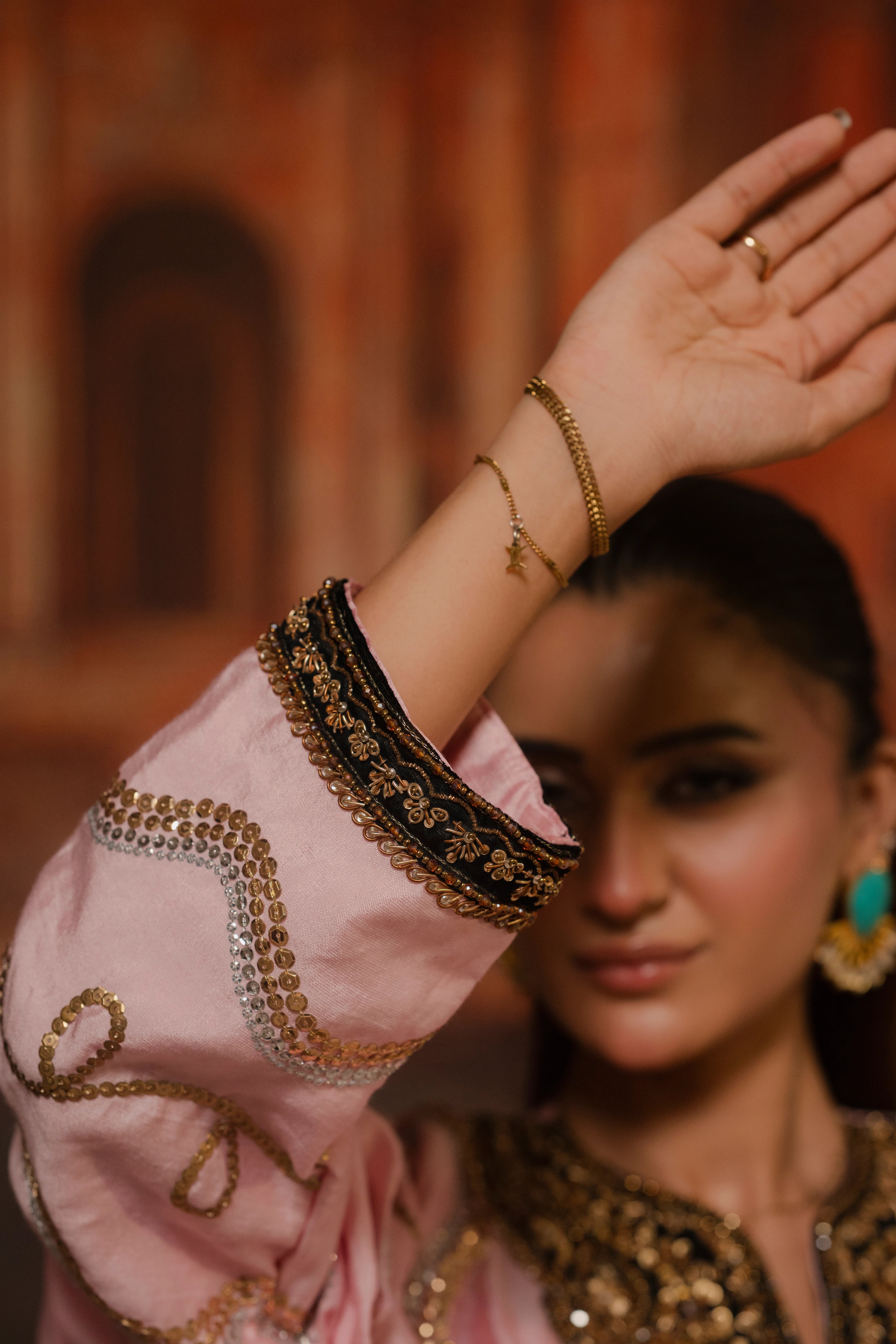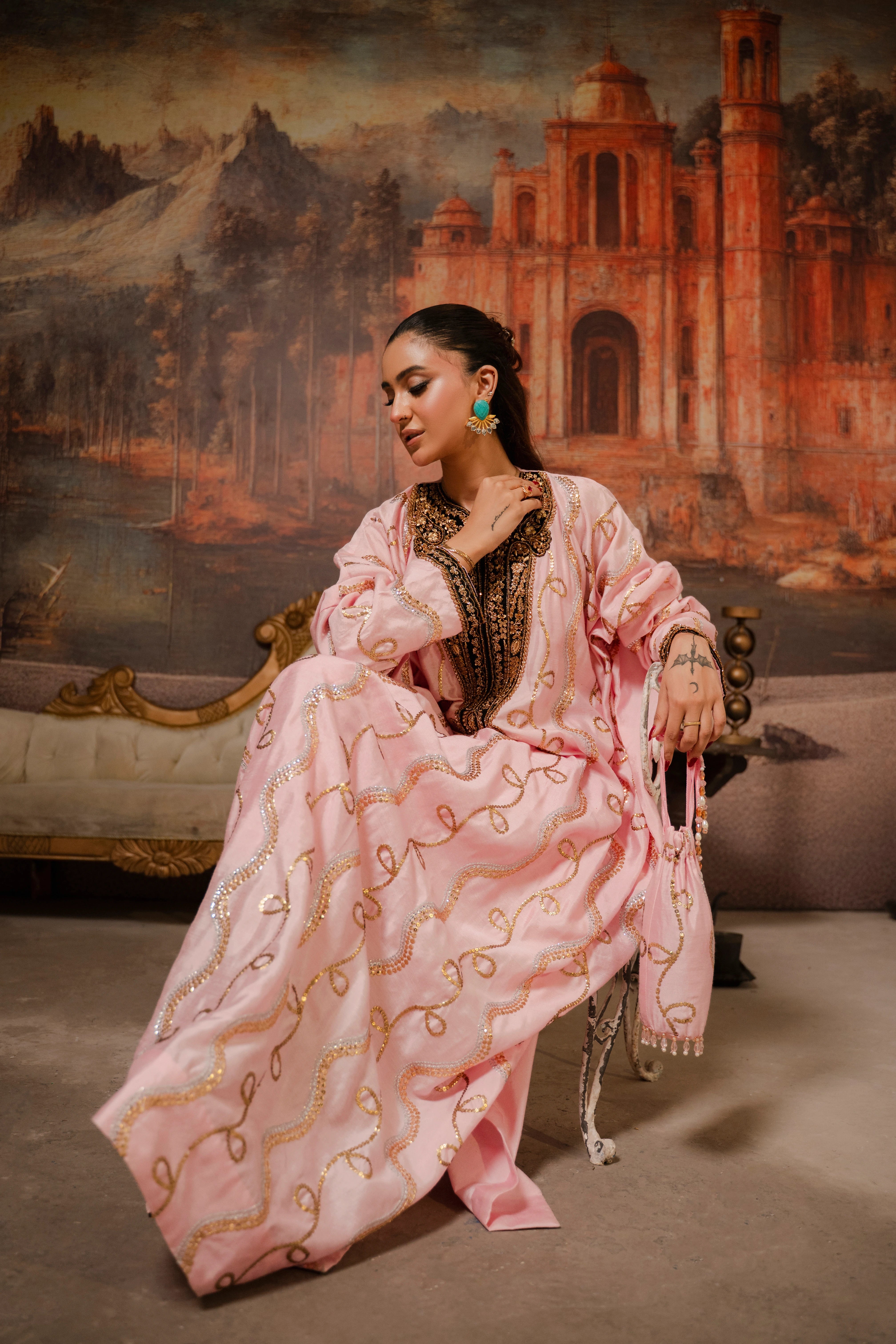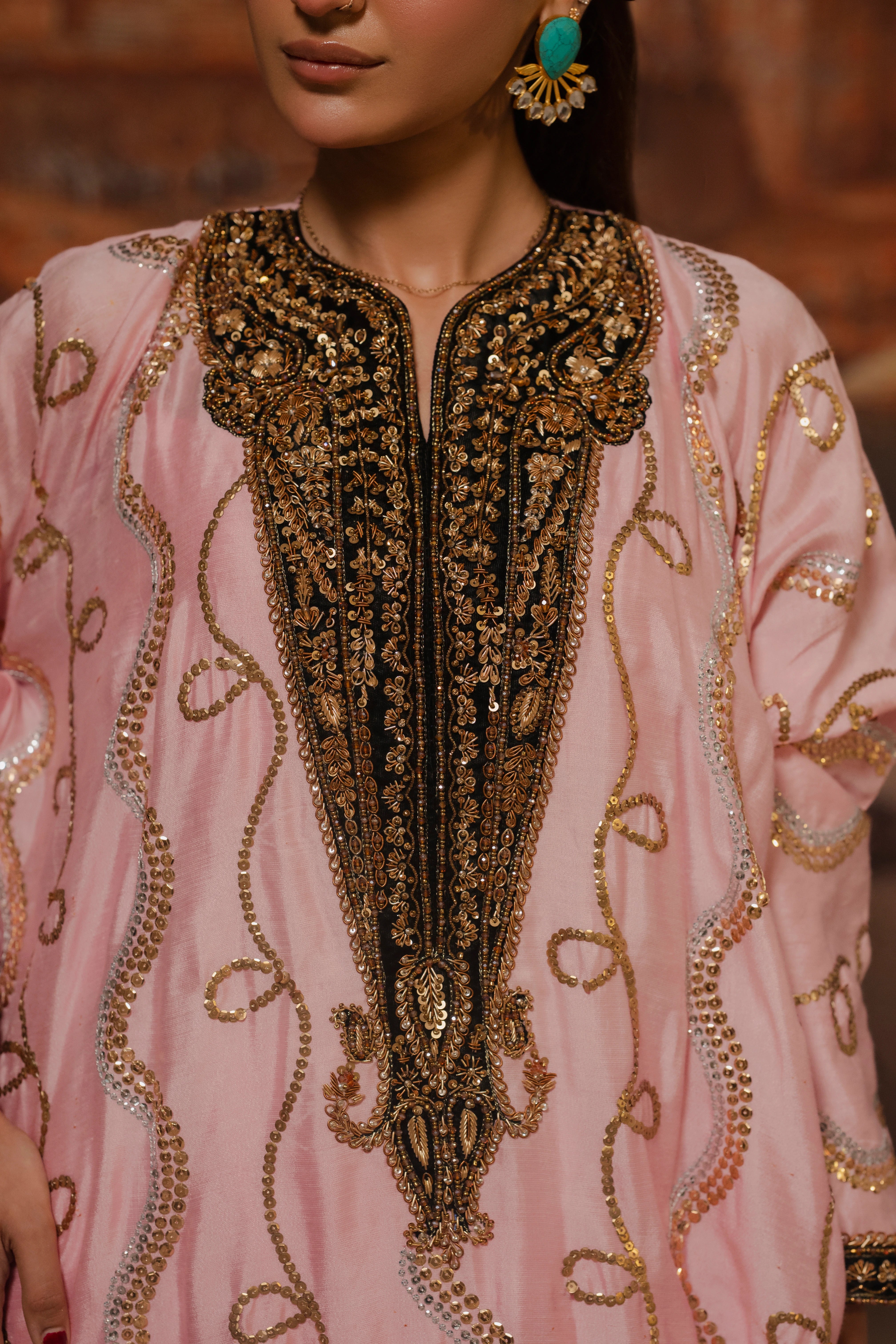 LIA - Festive Formal - VOL 3: Crafted from sheesha rawsilk, this candy floss hued kaftan is intricately adorned with sequins hand embroidery in gold and silver. The flowing silhouette features black appliquéd velvet accent neckline and sleeves hem, the V-shaped contrasting neckline and sleeve hem are embellished with sequin and zardoze handwork embroidery. Complete the look with matching cotton silk straight pants, striking a harmonious blend of tradition and understated elegance.
