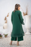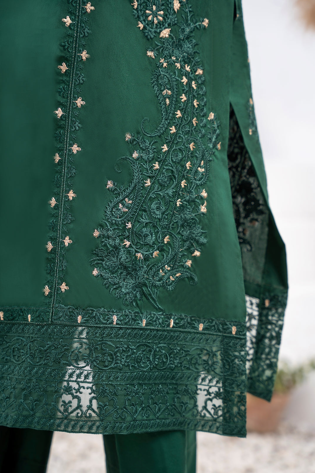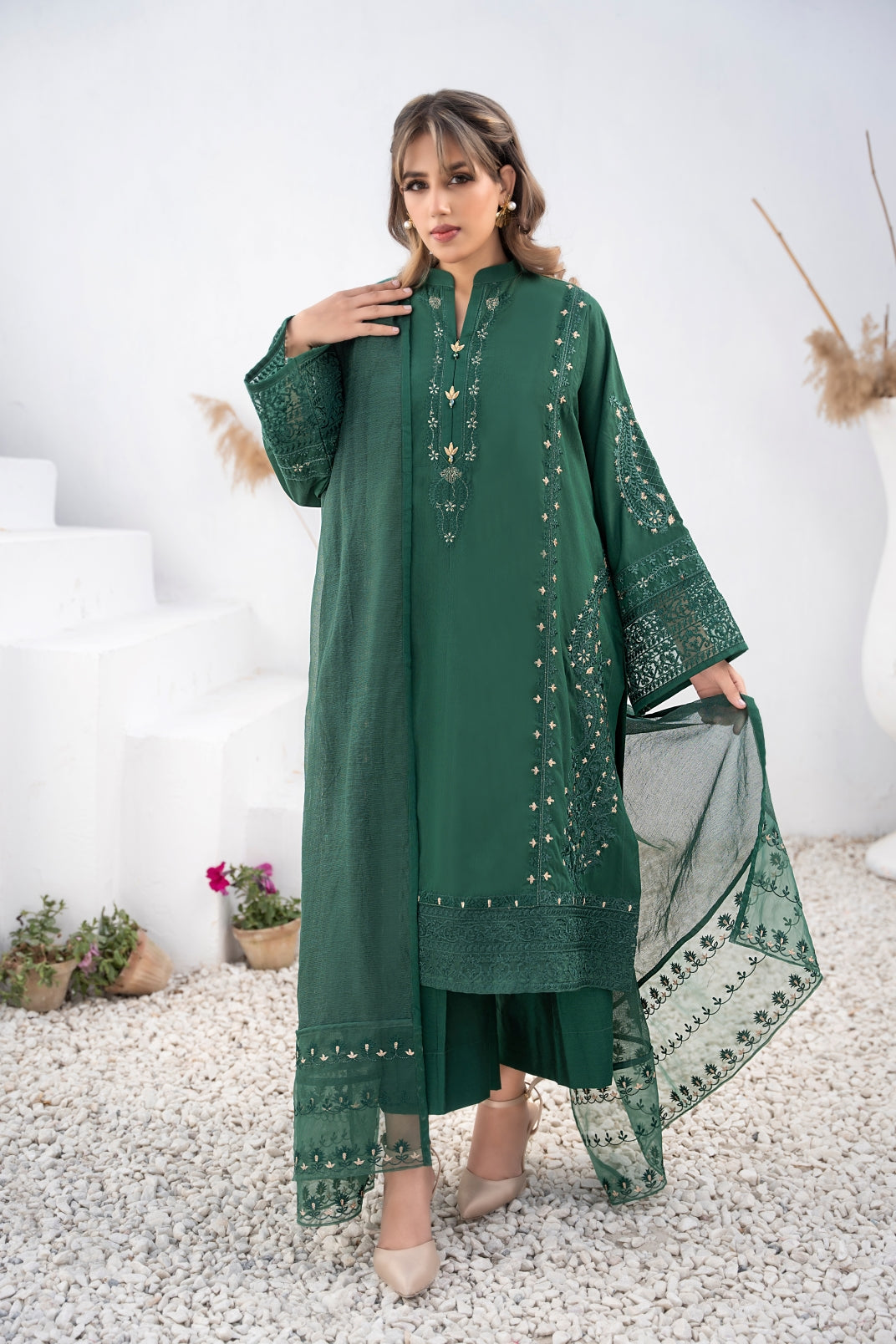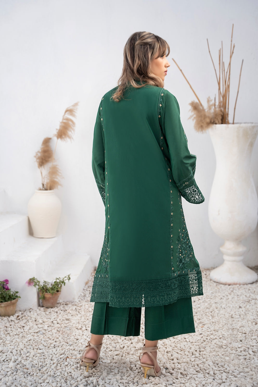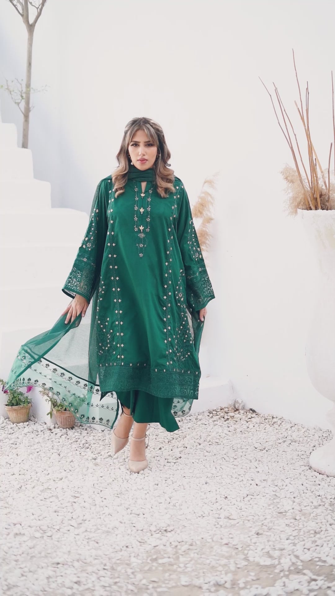 Melia'24: The ensemble features an emerald green katan silk long tunic with a cotton net dupatta featuring same coloured and zari thread with sequins motif embroidery all over. Embellished with hand-embroidered motifs on the neck. Paired up with a matching culottes to create an elegant and classic look.