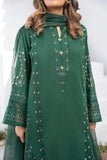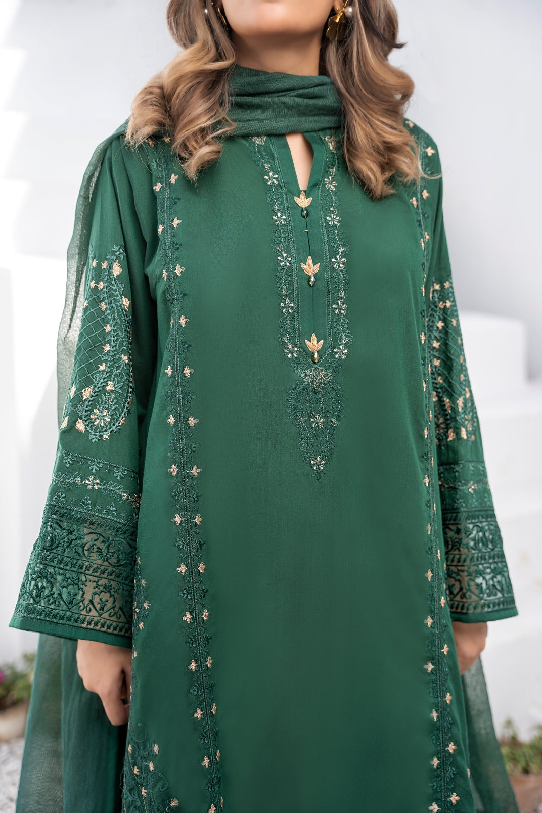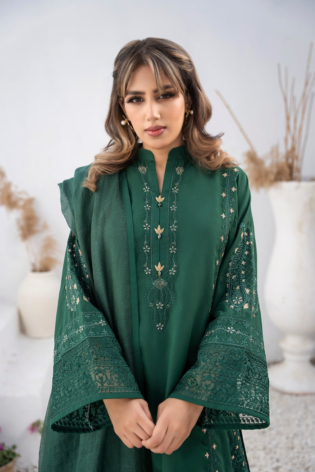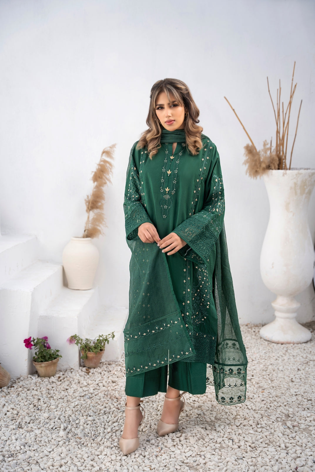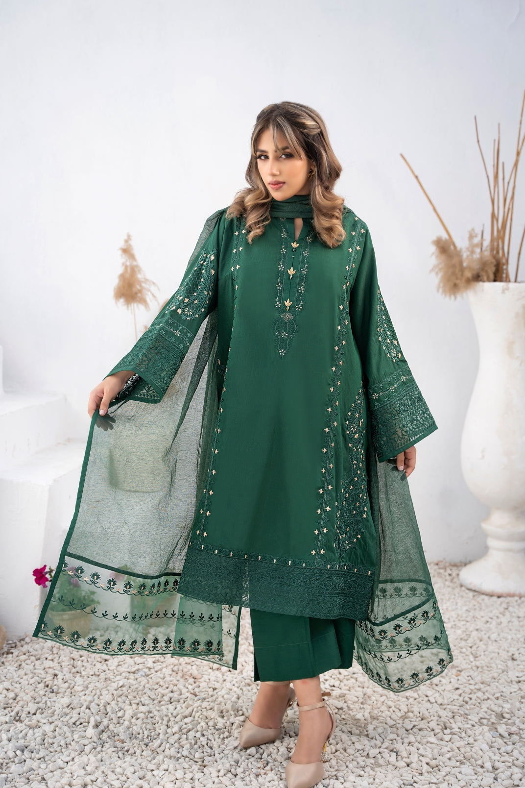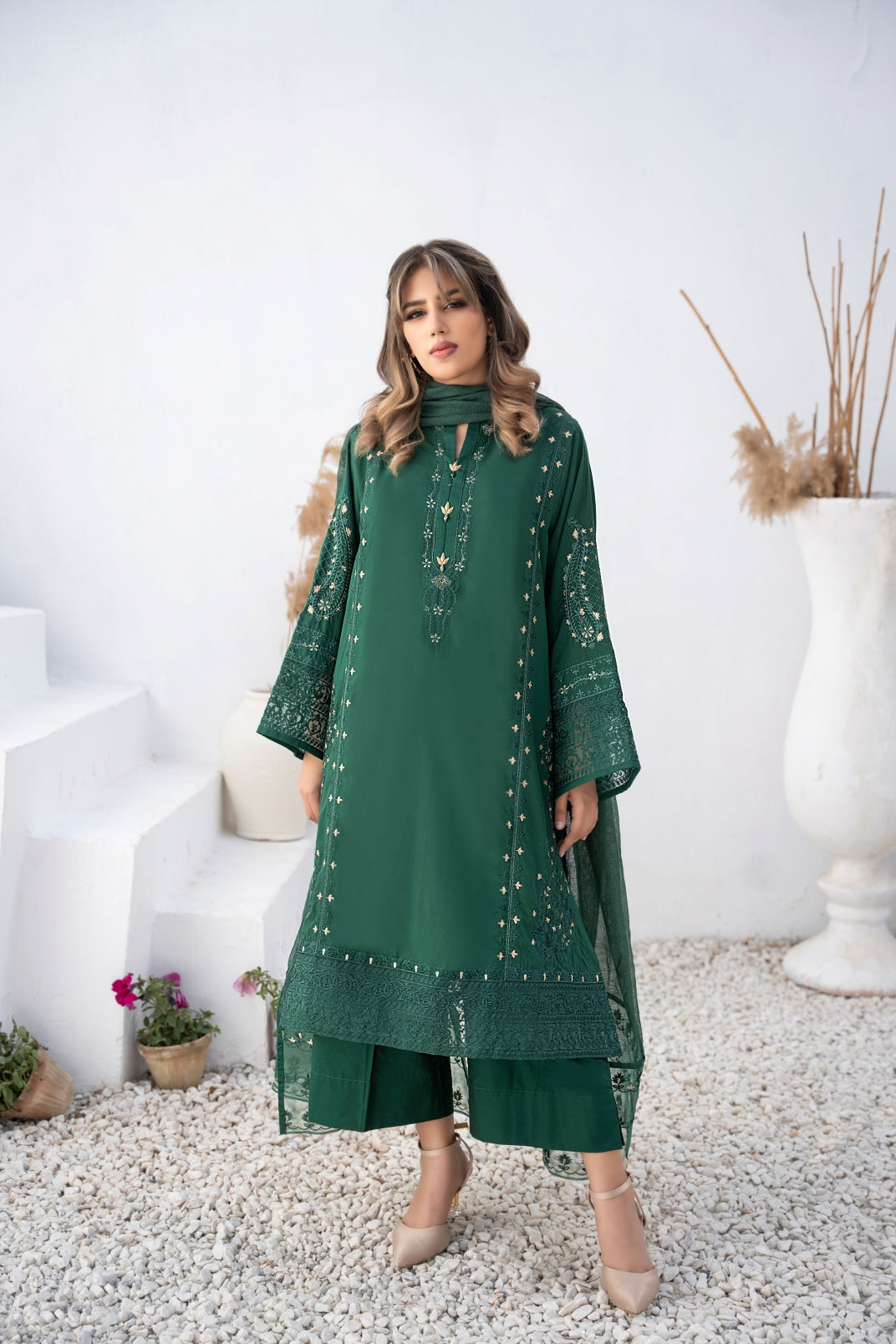 Melia'24: The ensemble features an emerald green katan silk long tunic with a cotton net dupatta featuring same coloured and zari thread with sequins motif embroidery all over. Embellished with hand-embroidered motifs on the neck. Paired up with a matching culottes to create an elegant and classic look.