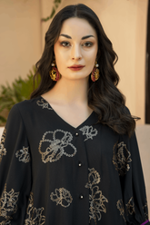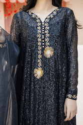 Black sequin shirt with head embroidery. A line side slit shirt adorned with pearls & sequins embroidery all over. Paired up with a bamboo raw silk culotte and slip. A perfect chic look for this festive season. Product Color: BLACK Luxury Pret Stitched 3 piece...- PKR 26,099