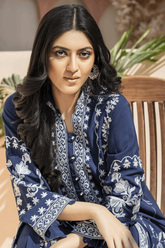 Denim blue pure cotton crepe georgette shirt with ivory and mint accent. A line front open shirt adorned with thread & sequins embroidery all over. Paired up with the same color embroidered culotte. A perfect chic look for this festive season. Product Color: Denim...- PKR 10,599