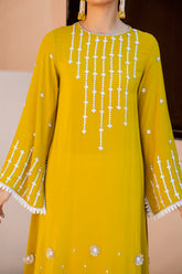 Canary yellow pure crepe georgette shirt with ivory accents. A line long tunic with slit sleeves adorned with thread, sequins, and pearls embroidery all over. Paired up with an ivory color jacquard fabric swirl Dhaka pajama and organza dupatta with ivory finishings. A perfect...- PKR 15,399
