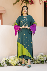 Emerald green pure crepe georgette shirt with magenta and olive green accents. A line long tunic with slit sleeves adorned with tila, sequins, and pearls with hand embroidery all over. Paired up with curved culottes. A perfect chic look for this festive season. Product...- PKR 13,299