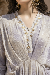 Pastels tie dye sequins net kaftan with mint and lavender accents. Kaftan is adorned with tile, sequins, and pearls' hand embroidery neckline. Paired up with a long underslip. A perfect chic look for this festive season. Product color: Lilac & Ivory Luxury Pret Stitched...- PKR 19,000