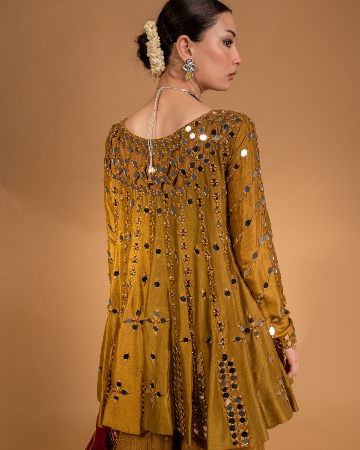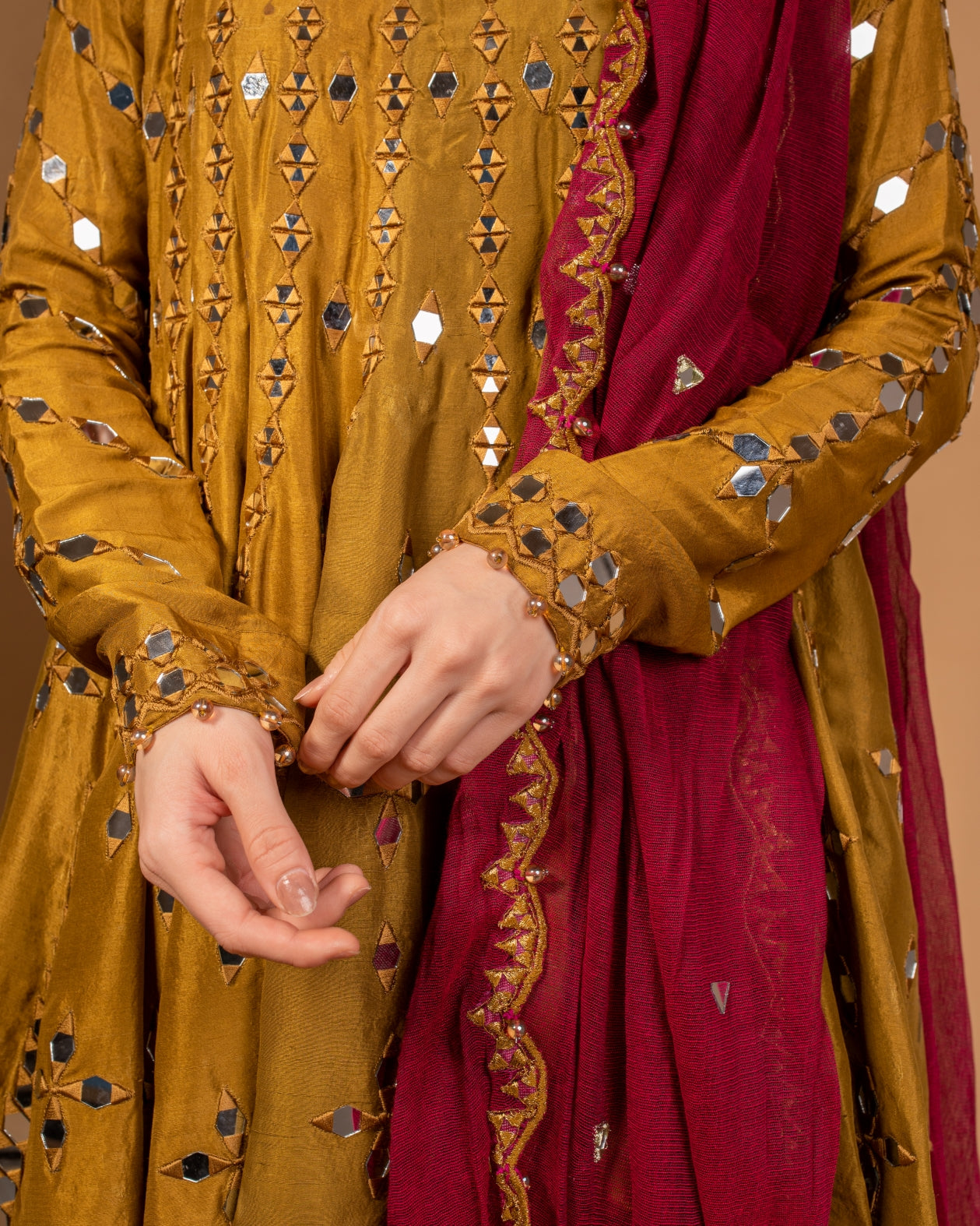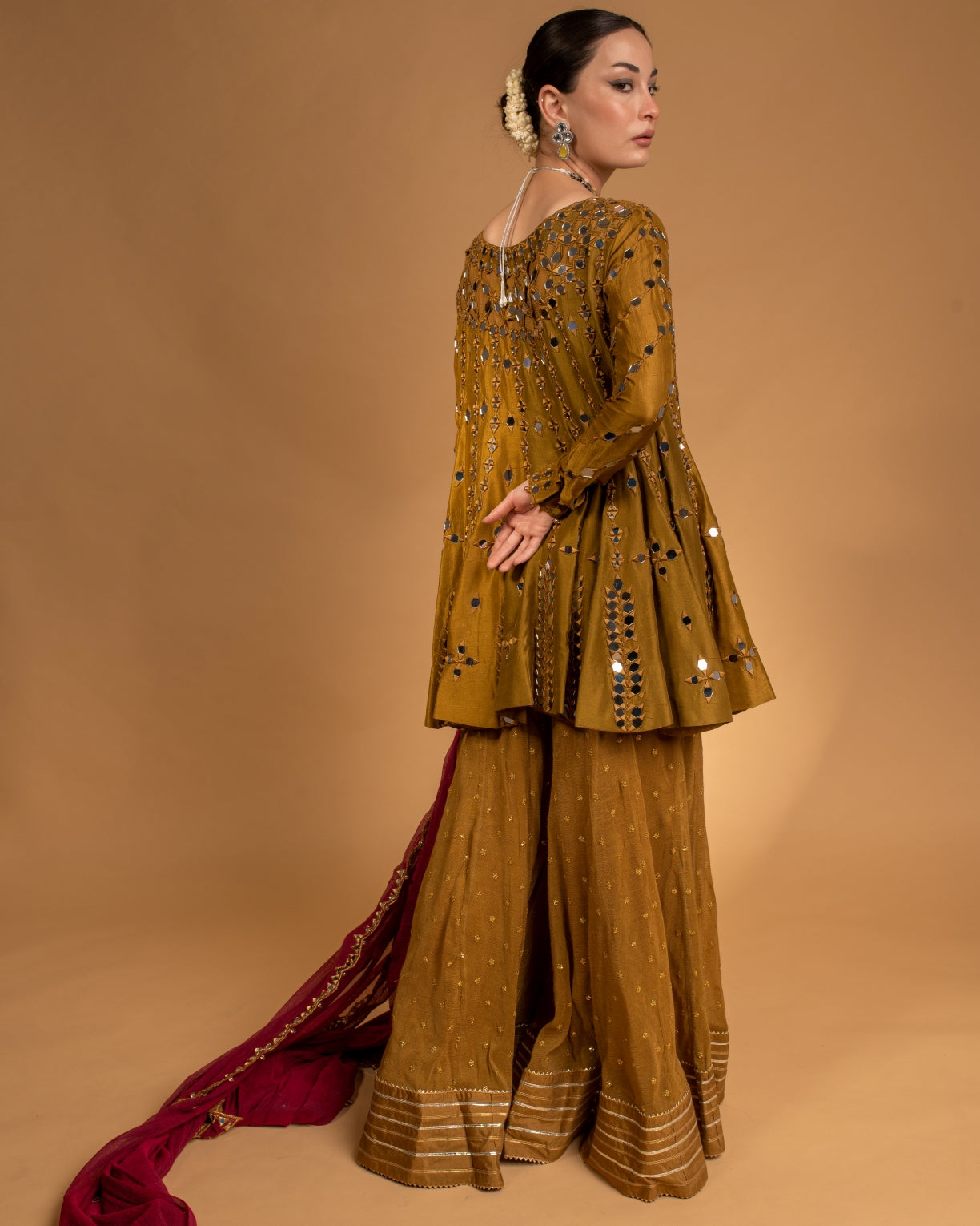 Heer’22: Mahi(MHW5): This olive green rawsilk heavily worked short kalidar is a modern take on a traditional silhouette with its same coloured mirrorwork embroidery all over. The piece is paired with a magenta colour cotton net banarsi dupatta with over all mirror work and scalloped borders.Paired it with olive coloured banarsi cotton net Dhaka pajama with gota details. This wedding season our collection redefines fall fashion and supplants eastern women to dress for the upcoming festive season in style.