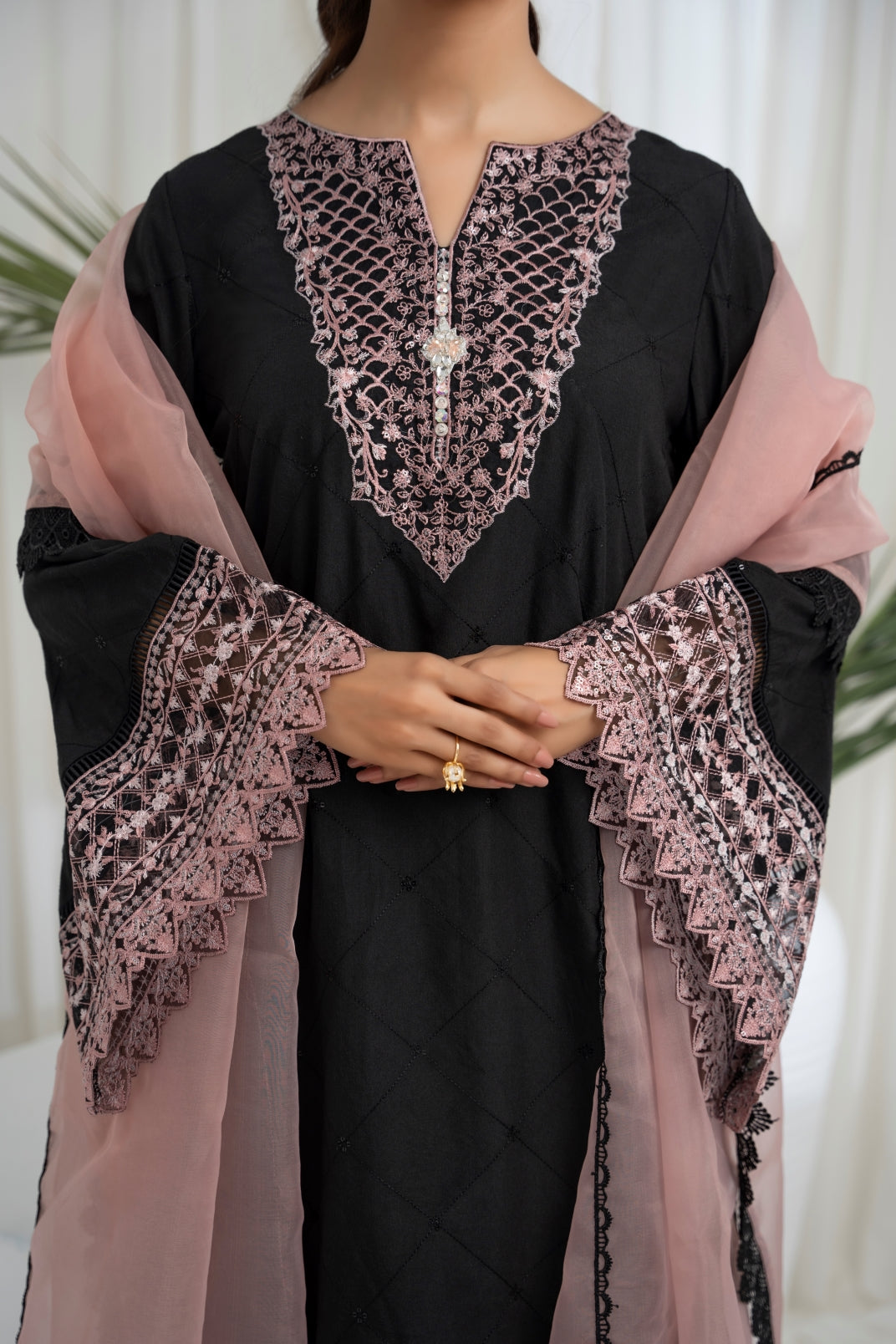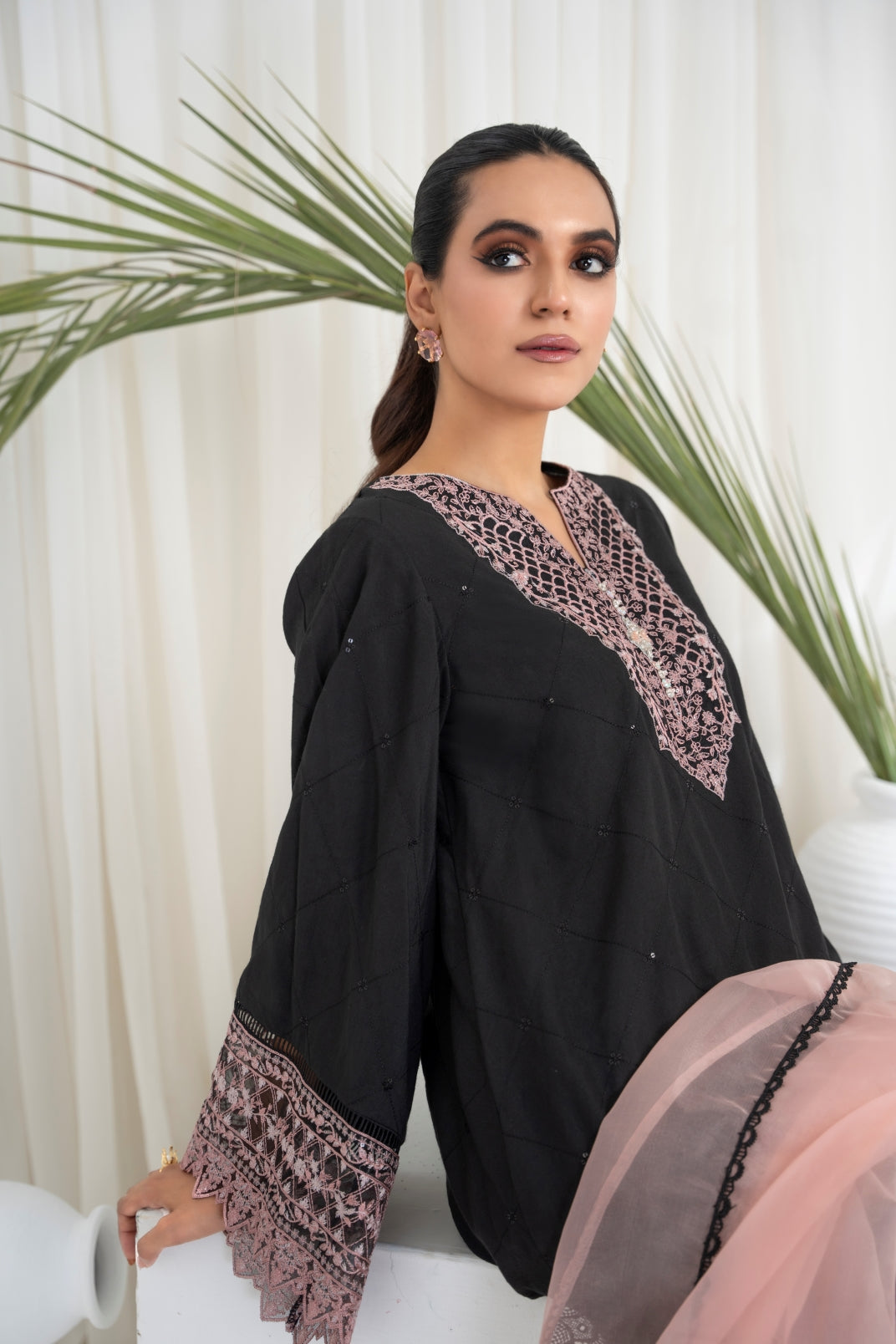 The ensemble features a black short-length, A-line silk cotton tunic with flared sleeves. Embellished with contrasting tea pink cutwork thread embroidery on neck and sleeves and self thread and sequins embroidery all over. Finished with hand embroidered motifs and beads. Paired up with a matching thread embroidered culottes to create an elegant and timeless look.