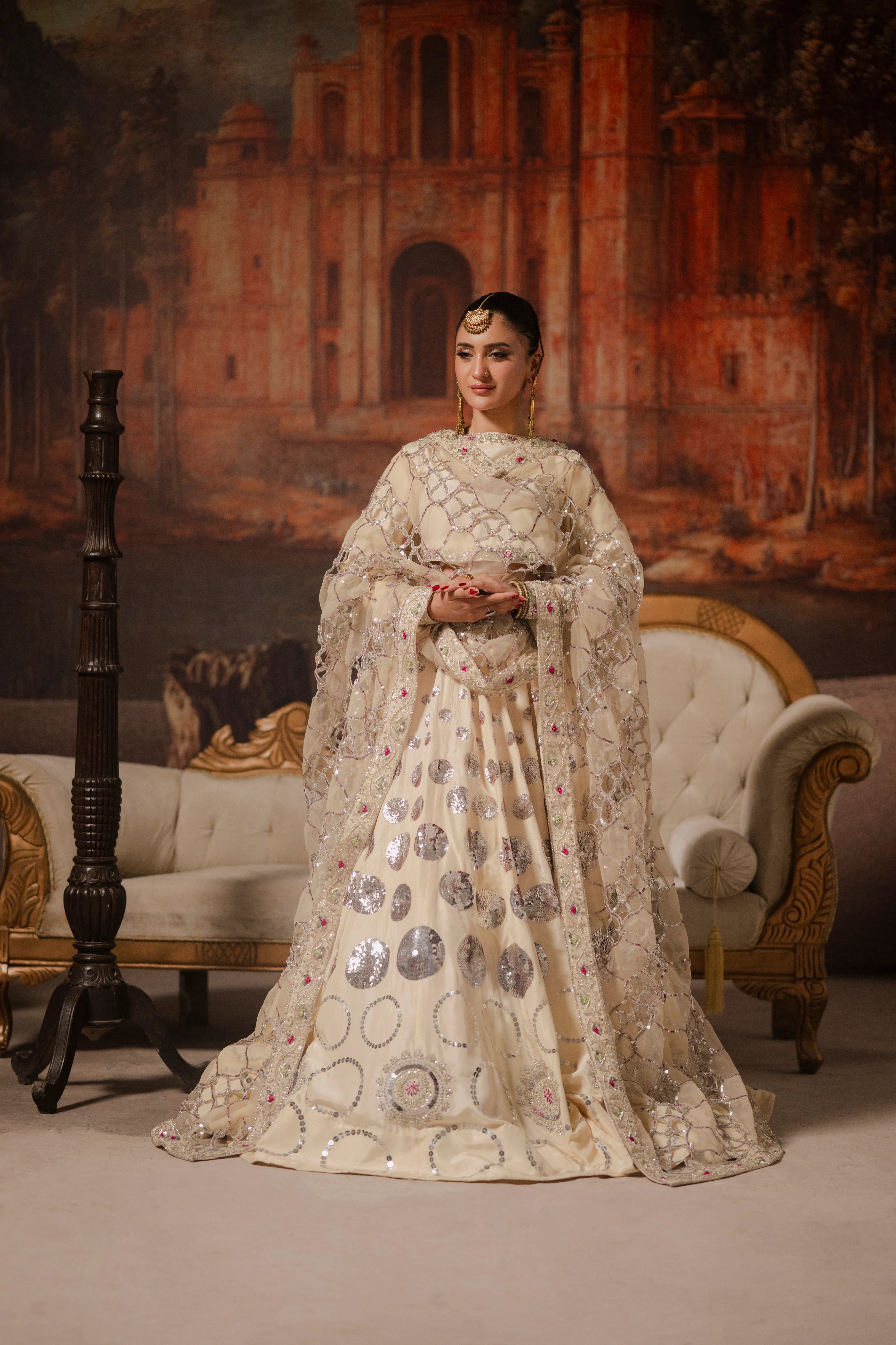 LIA - Festive Formal - VOL 3: A glamorous pale butter yellow hued Korean rawsilk choli with open back is elevated with a organza cutwork and hand embroidered dupatta, resplendent in a floral border embroidered with zardoze and accent resham details. The korean rawsilk matching voluminous lehenga, fully hand embroidered sequin circles and zardoze motifs. The choli is adorned with delicate embroidery creating a floral border of zardoze, resham, and glistening sequins on the choli; evoking a timeless charm.