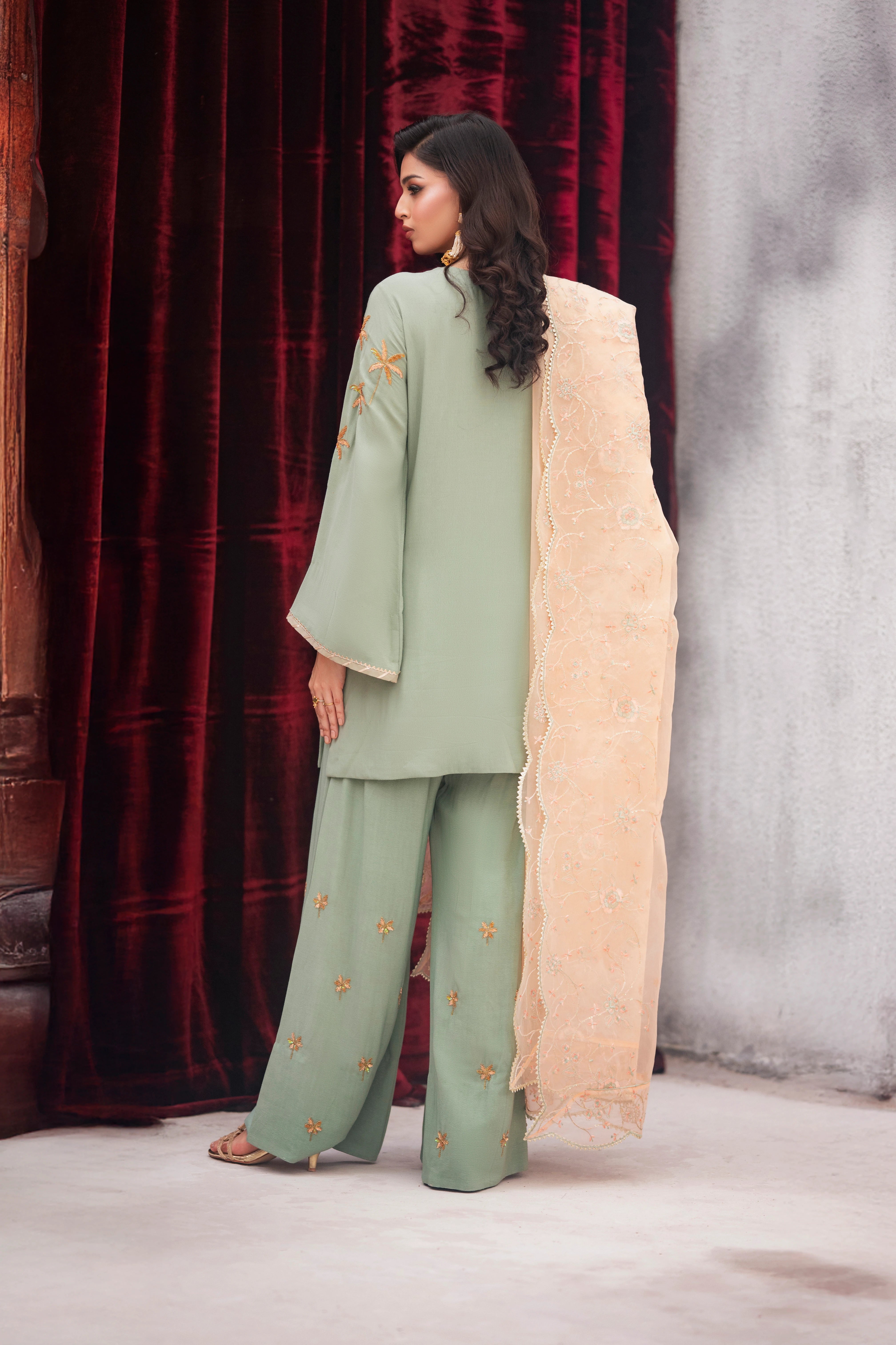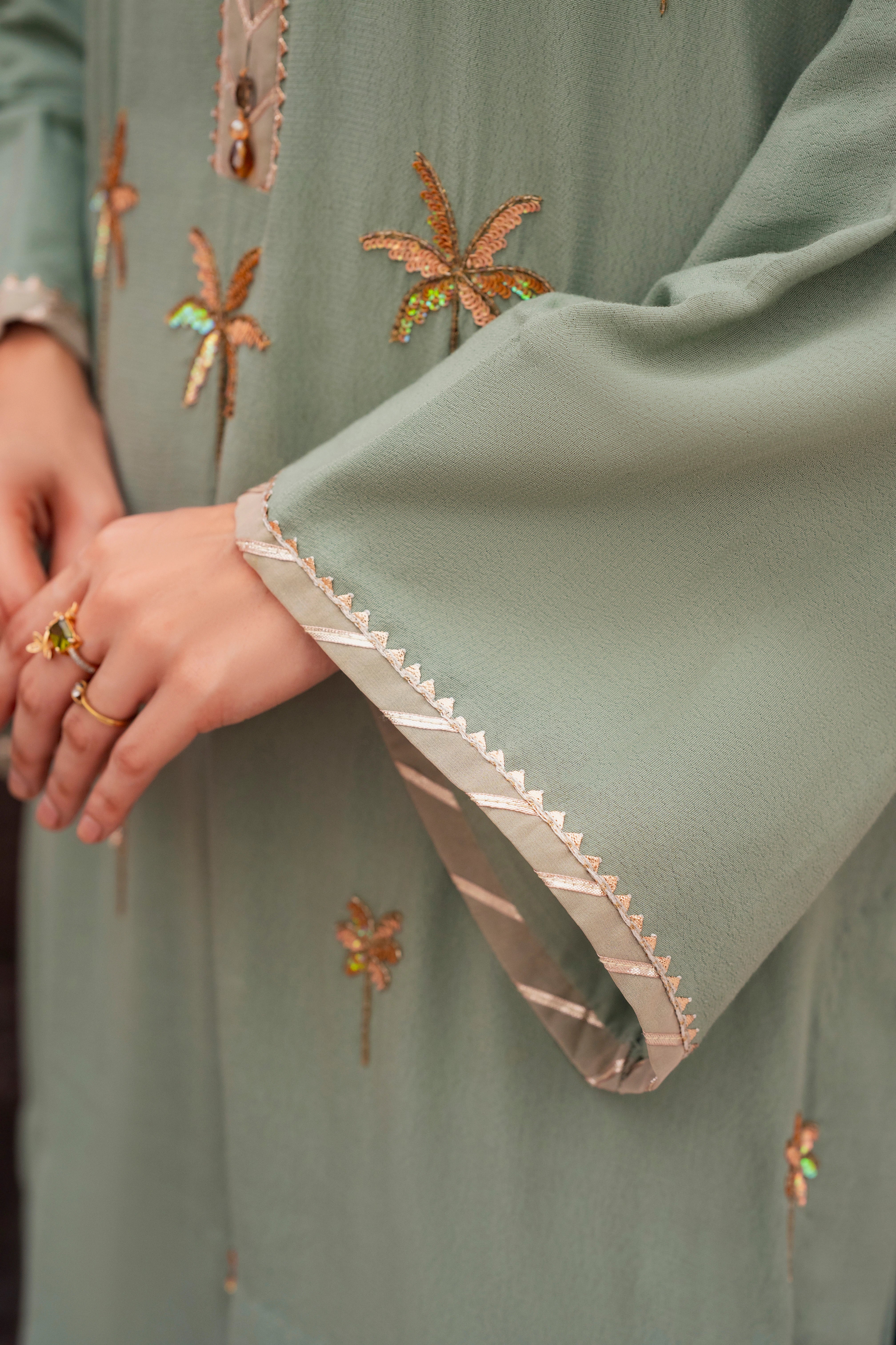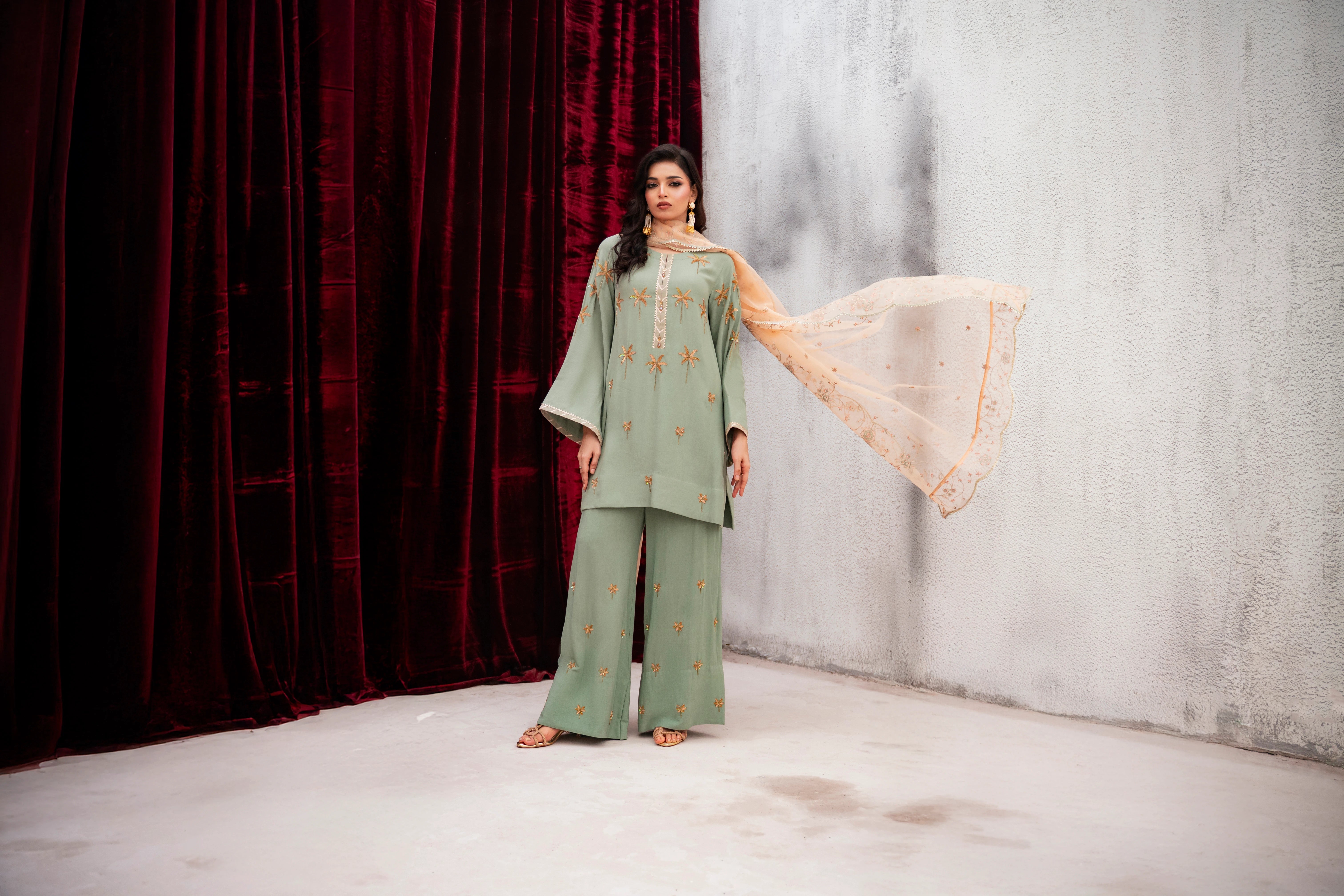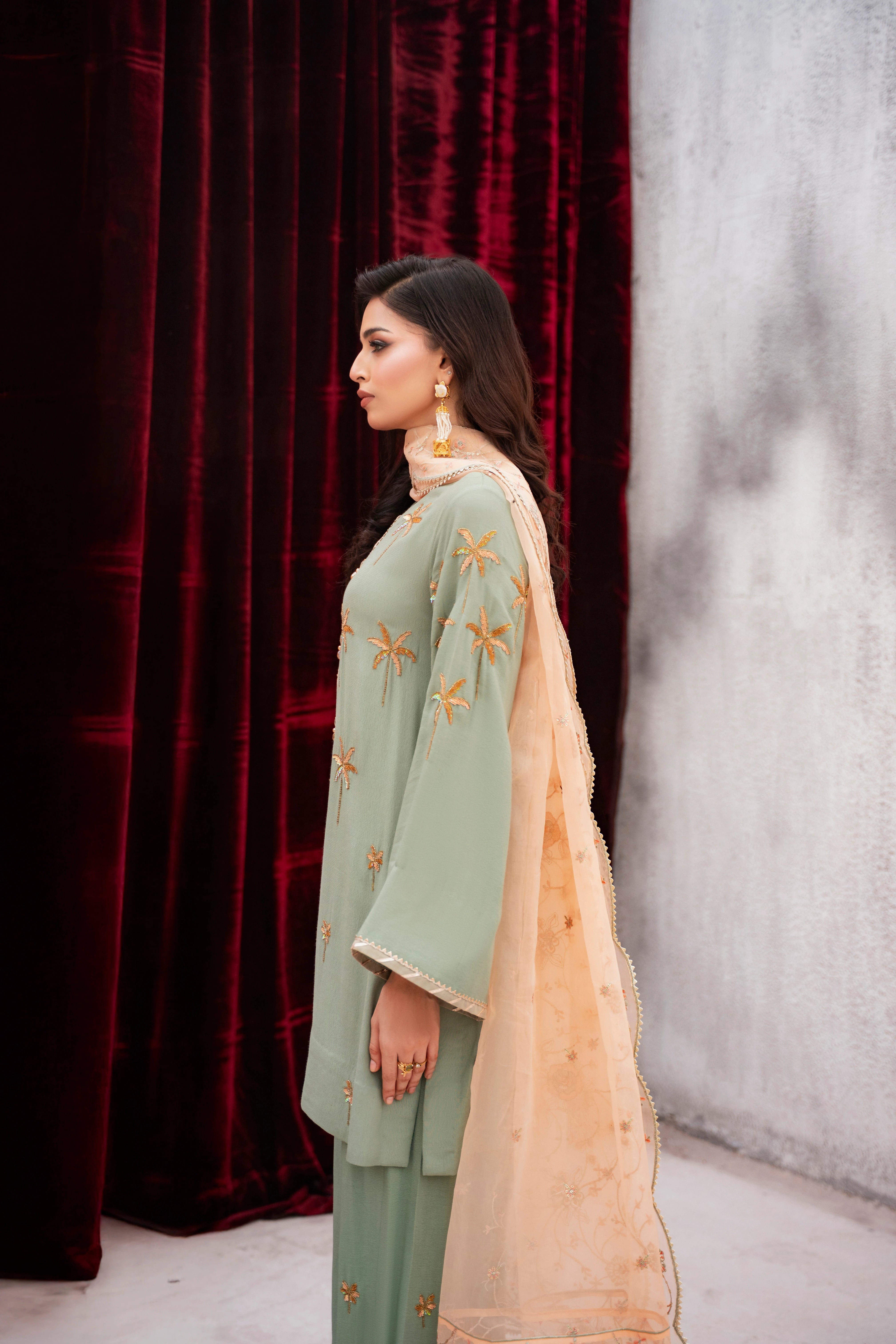 LIA - Festive Formal - VOL 2: A sage green ensemble shimmering with artisanal finesse. A crepe georgette short shirt, cut in a timeless straight A-line silhouette, is lavishly embroidered with cutdana in palm trees motifs, finished with gota and organza on sleeves hem and neck. Paired with tailored crepe georgette culottes featuring intricate palm tree motifs in cutdana embroidery. The peach airy organza dupatta, adorned with contrasting thread and gold sequins embroidery, gota lace finishing and delicate scalloped edging, drapes like a whisper of regality.