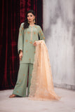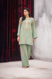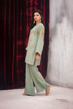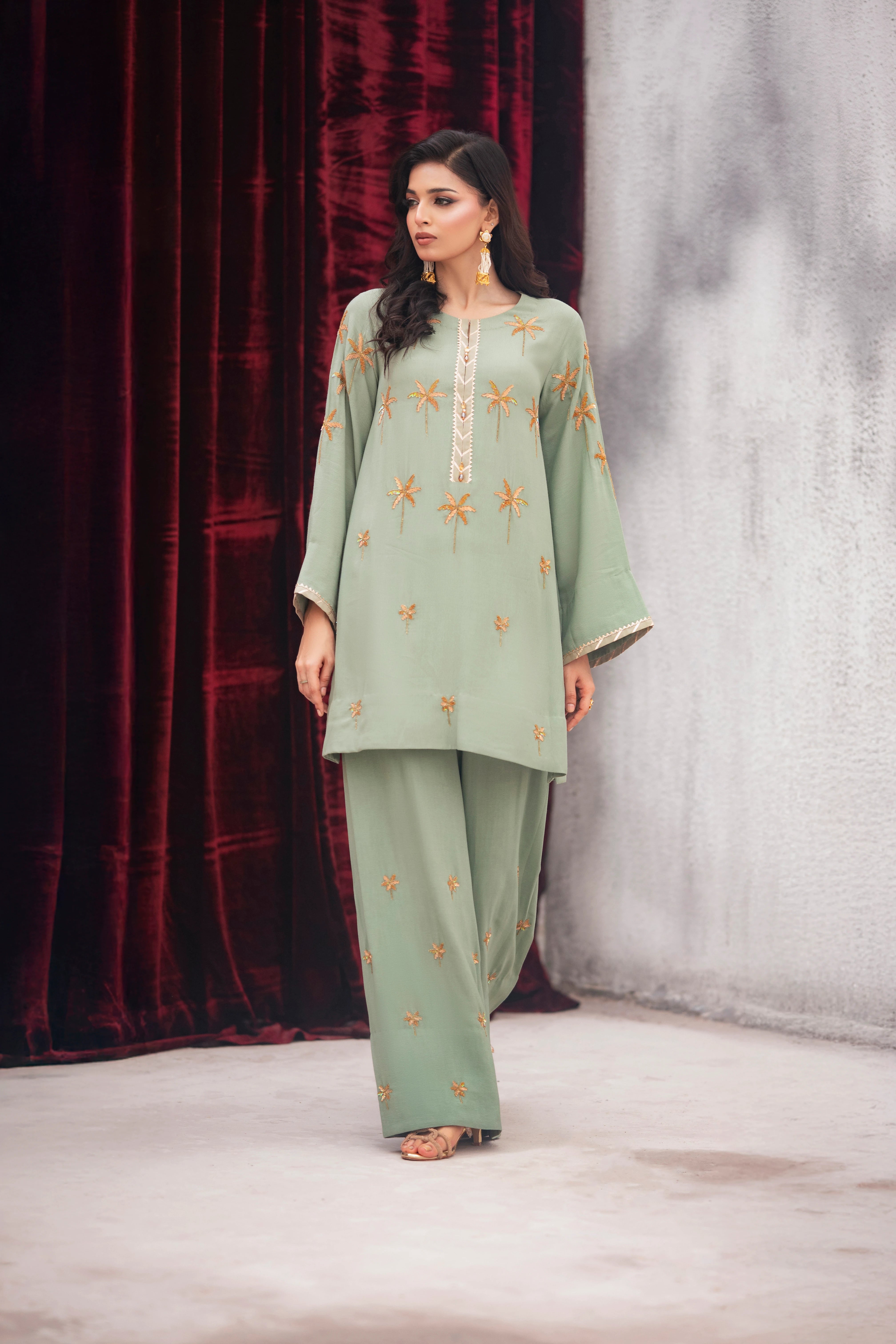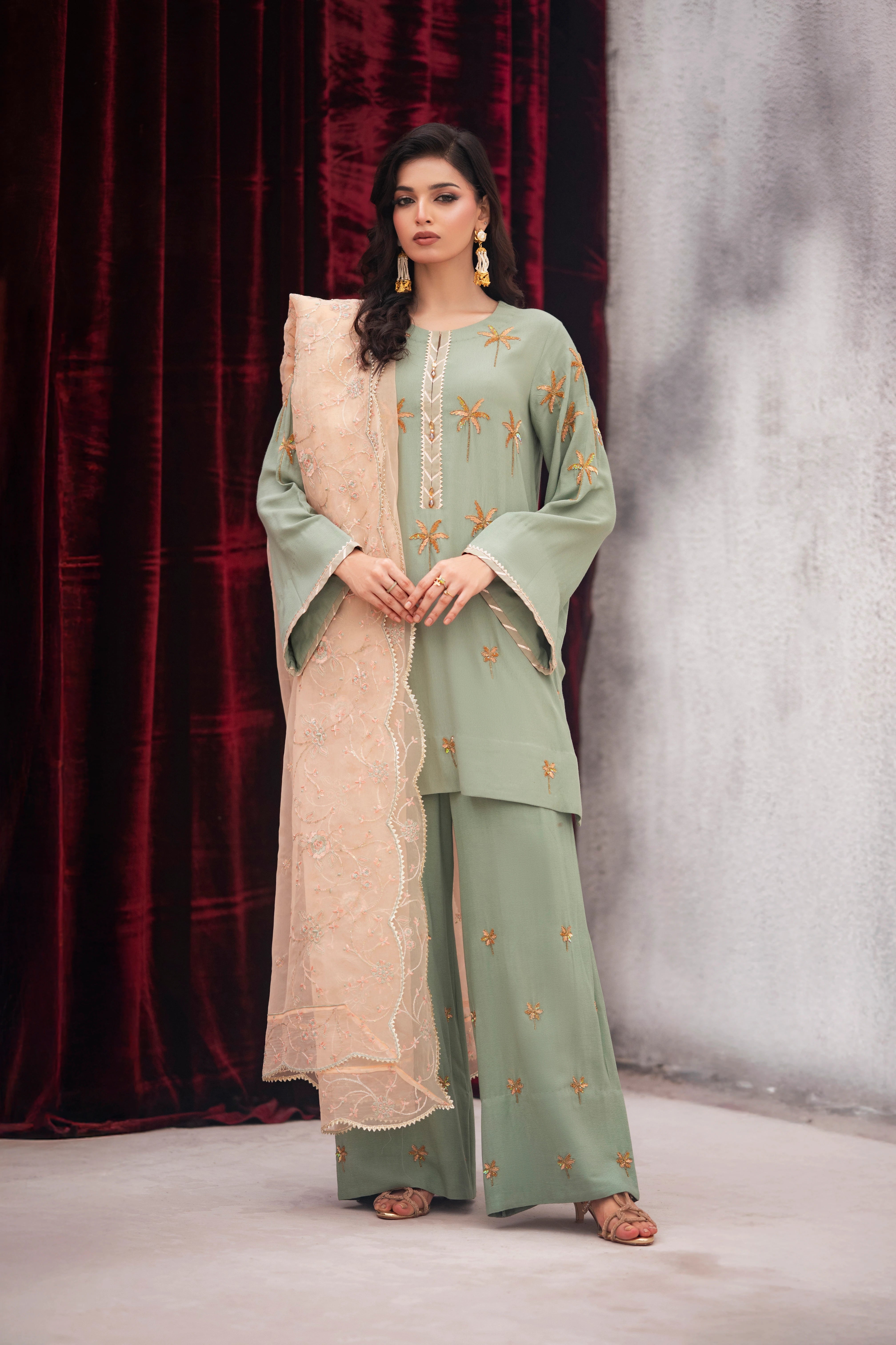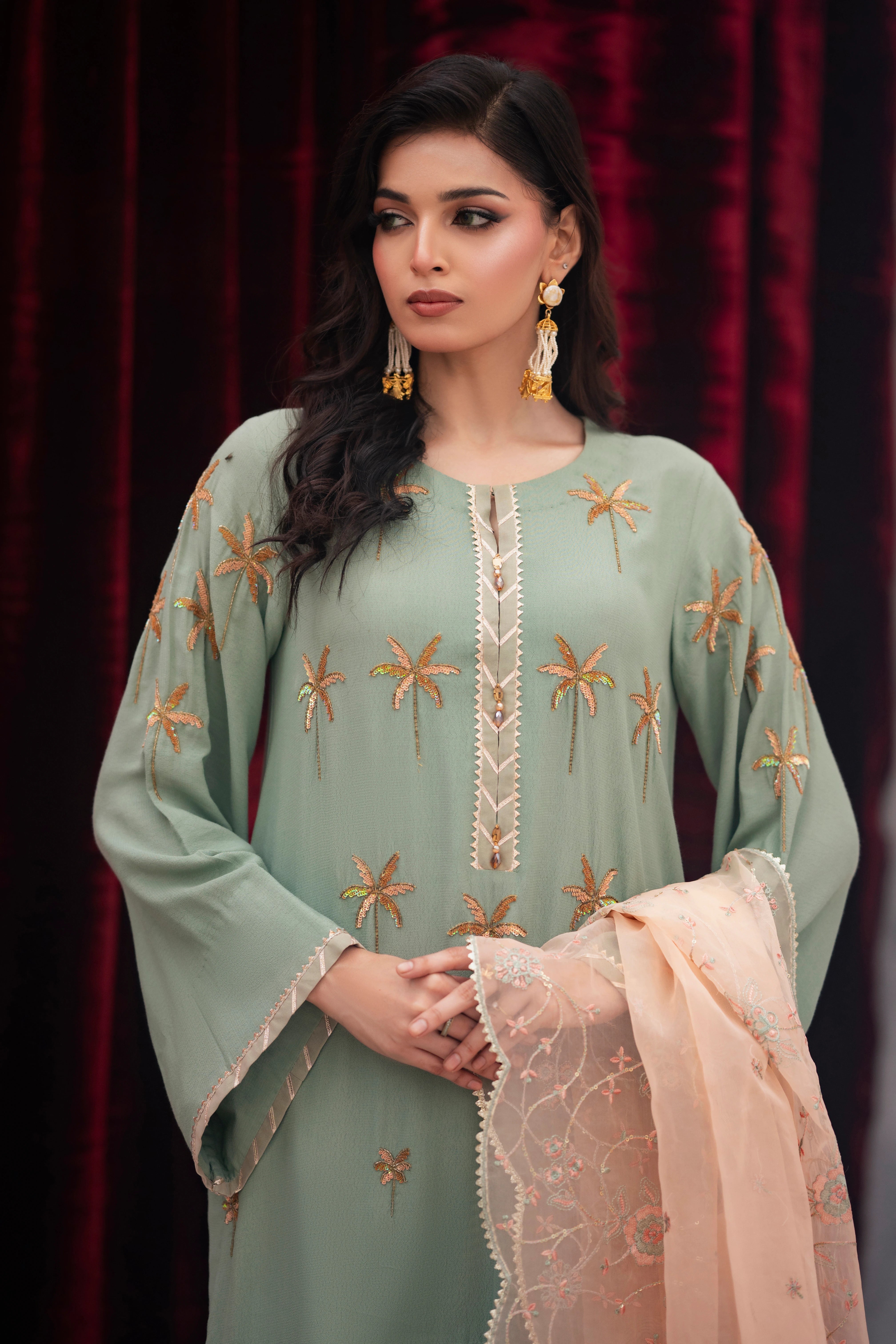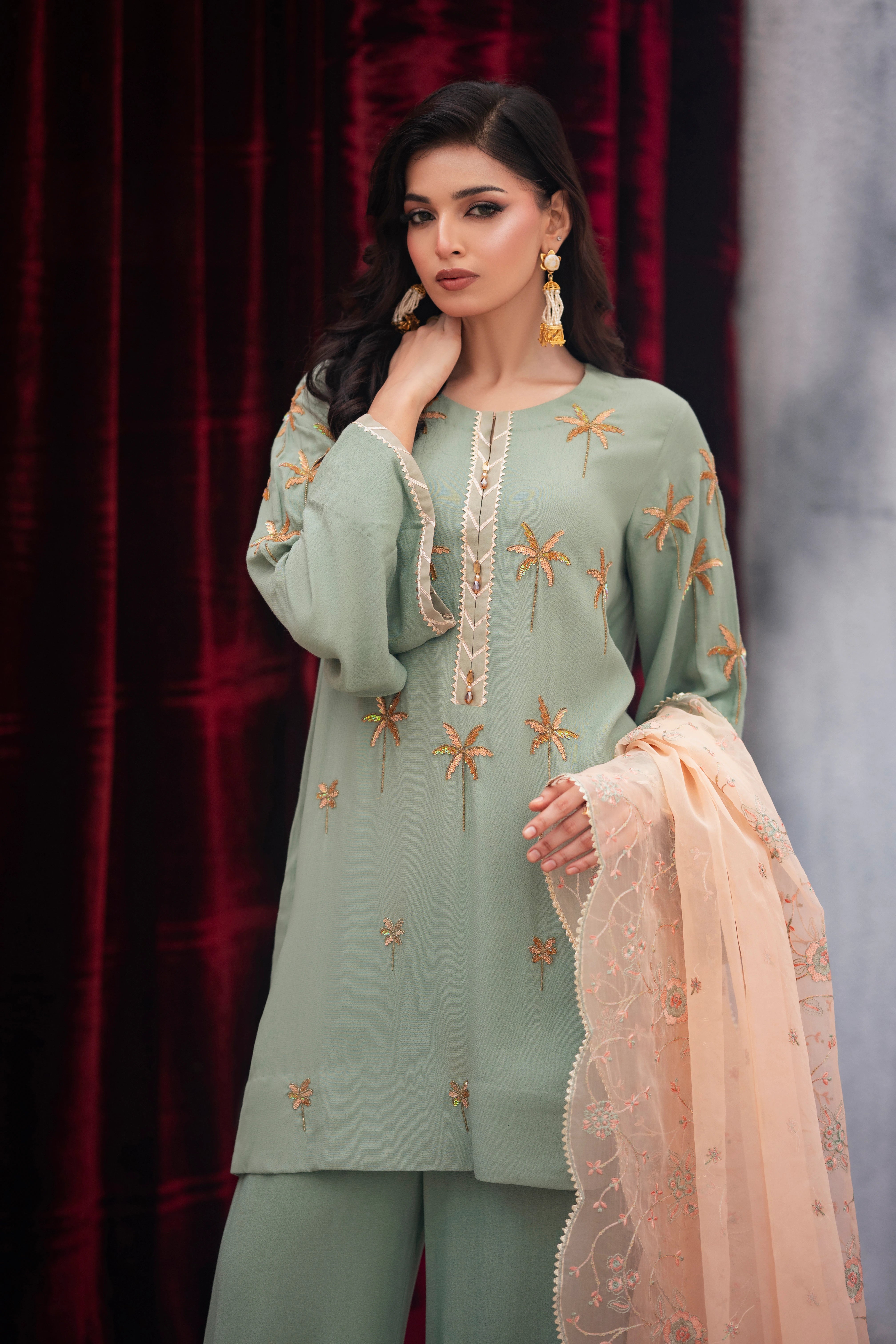 LIA - Festive Formal - VOL 2: A sage green ensemble shimmering with artisanal finesse. A crepe georgette short shirt, cut in a timeless straight A-line silhouette, is lavishly embroidered with cutdana in palm trees motifs, finished with gota and organza on sleeves hem and neck. Paired with tailored crepe georgette culottes featuring intricate palm tree motifs in cutdana embroidery. The peach airy organza dupatta, adorned with contrasting thread and gold sequins embroidery, gota lace finishing and delicate scalloped edging, drapes like a whisper of regality.