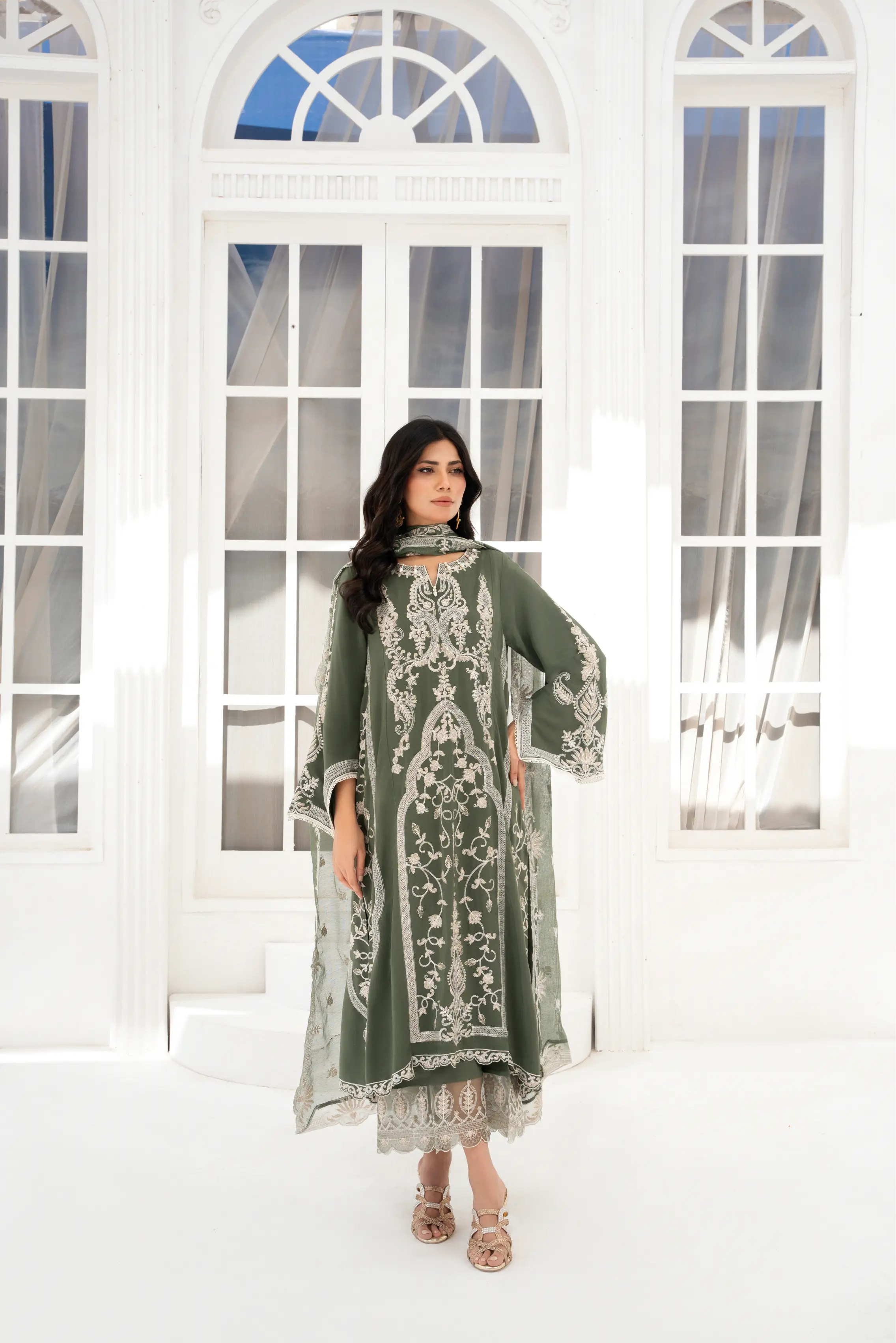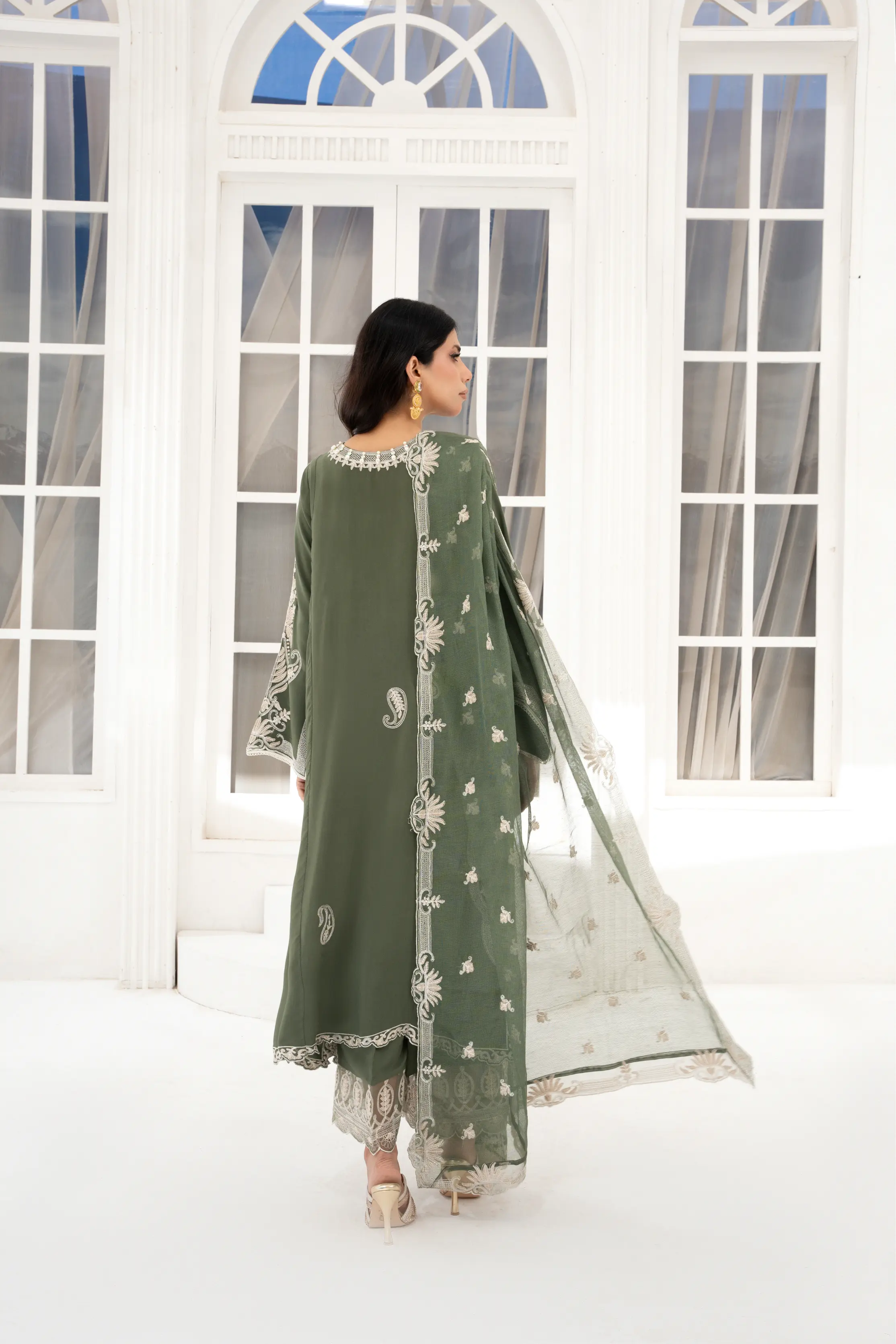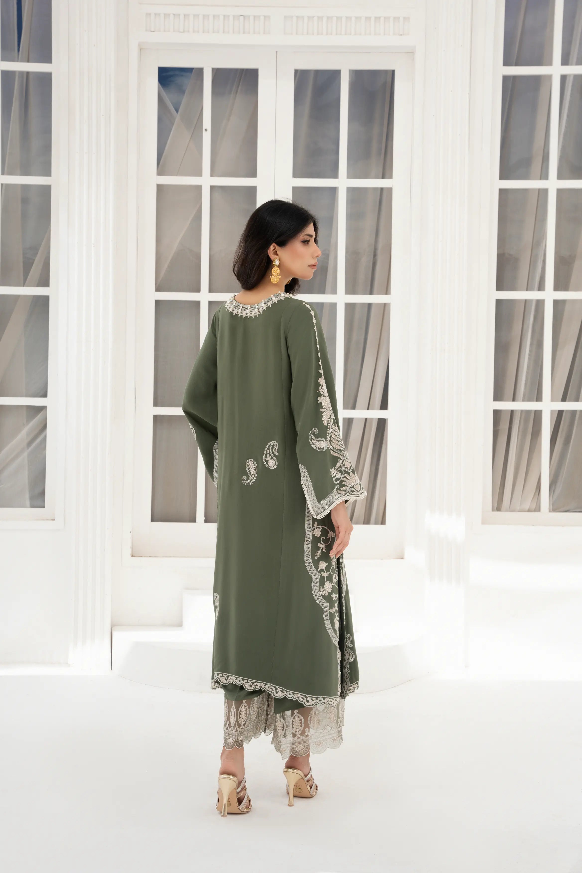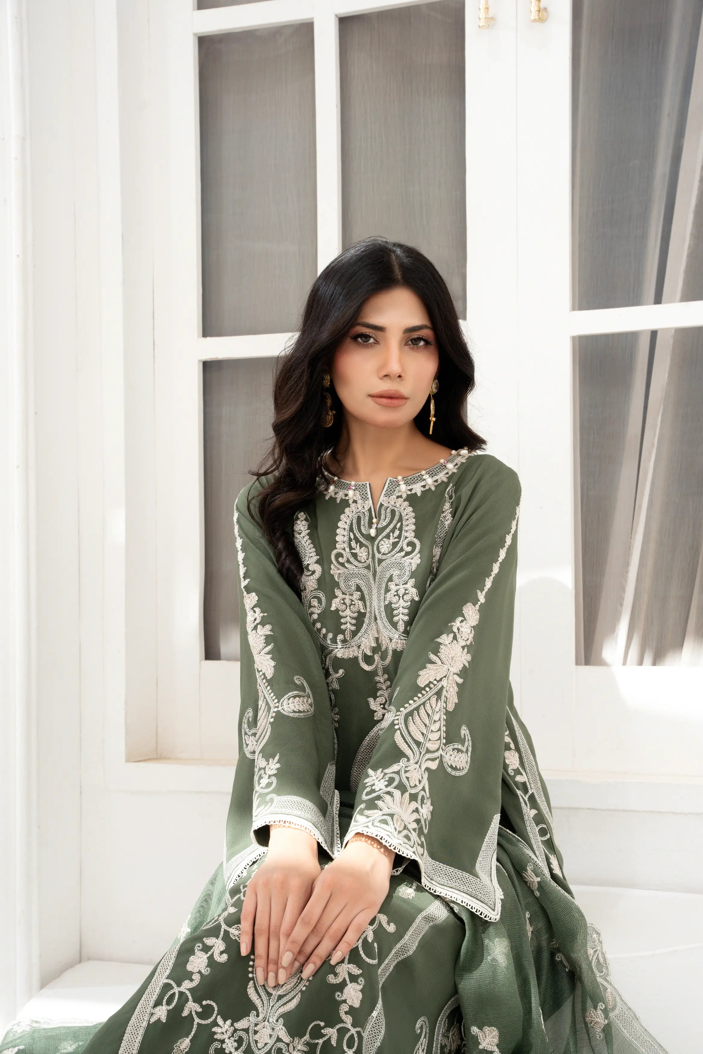 FLORA & FAUNA - Eid Festive: A sage green crepe georgette long A-line shirt with round neck features detailed ivory thread and sequins embroidery. Slit sleeves with lace finishing. Pearls and beads finishing on the neckline. Sage green crepe georgette culotte embellished with embroidered organza on the edges. Paired with sage green cotton net dupatta adorned with thread and sequins embroidery.