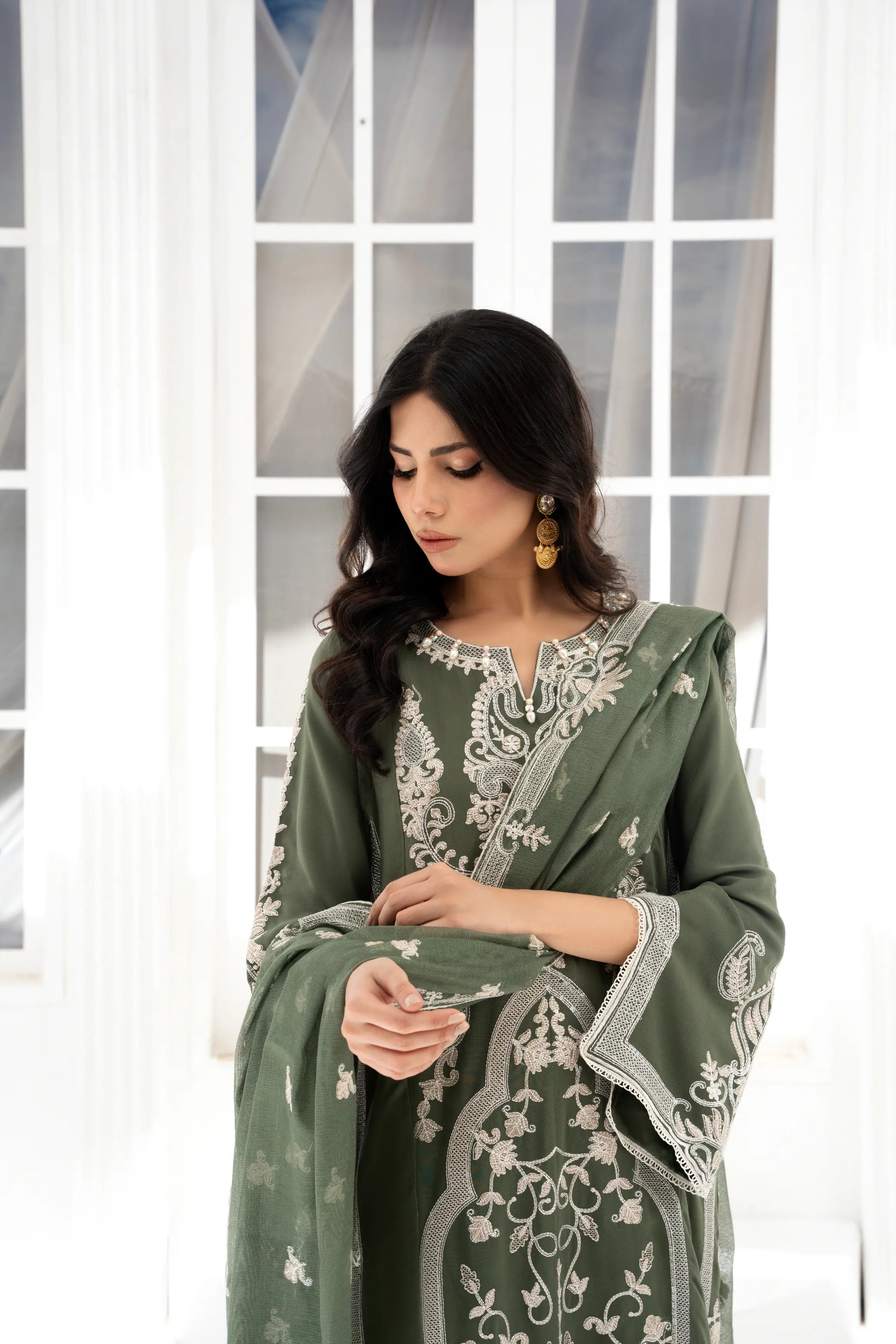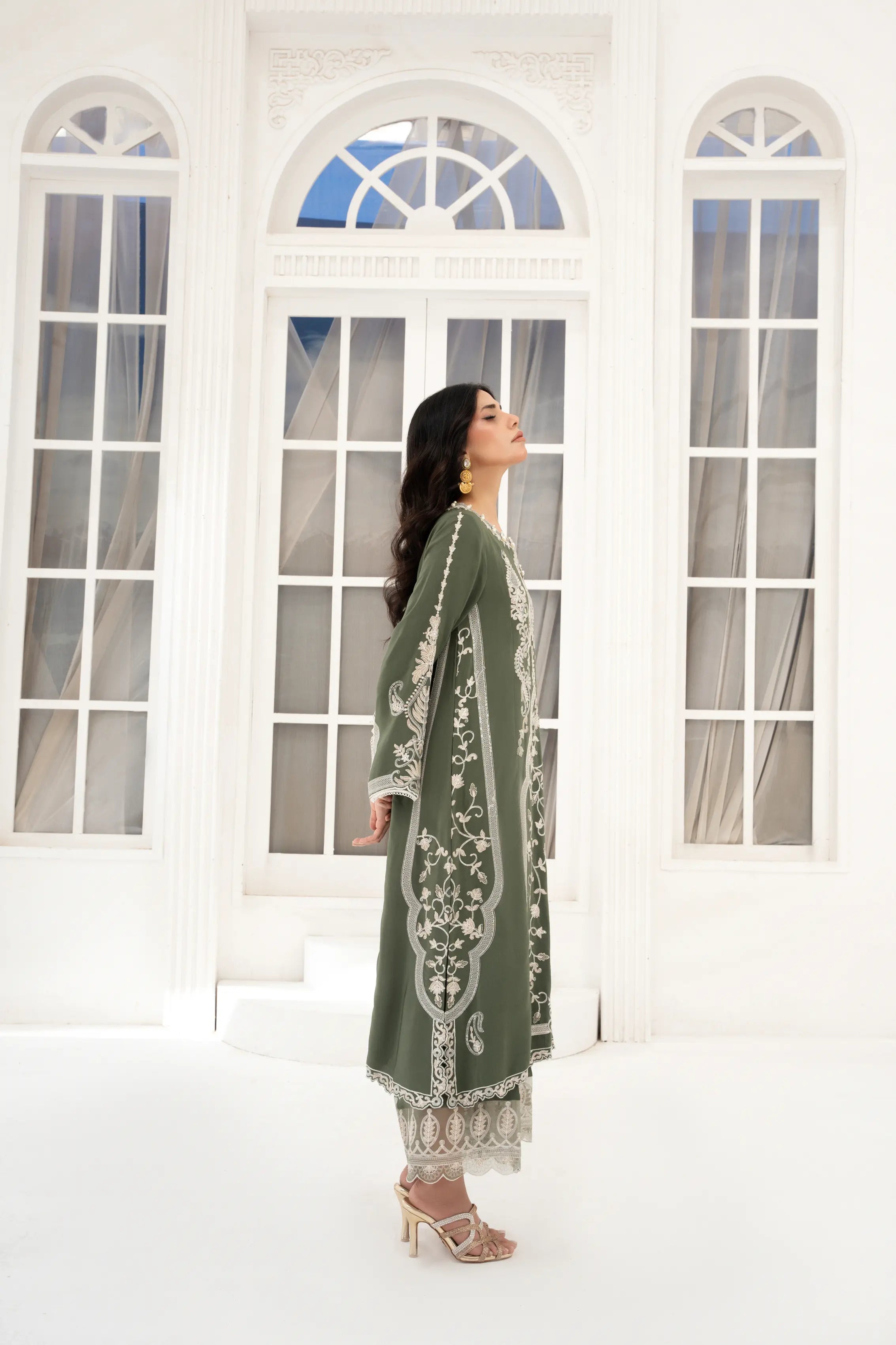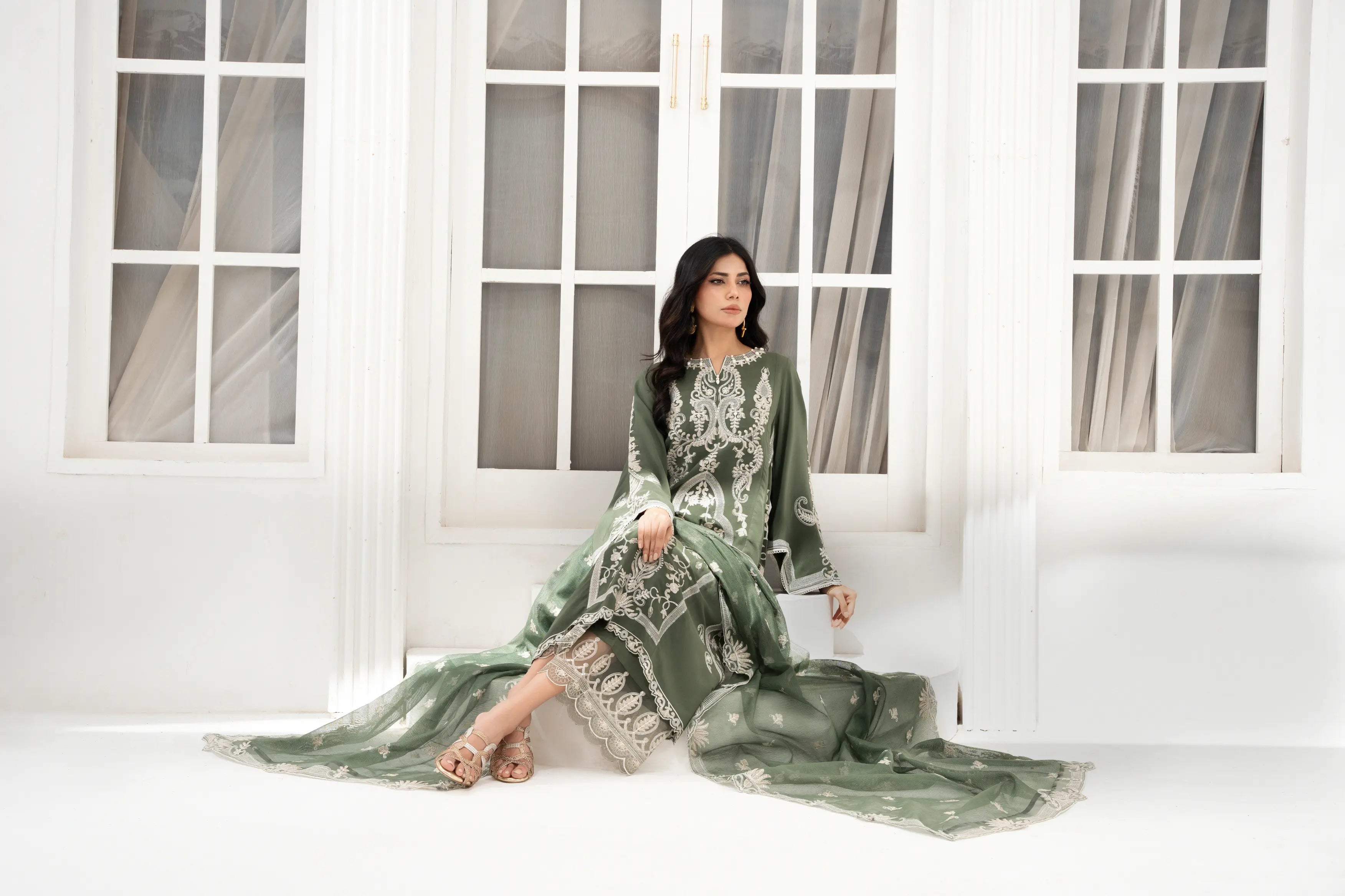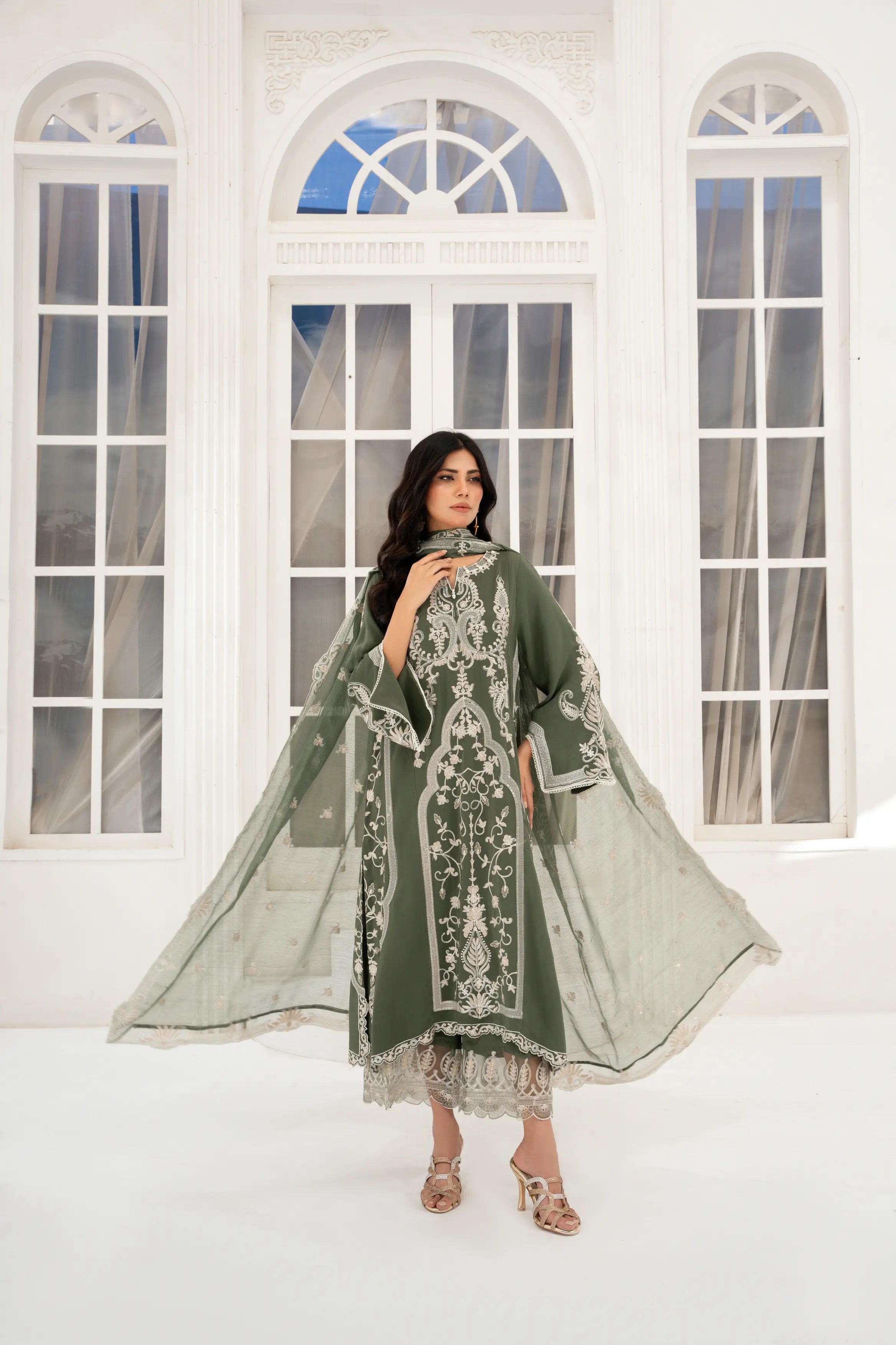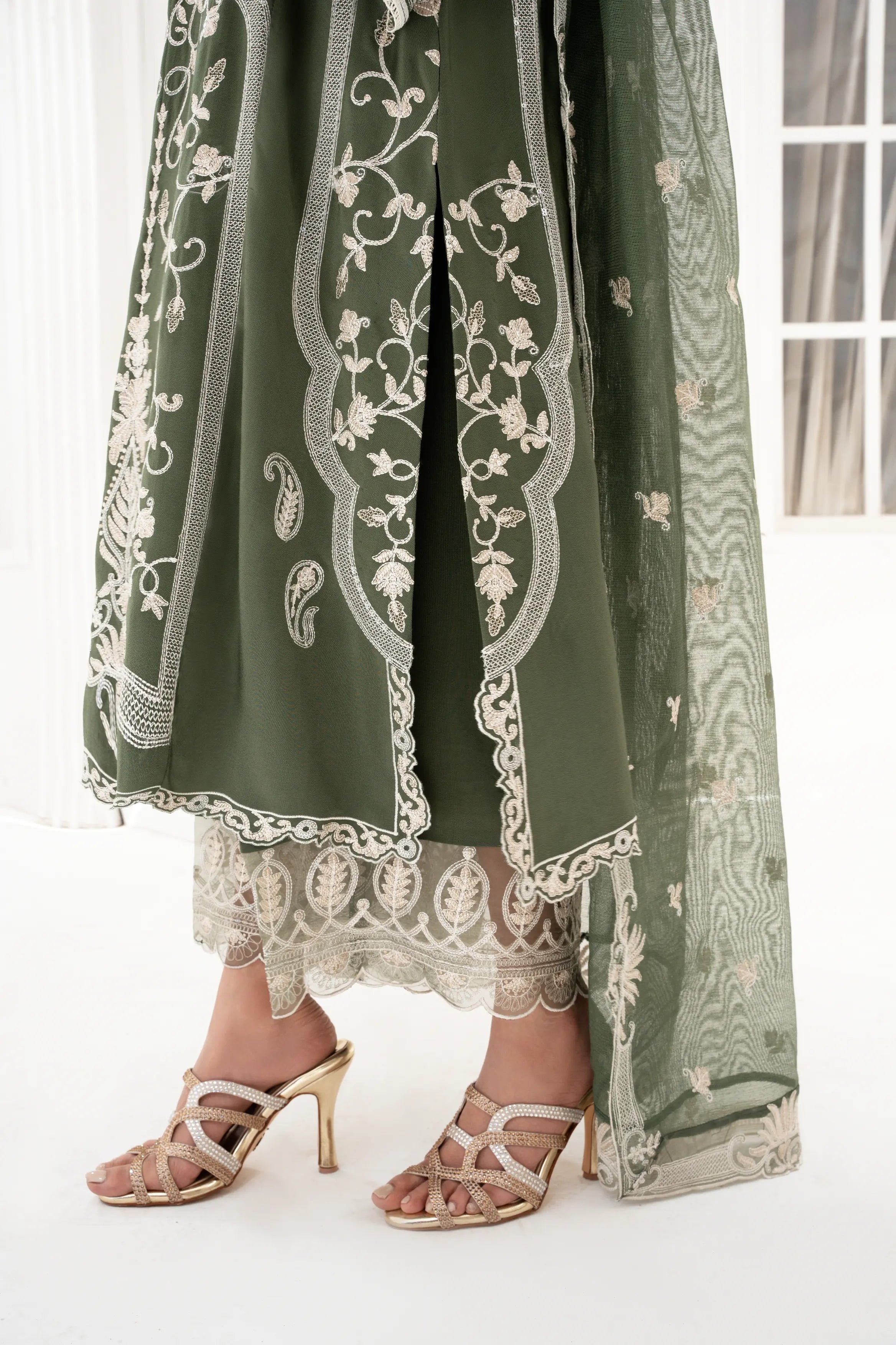 FLORA & FAUNA - Eid Festive: A sage green crepe georgette long A-line shirt with round neck features detailed ivory thread and sequins embroidery. Slit sleeves with lace finishing. Pearls and beads finishing on the neckline. Sage green crepe georgette culotte embellished with embroidered organza on the edges. Paired with sage green cotton net dupatta adorned with thread and sequins embroidery.