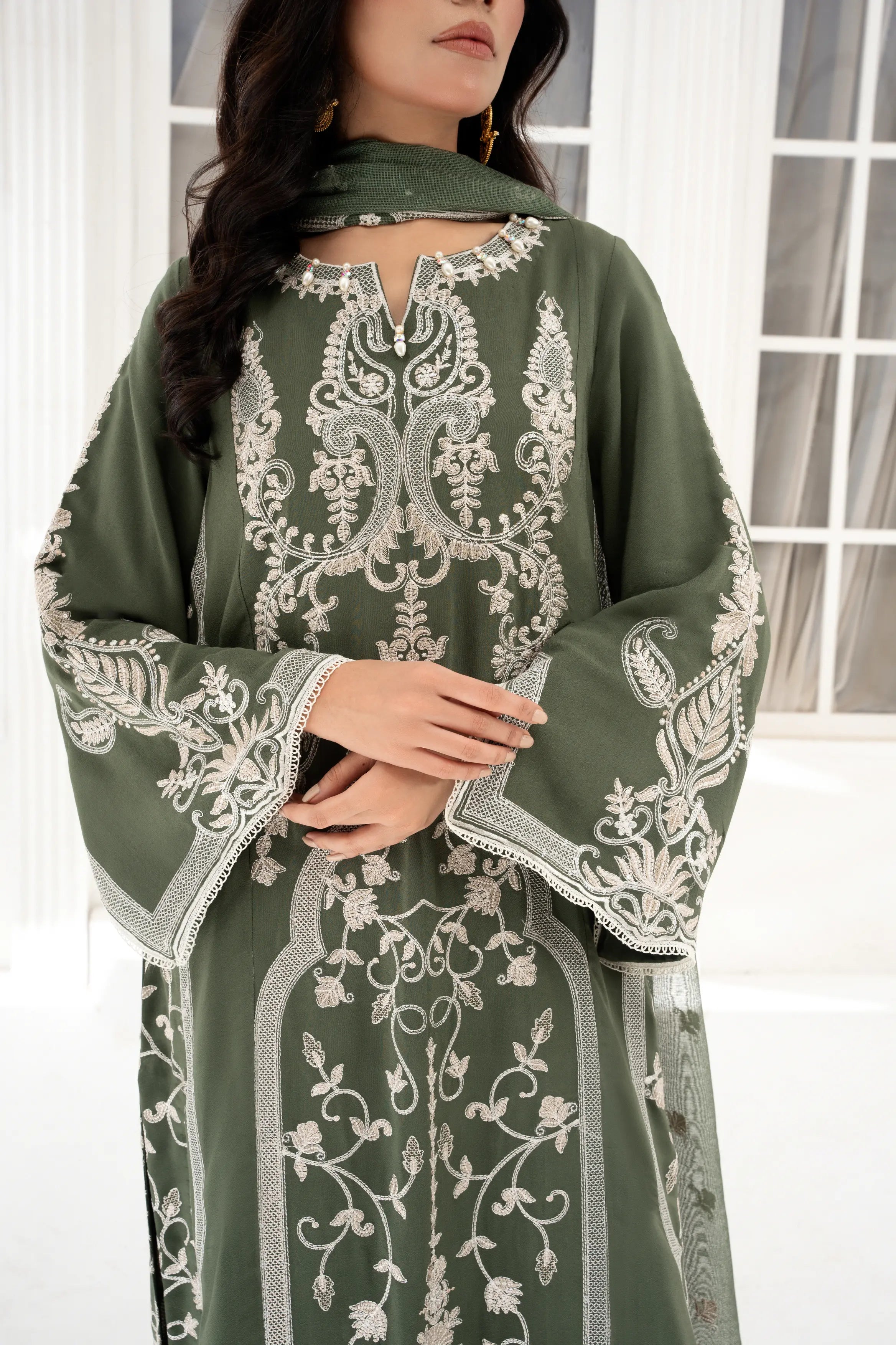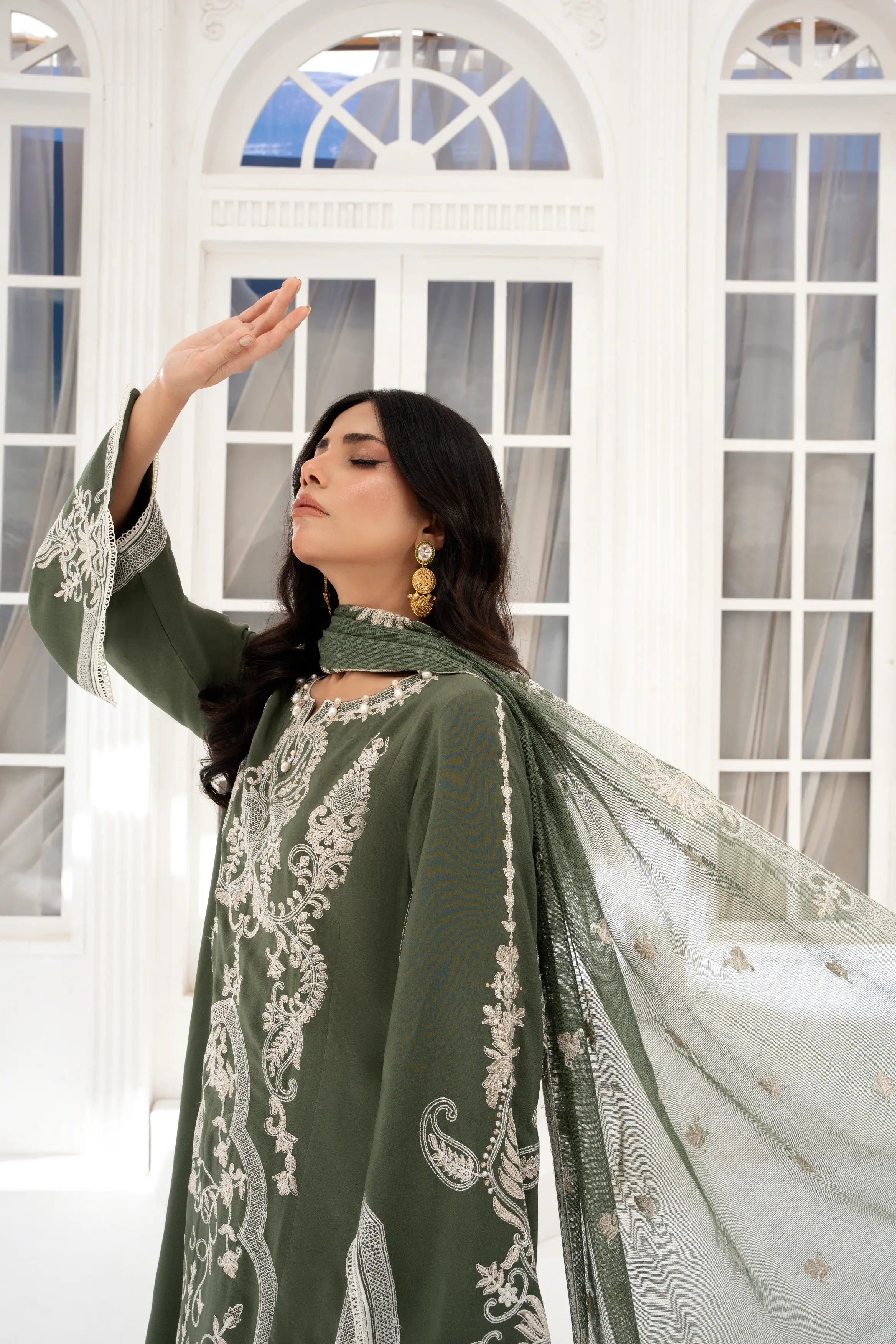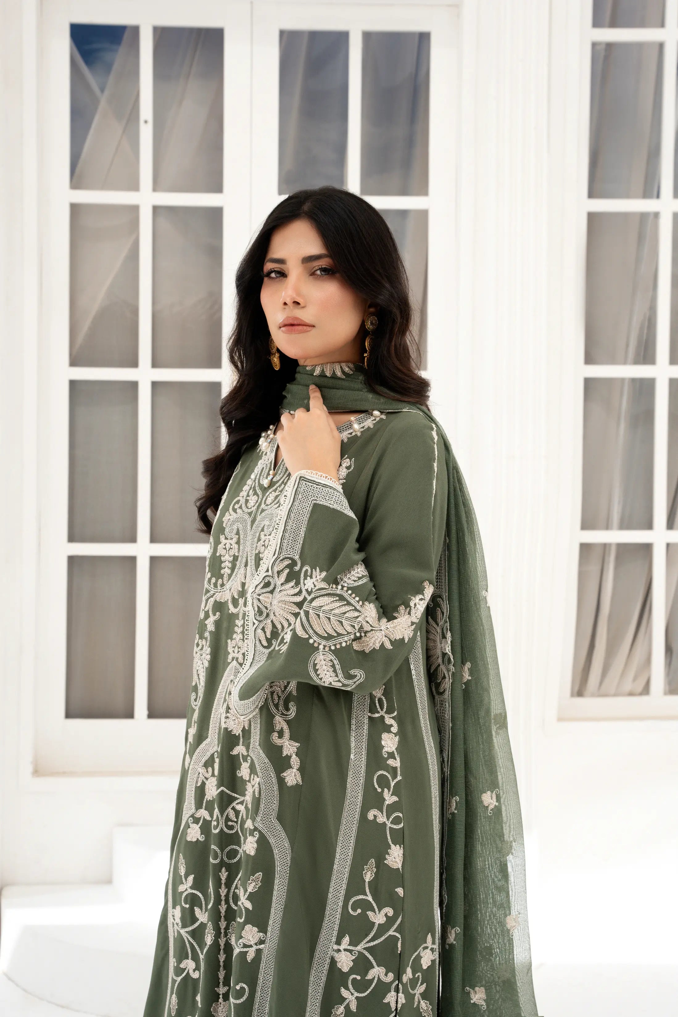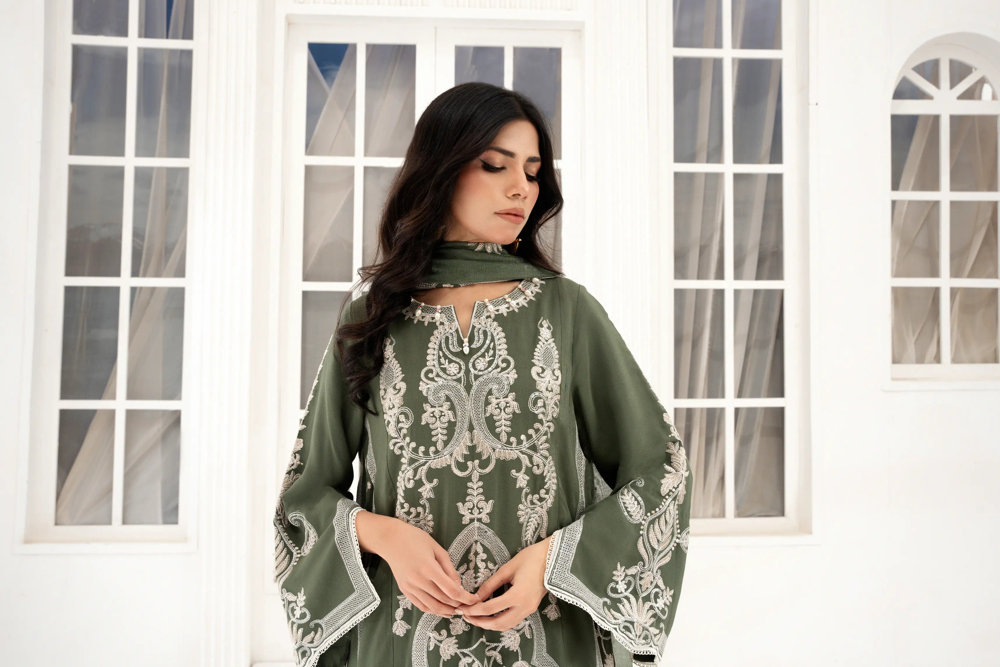 FLORA & FAUNA - Eid Festive: A sage green crepe georgette long A-line shirt with round neck features detailed ivory thread and sequins embroidery. Slit sleeves with lace finishing. Pearls and beads finishing on the neckline. Sage green crepe georgette culotte embellished with embroidered organza on the edges. Paired with sage green cotton net dupatta adorned with thread and sequins embroidery.
