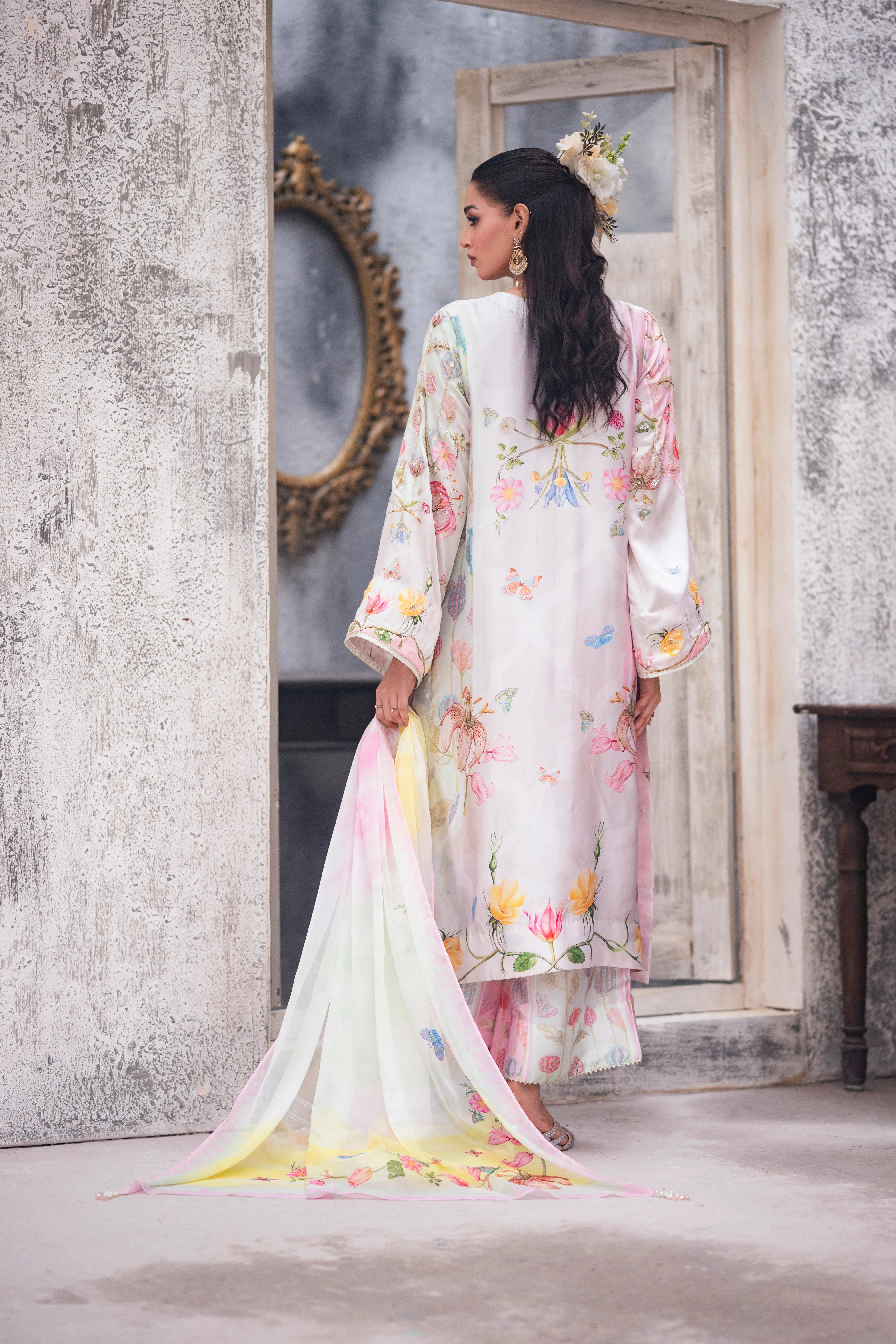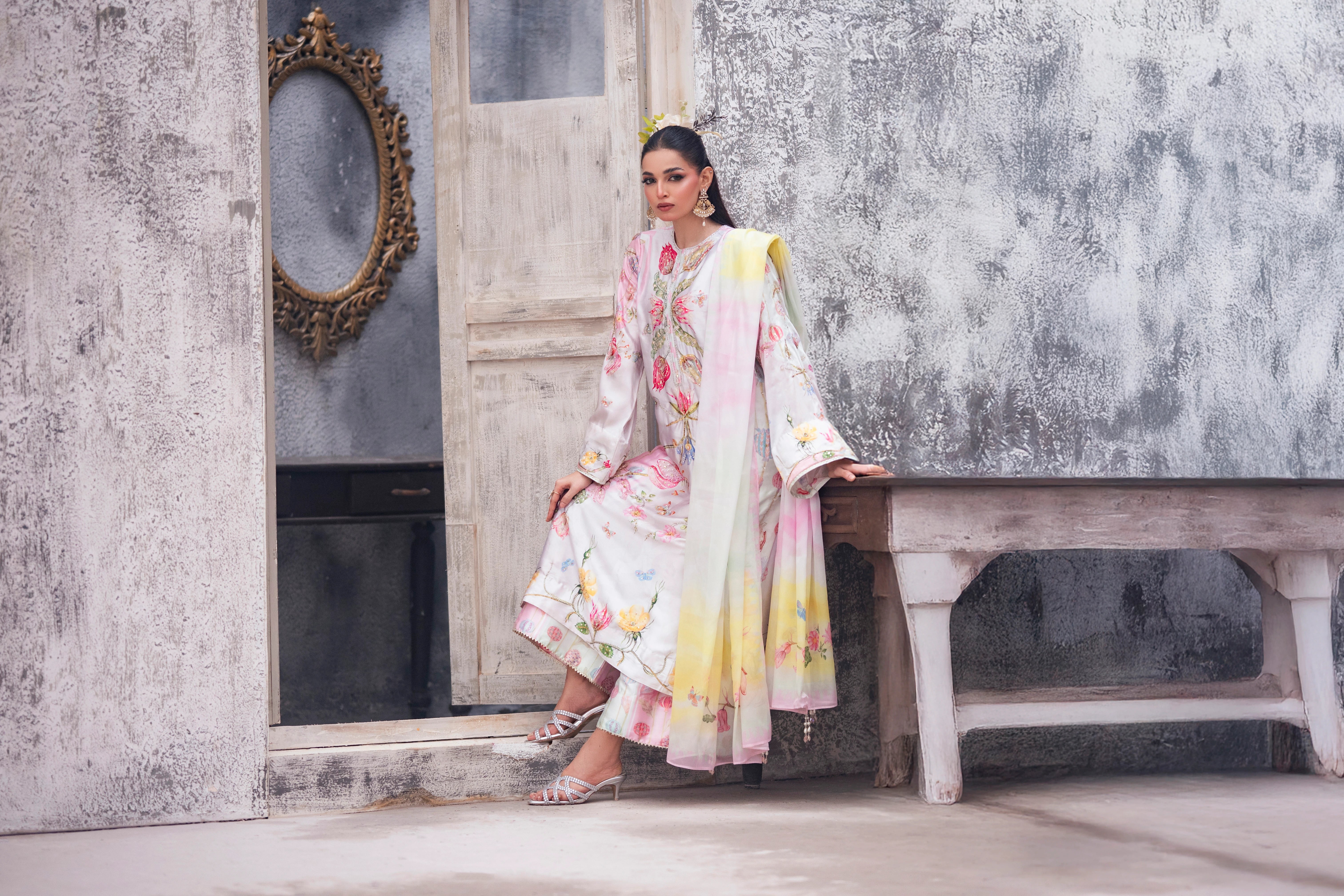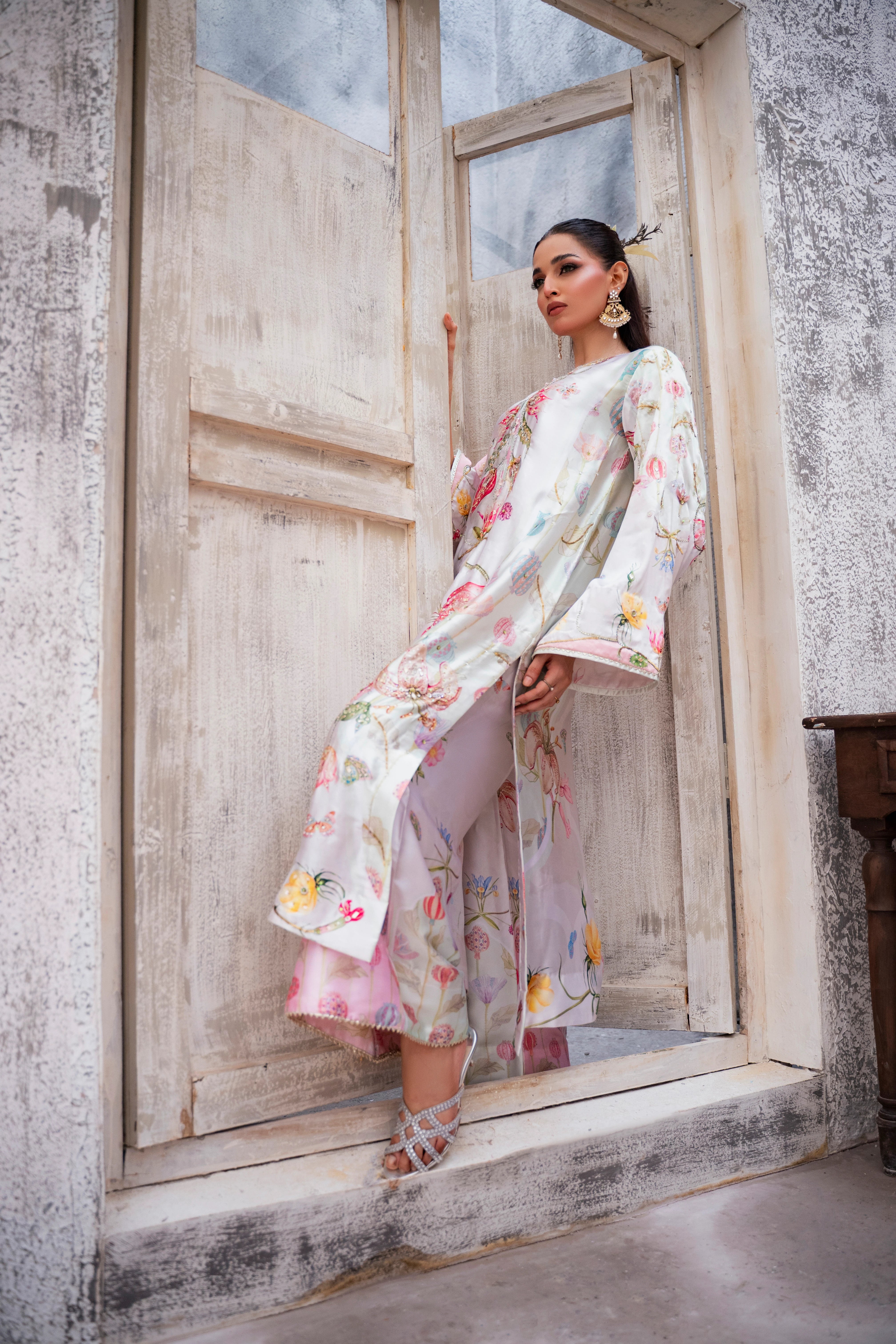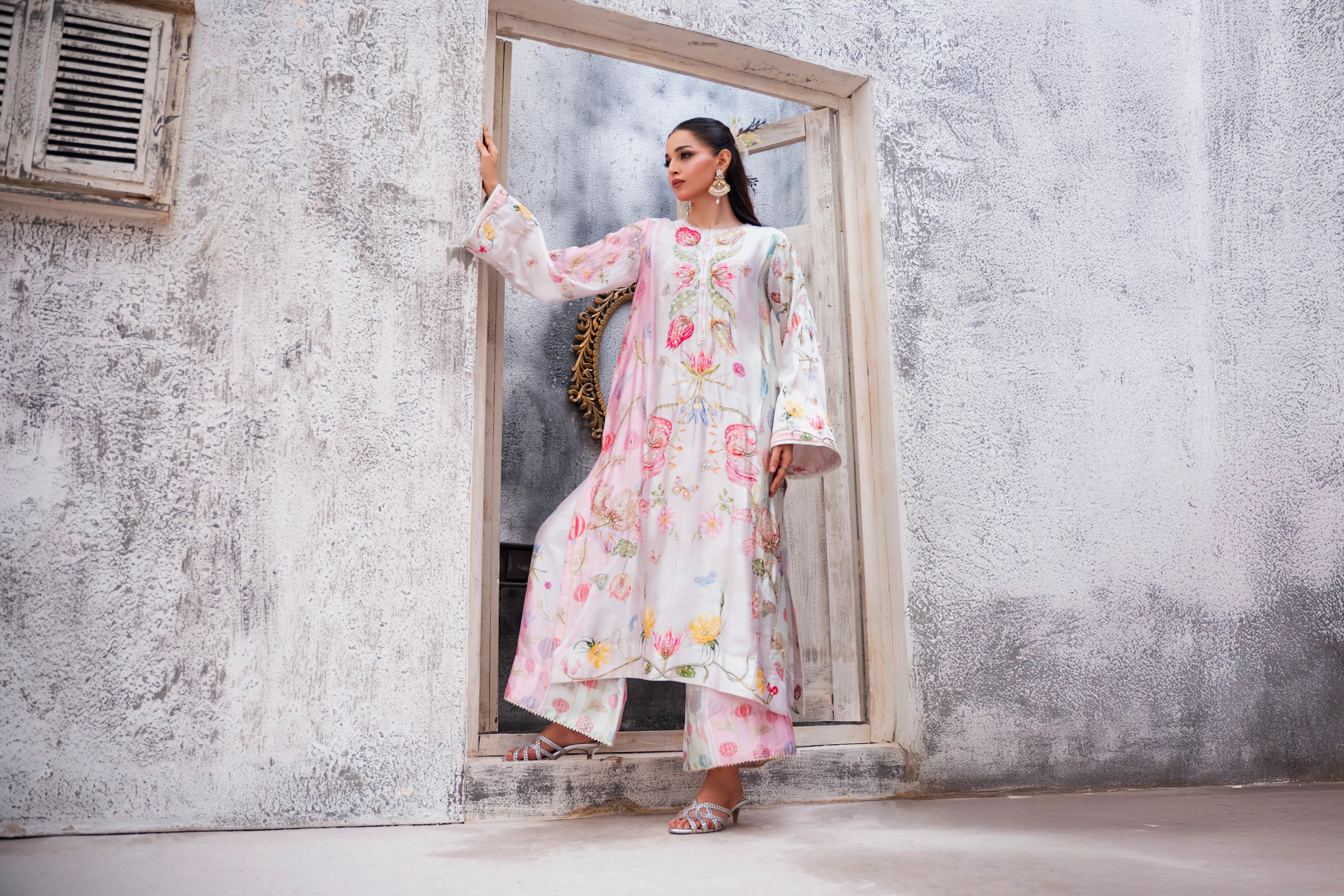 LIA - Festive Formal - VOL 2: Basking in a soft ivory pastel hue, this shamooz silk digital printed long A-Line shirt is adorned with pastel florals infusing it with playful charm. Zardoze, sequins, Swarovski crystals, beads, blush organza petals and gota embroidery enrich the neckline, hem and sleeves, with scattered gota accents adding glints of shimmer. A diaphanous silk digitally printed dupatta features delicate leheriya and floral patterns, bead tassel edges and intricate gota detailing, echoed on the sleeve hems. Paired with a matching shamooz silk culottes, finished with subtle gota embellishment, the look strikes a graceful balance of tradition and flair.