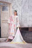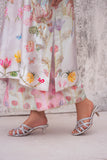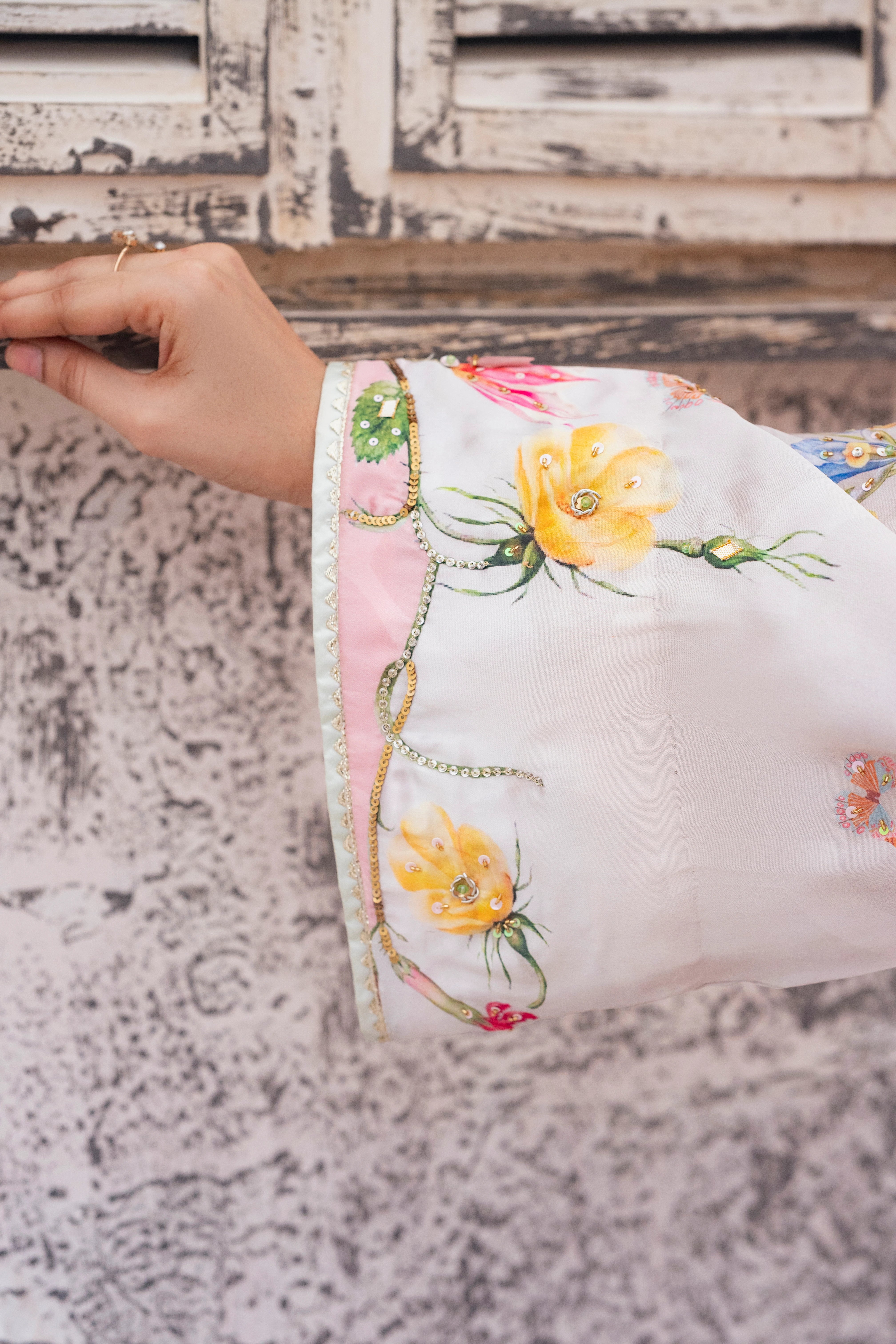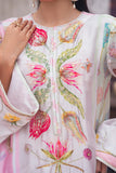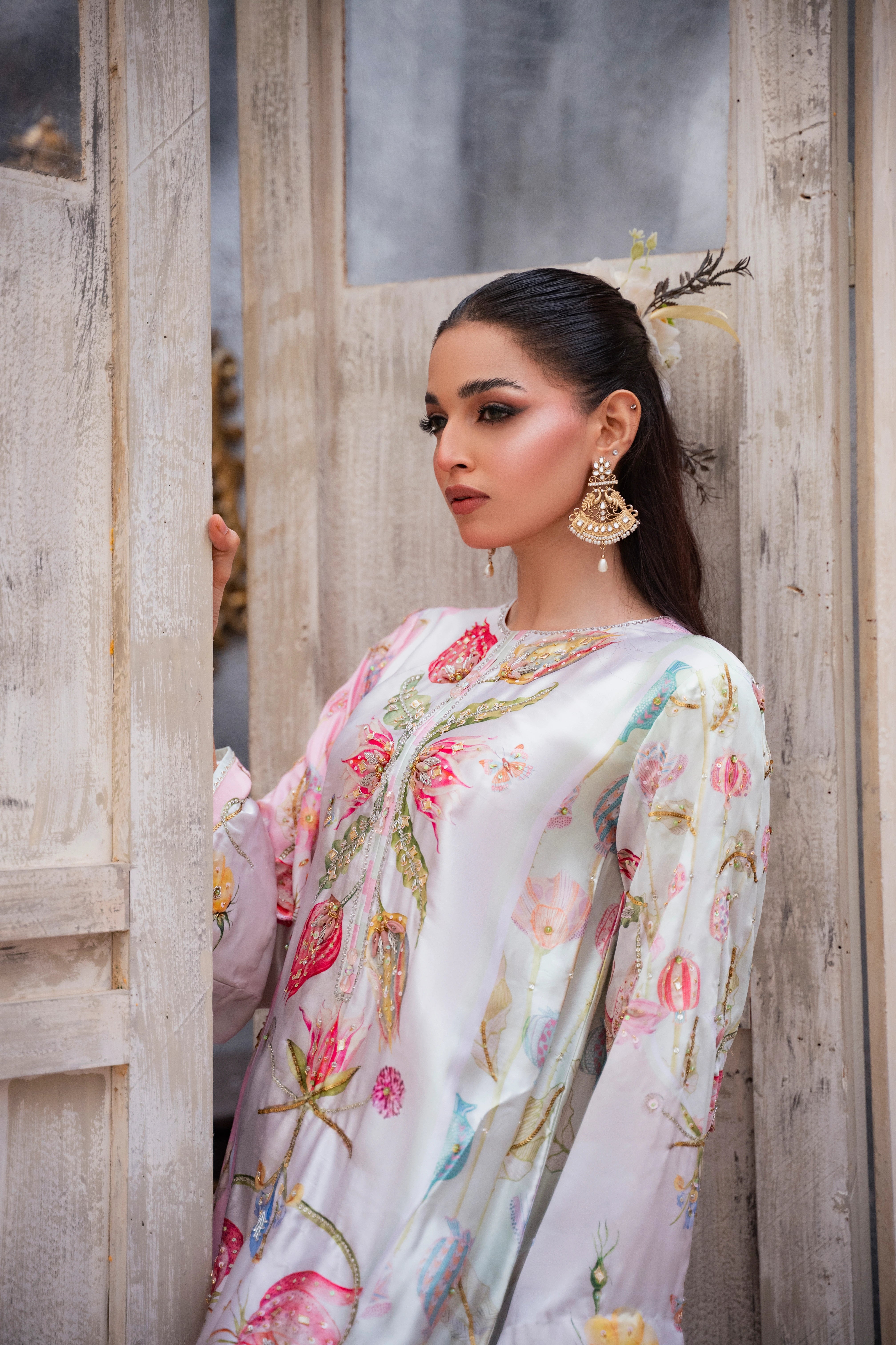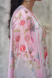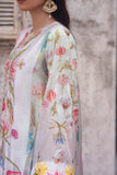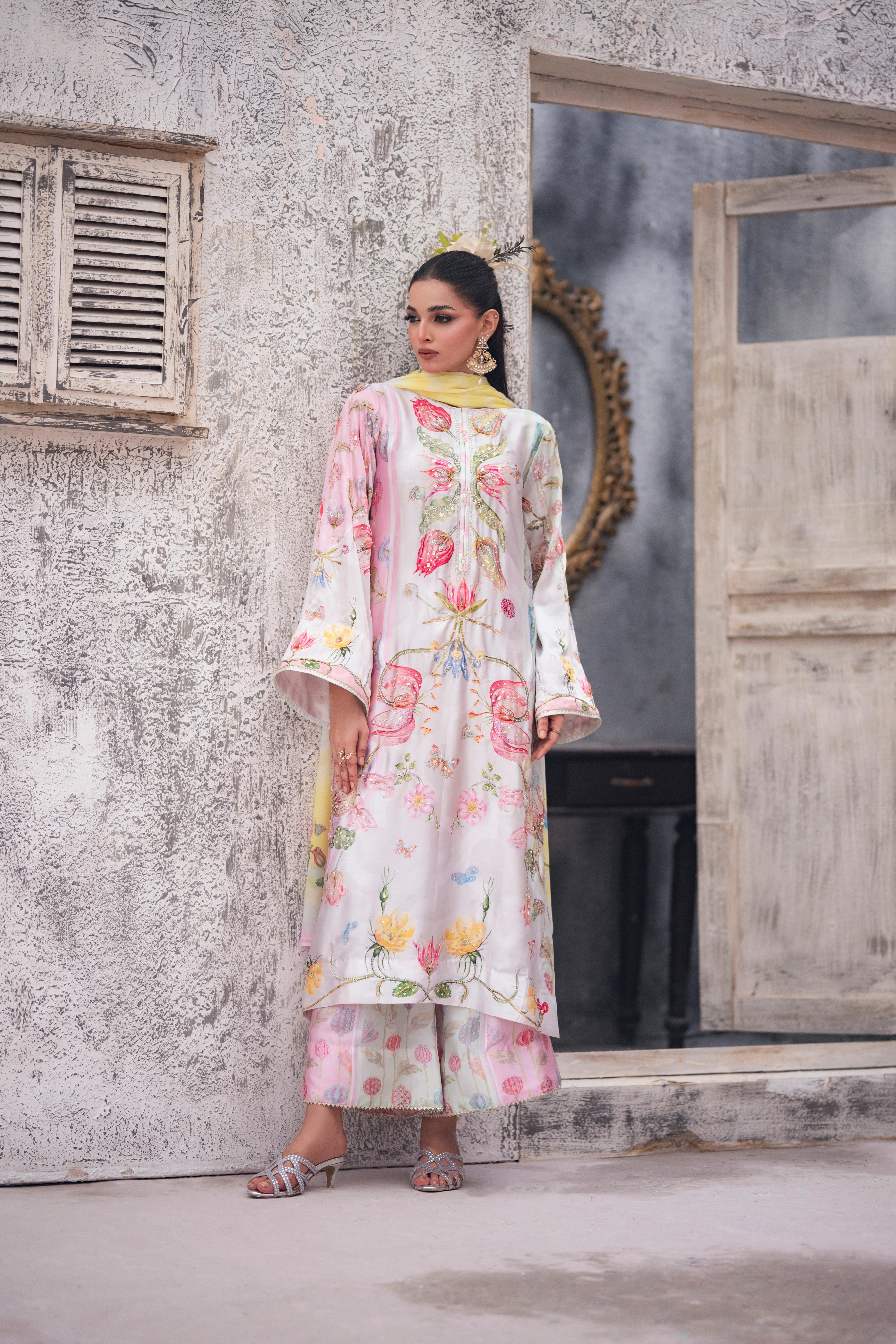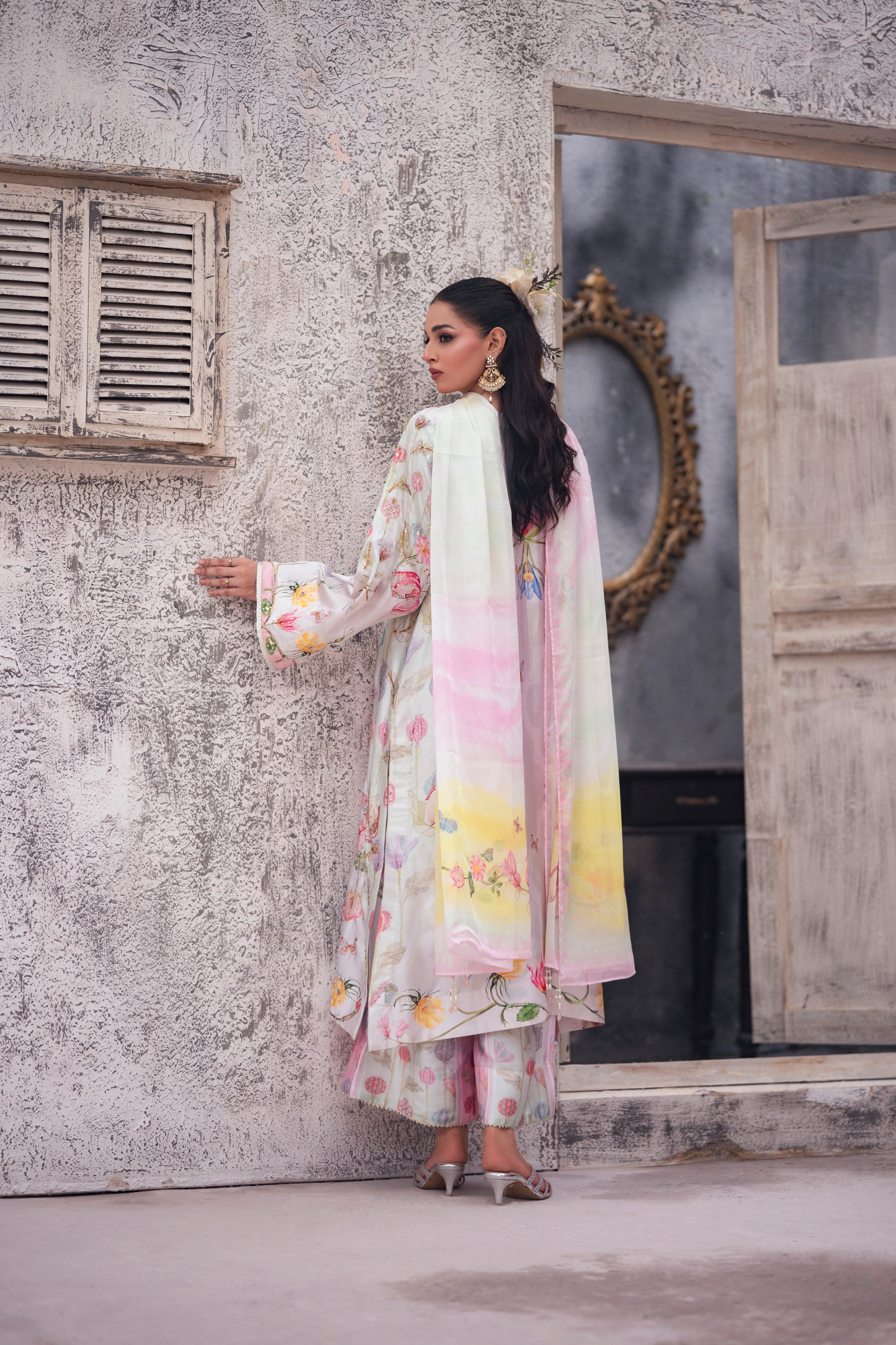 LIA - Festive Formal - VOL 2: Basking in a soft ivory pastel hue, this shamooz silk digital printed long A-Line shirt is adorned with pastel florals infusing it with playful charm. Zardoze, sequins, Swarovski crystals, beads, blush organza petals and gota embroidery enrich the neckline, hem and sleeves, with scattered gota accents adding glints of shimmer. A diaphanous silk digitally printed dupatta features delicate leheriya and floral patterns, bead tassel edges and intricate gota detailing, echoed on the sleeve hems. Paired with a matching shamooz silk culottes, finished with subtle gota embellishment, the look strikes a graceful balance of tradition and flair.
