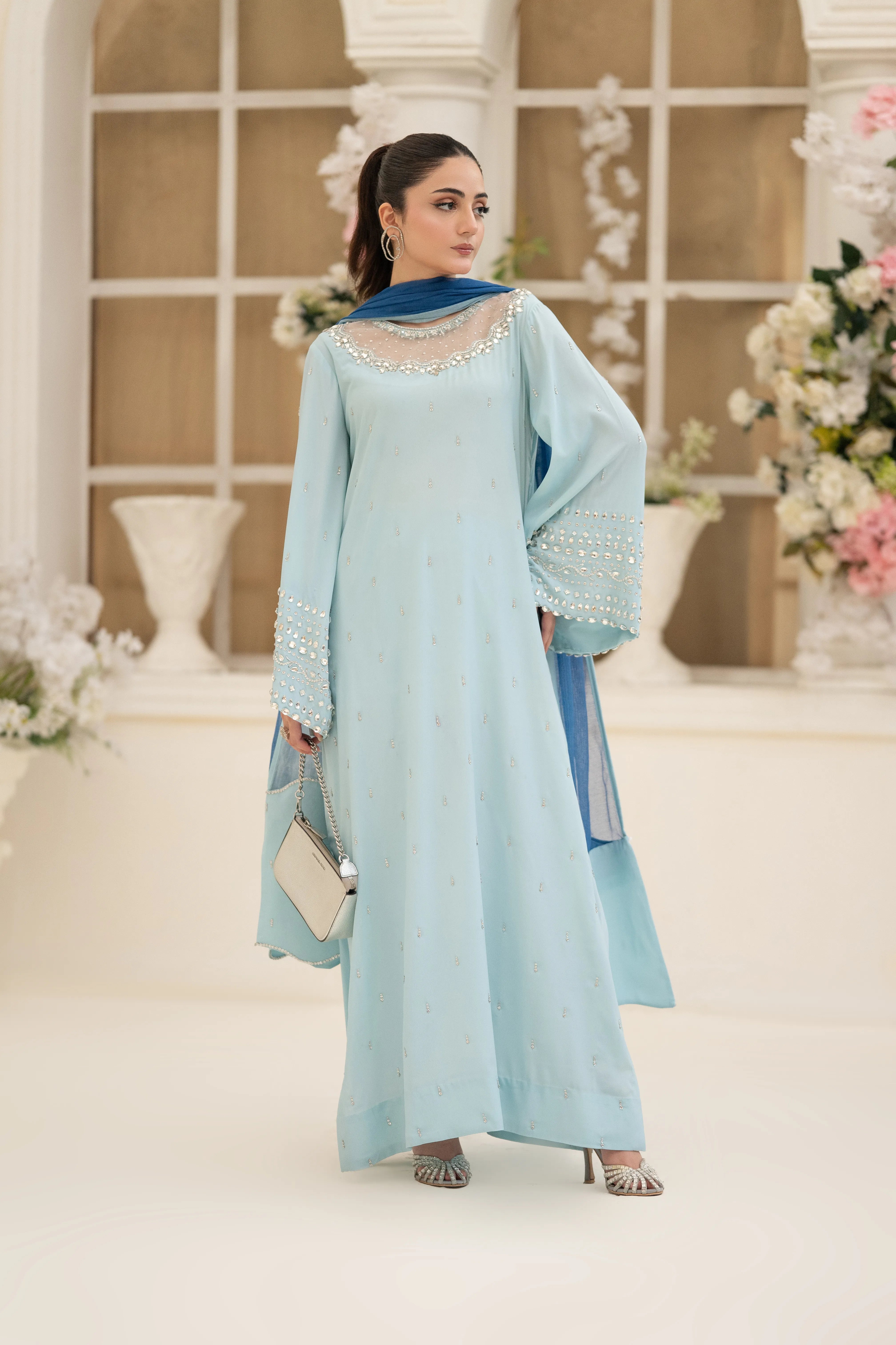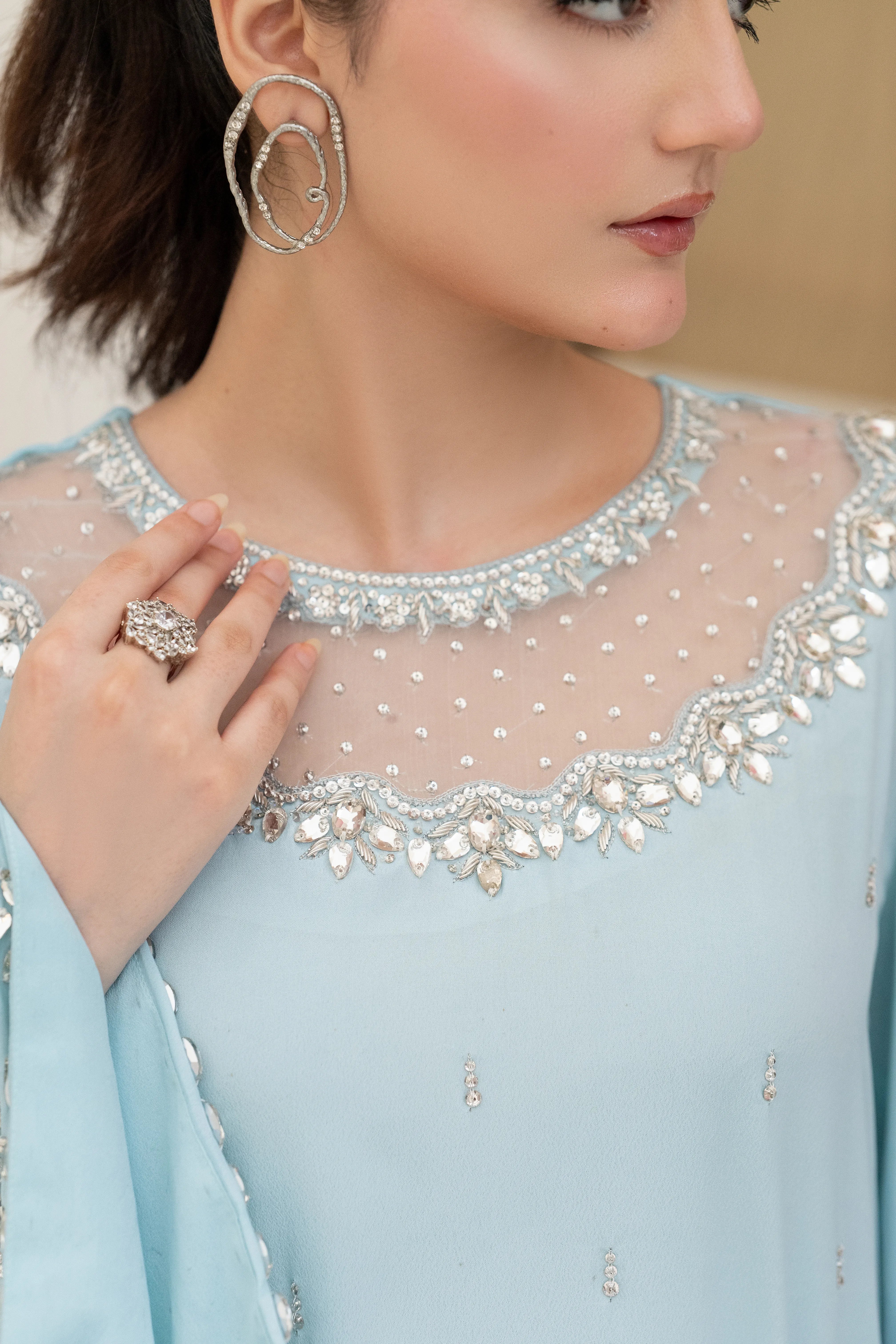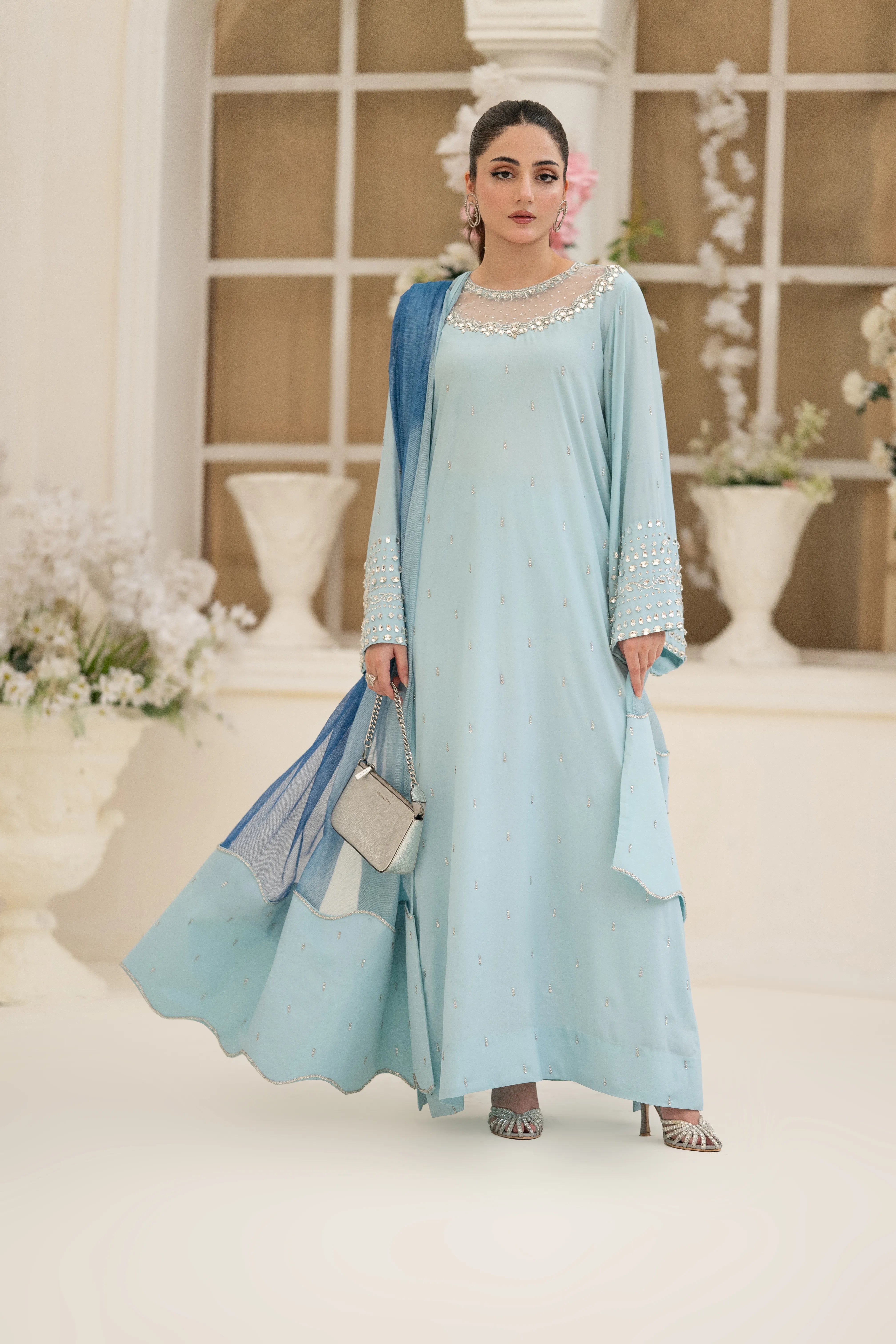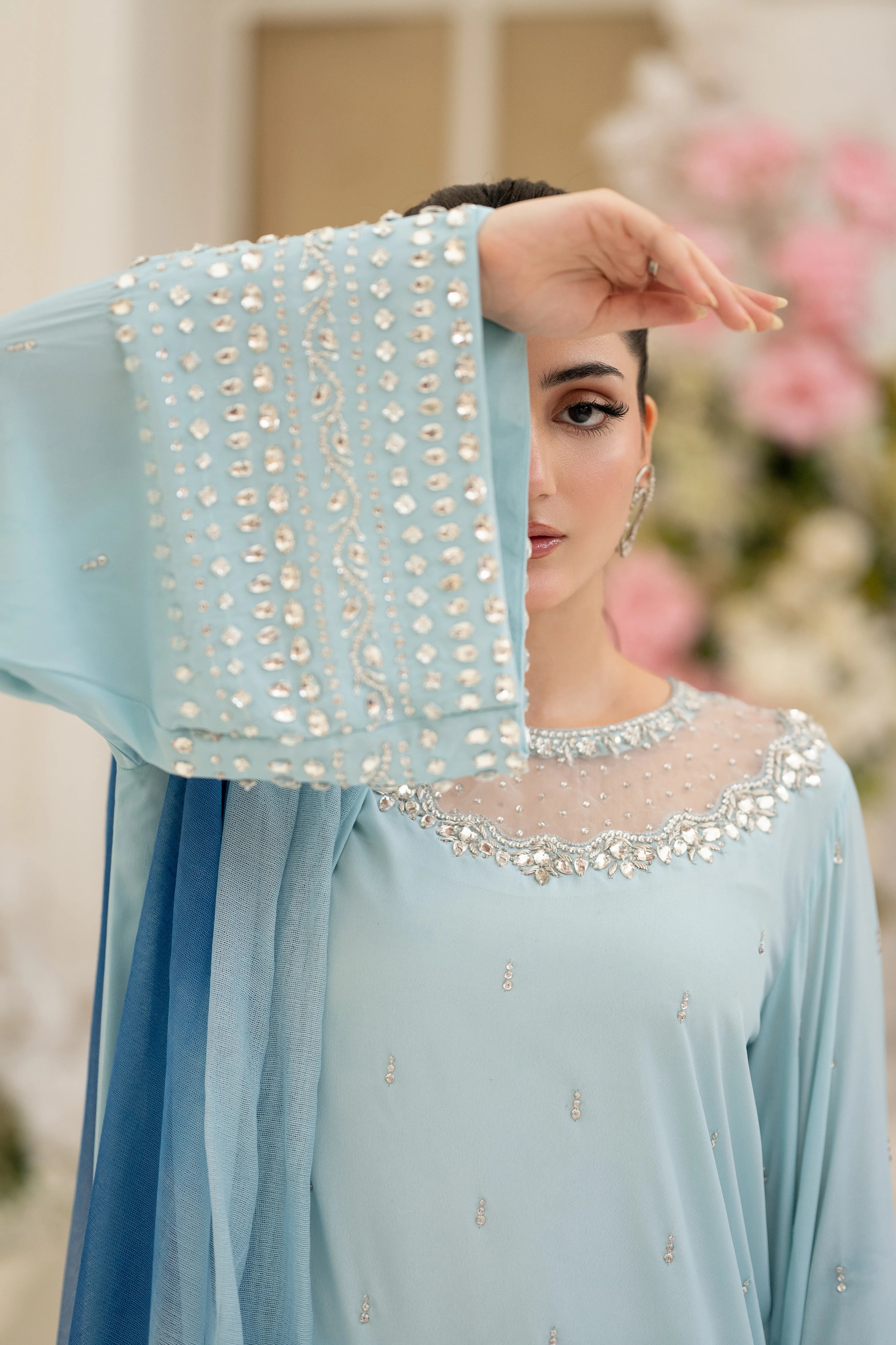 Minha - Eid Festive: A Baby Blue crepe silk long kaftan shirt with round neck feature cutwork zardozi, pearl, sequins and Swarovski hand embroidery. Kurta sleeves embellished with hand embroidery. Paired with matching crepe silk straight pant. Tie and dye Khaddi net dupatta finished with hand embroidered fabric. This versatile piece is effortlessly adaptable for any occasion.