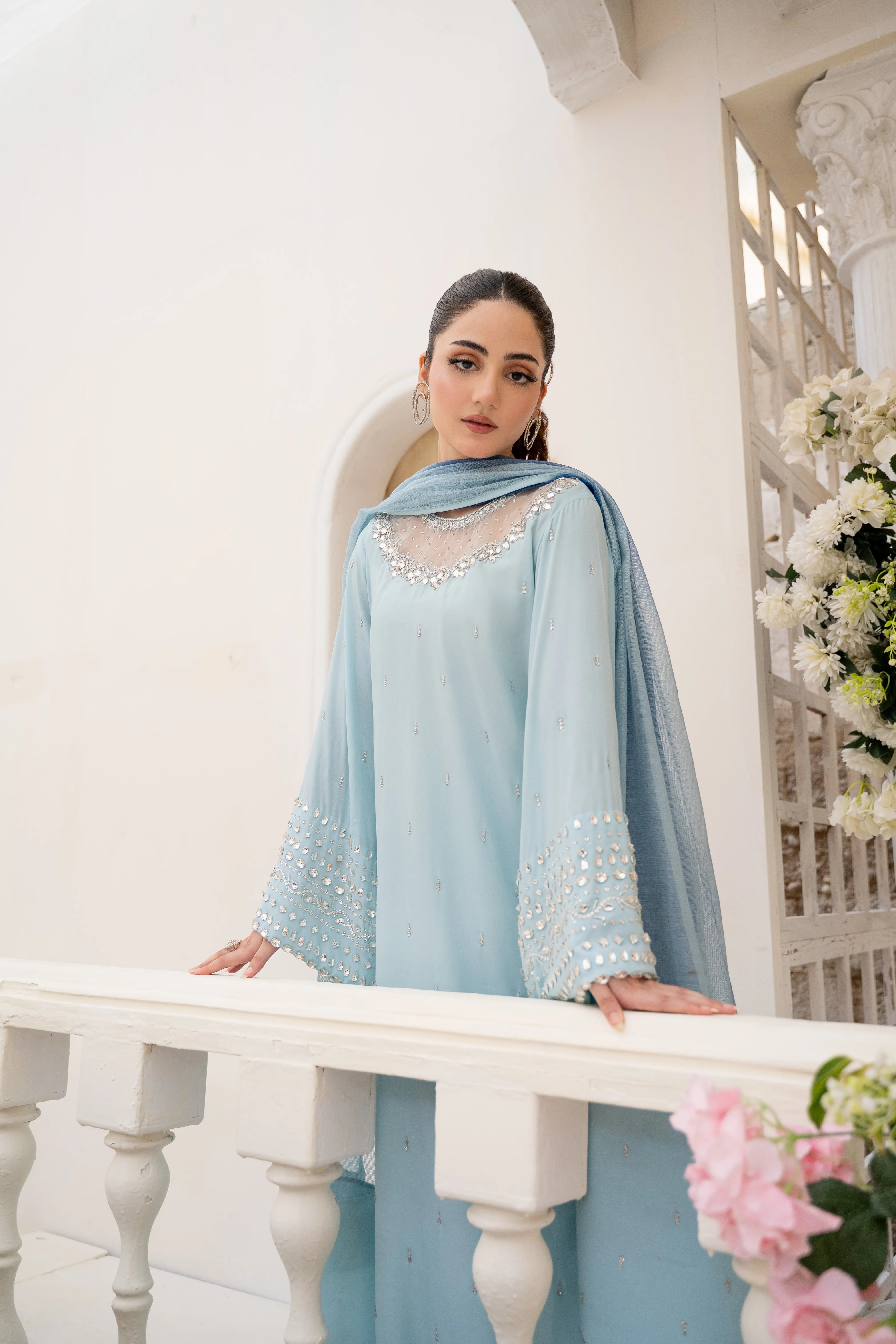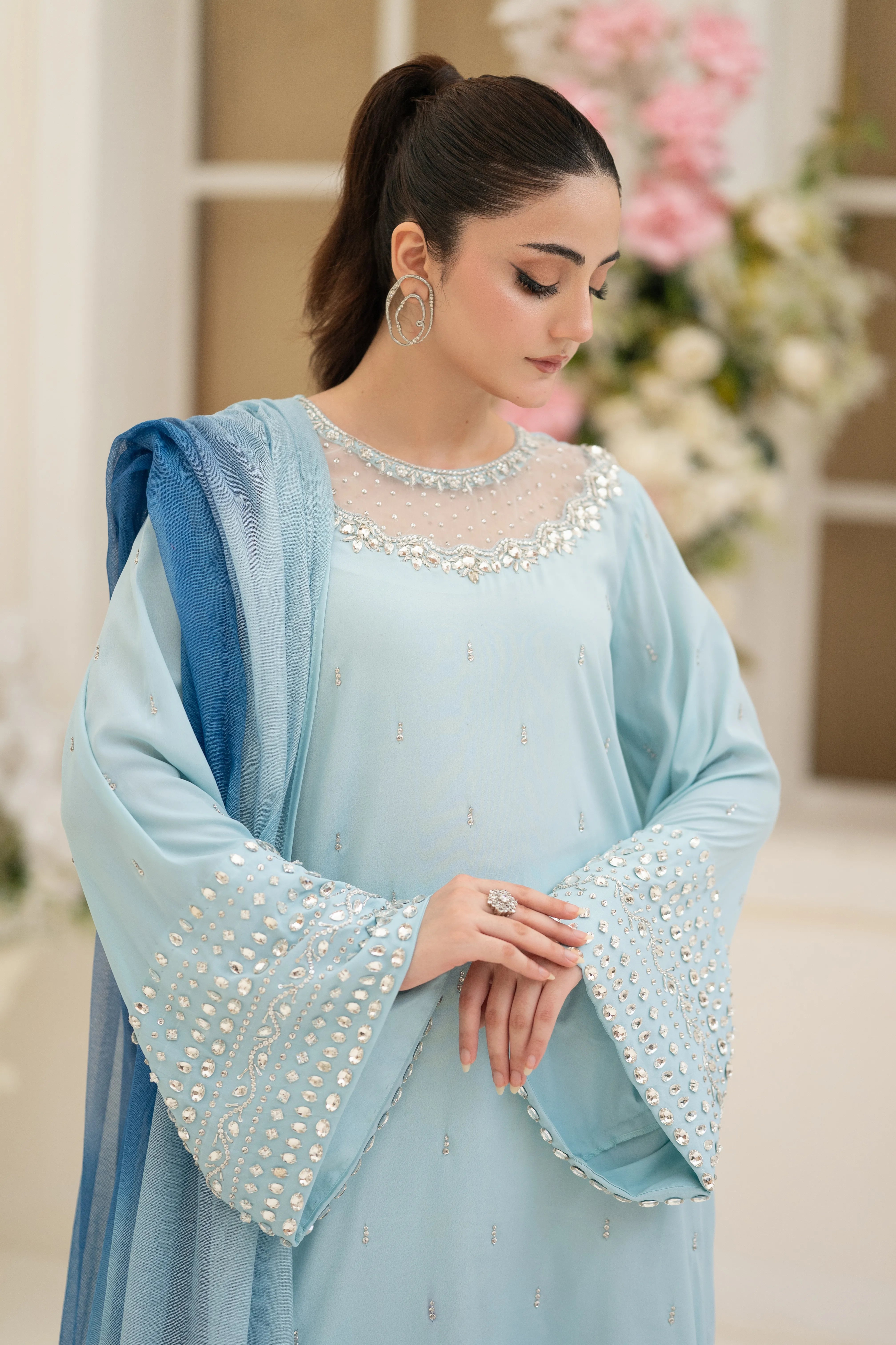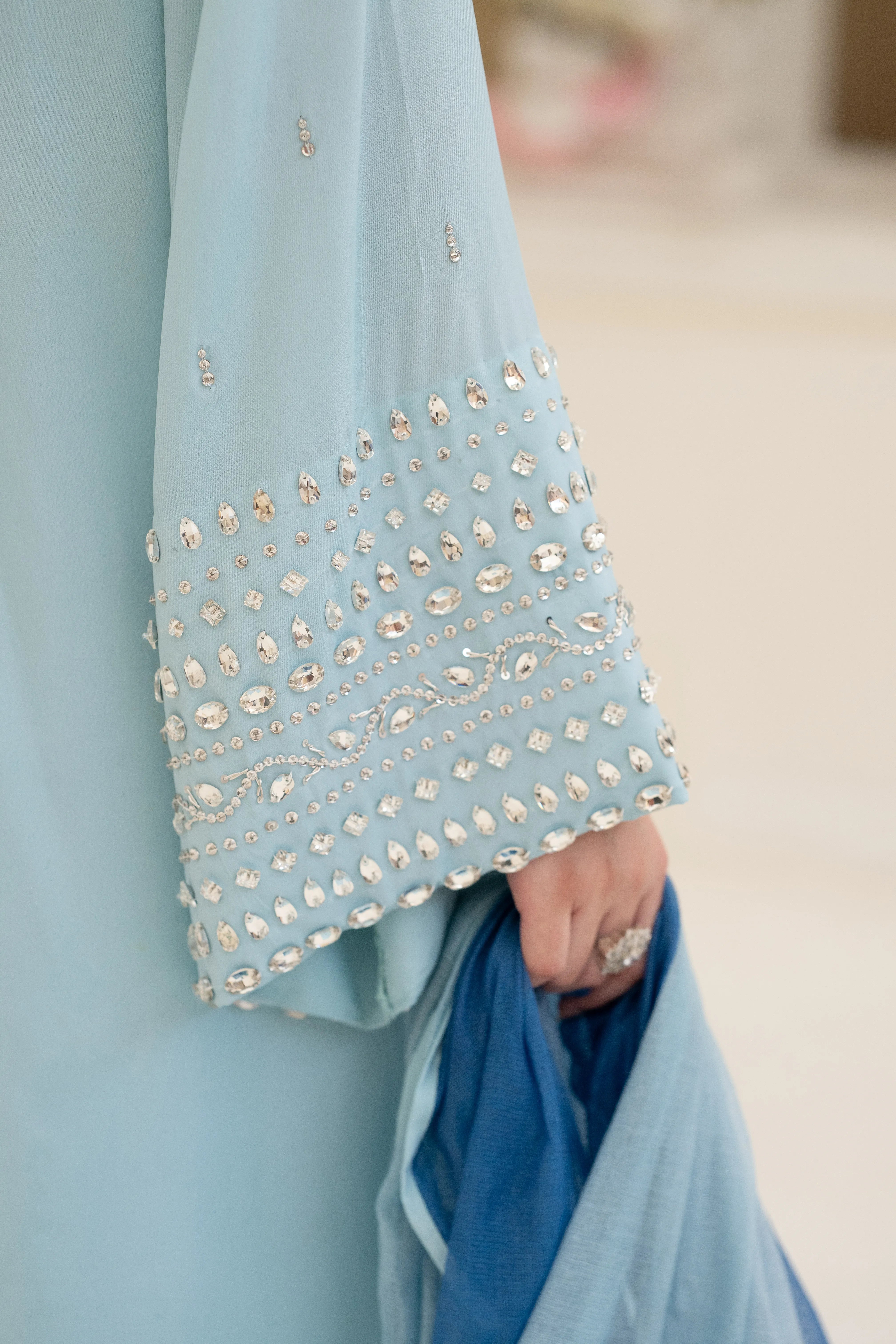 Minha - Eid Festive: A Baby Blue crepe silk long kaftan shirt with round neck feature cutwork zardozi, pearl, sequins and Swarovski hand embroidery. Kurta sleeves embellished with hand embroidery. Paired with matching crepe silk straight pant. Tie and dye Khaddi net dupatta finished with hand embroidered fabric. This versatile piece is effortlessly adaptable for any occasion.