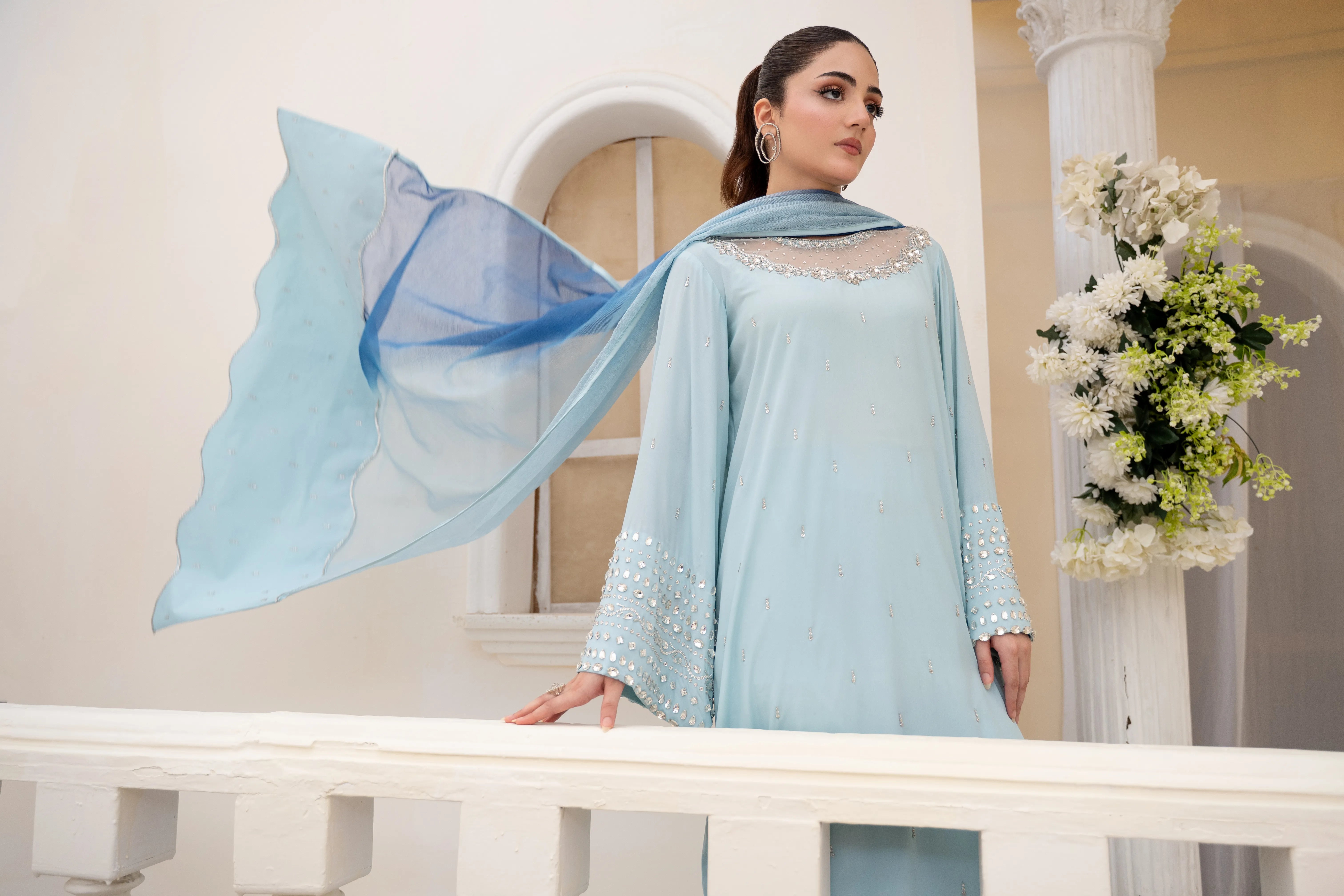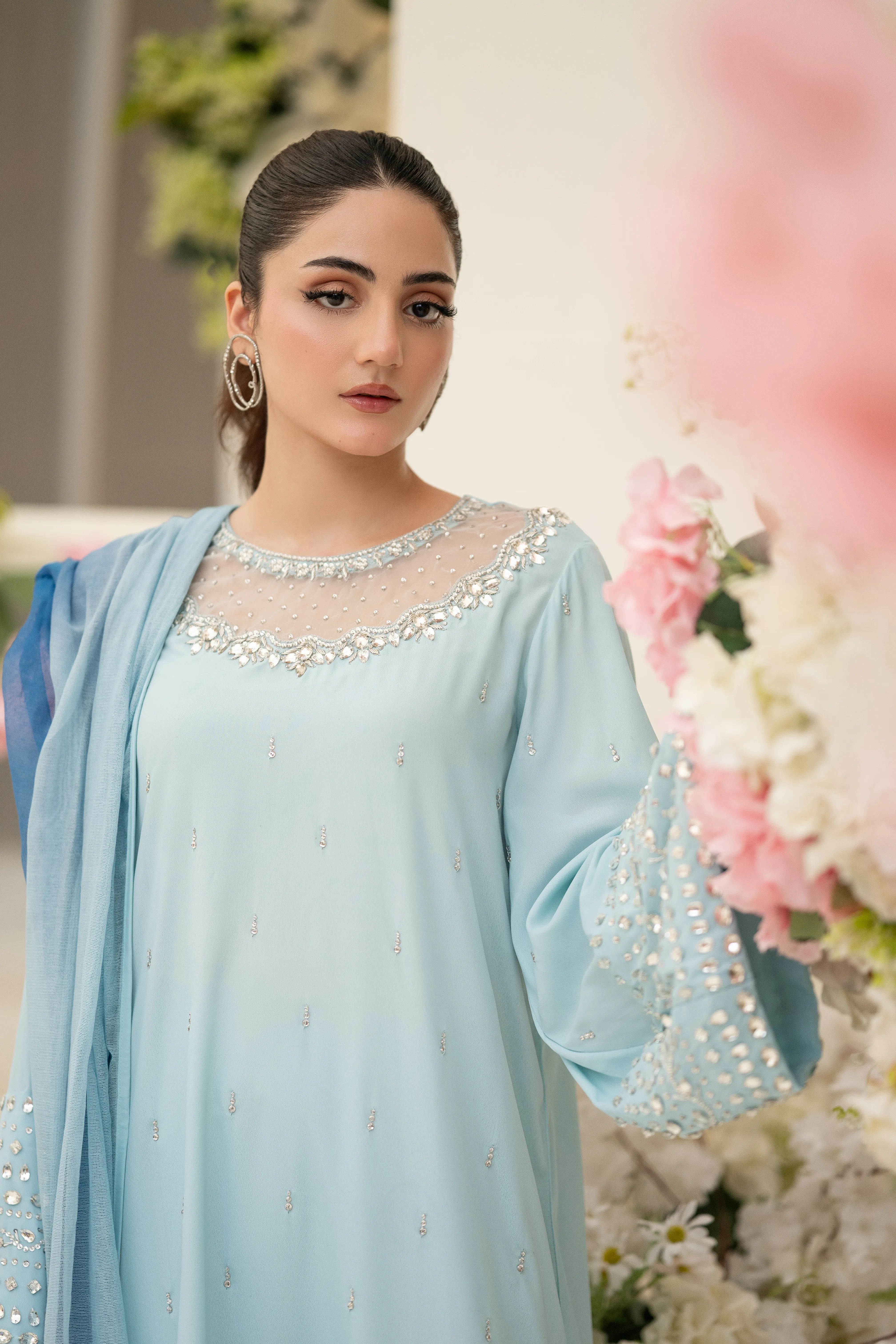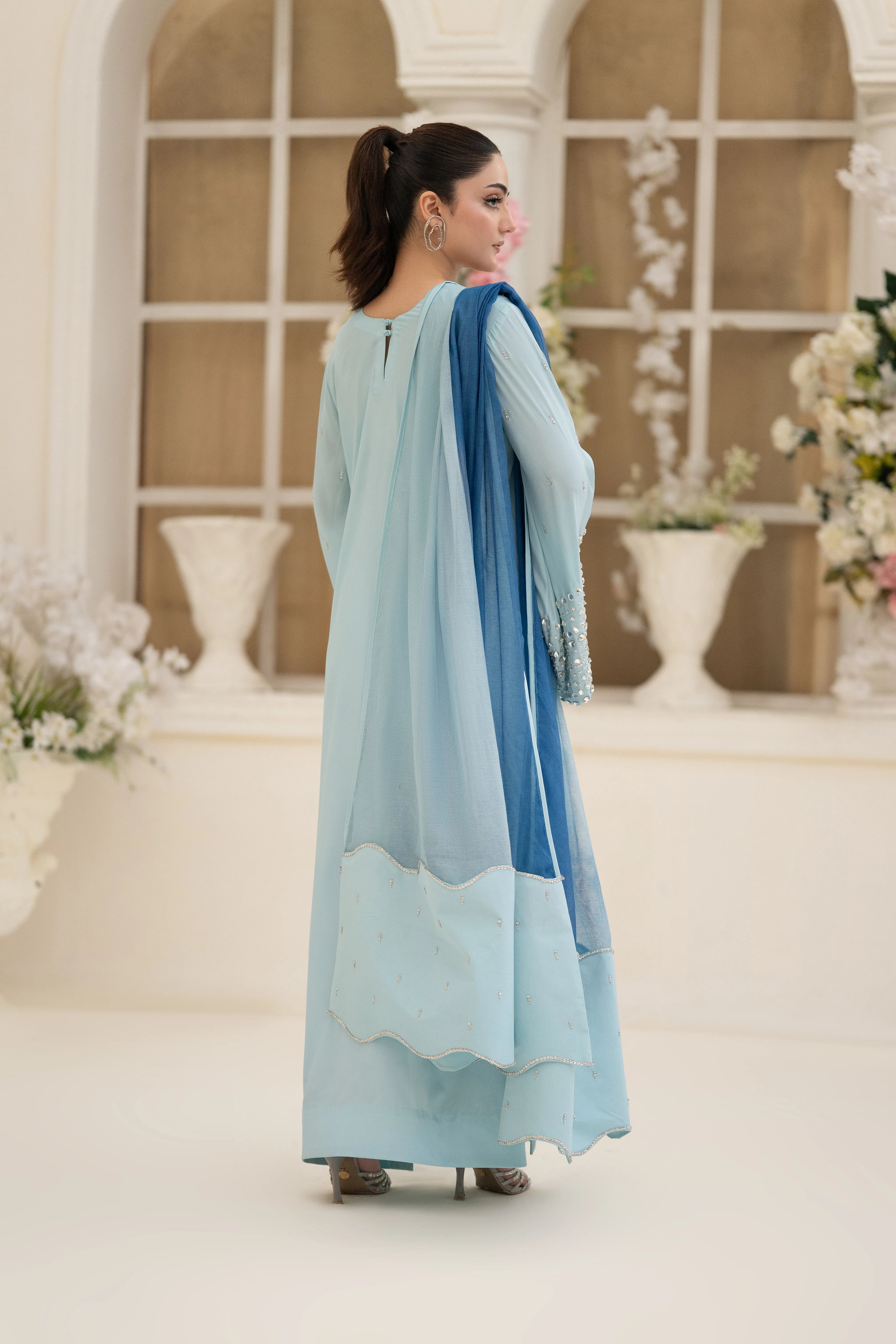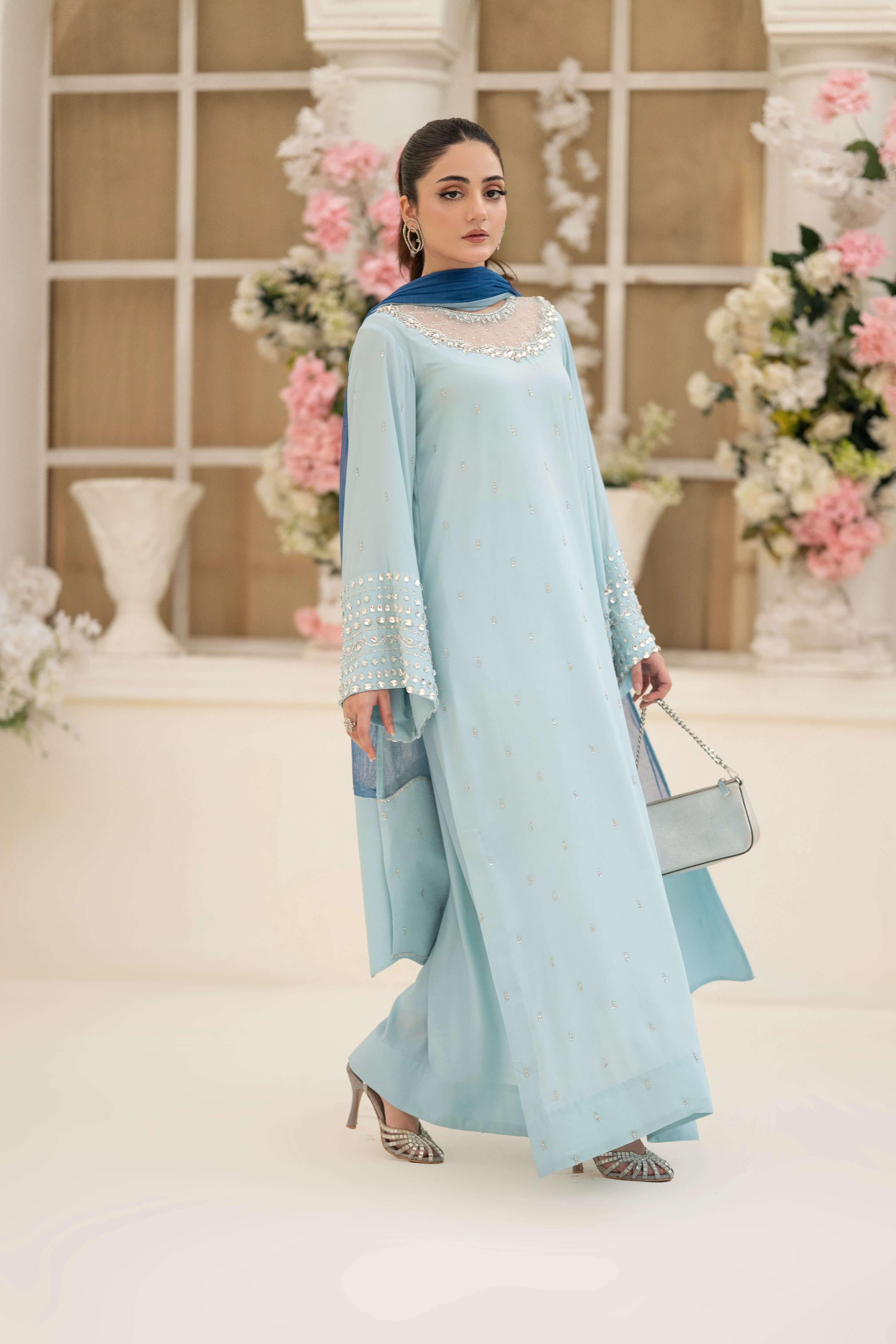 Minha - Eid Festive: A Baby Blue crepe silk long kaftan shirt with round neck feature cutwork zardozi, pearl, sequins and Swarovski hand embroidery. Kurta sleeves embellished with hand embroidery. Paired with matching crepe silk straight pant. Tie and dye Khaddi net dupatta finished with hand embroidered fabric. This versatile piece is effortlessly adaptable for any occasion.