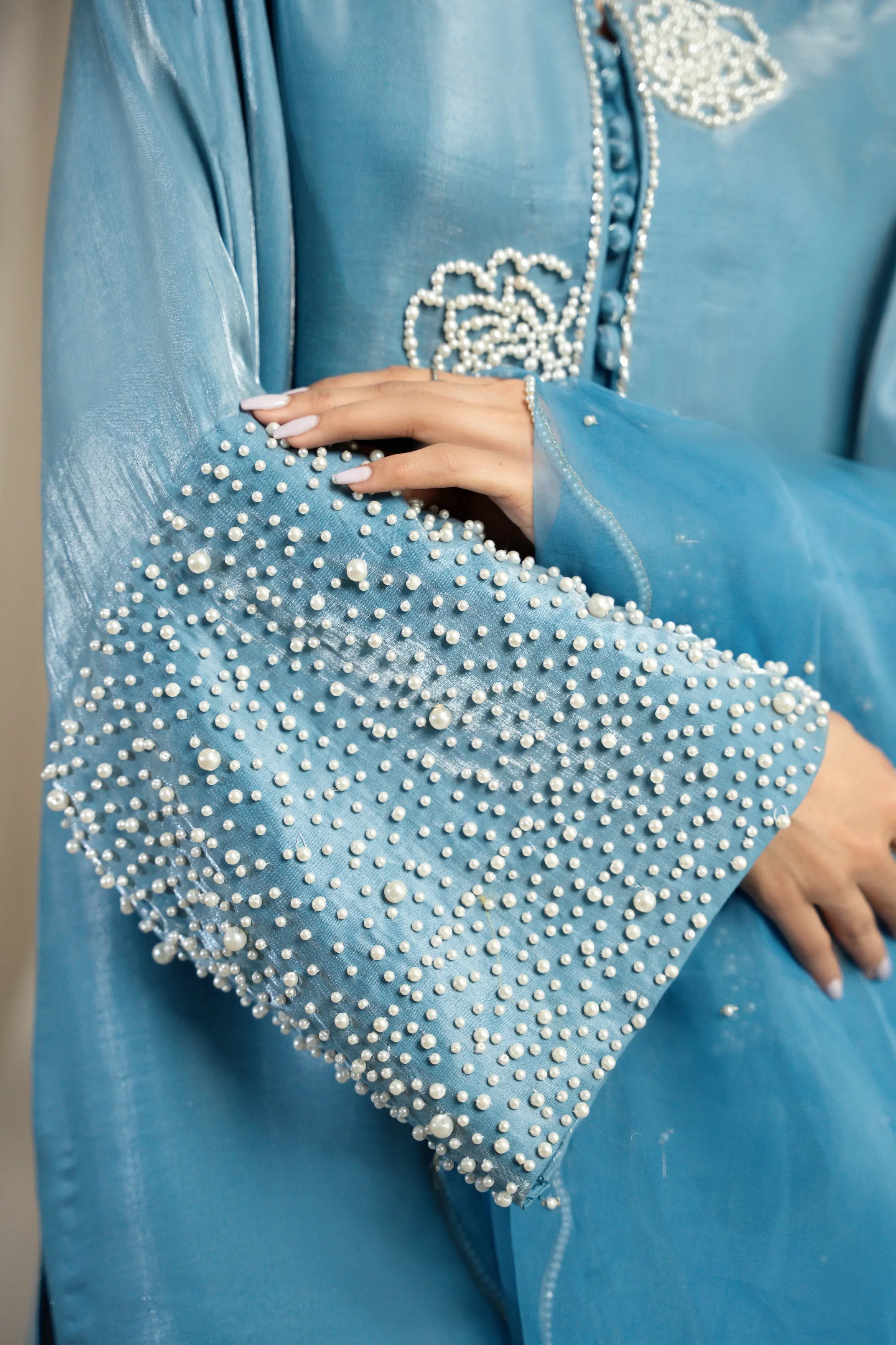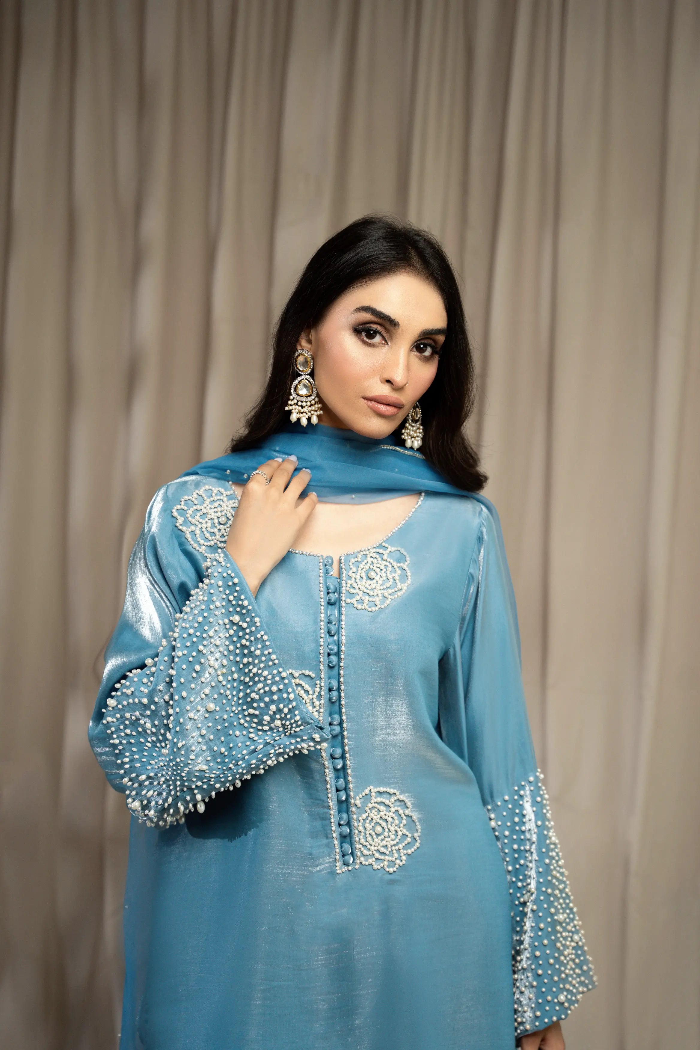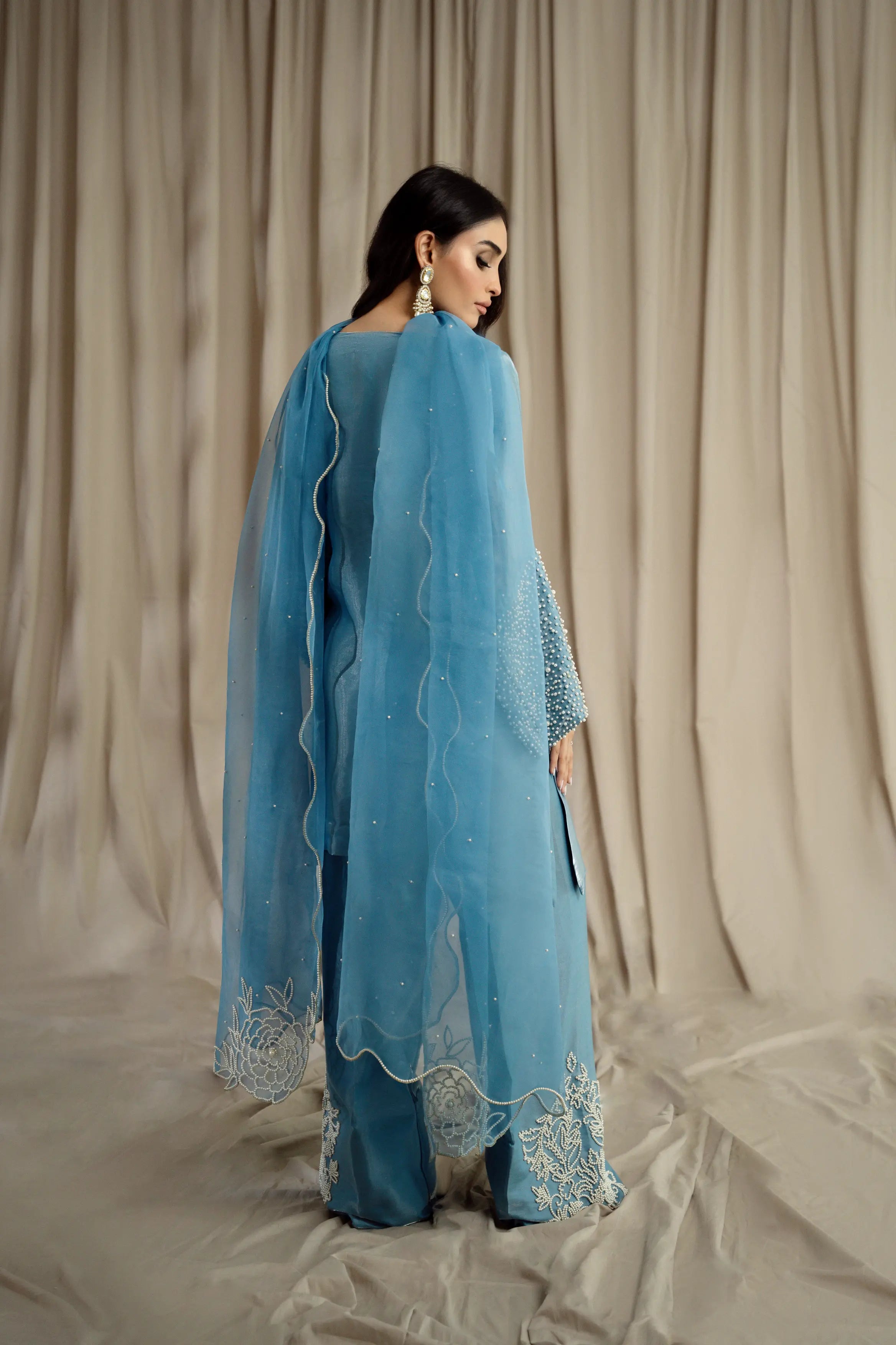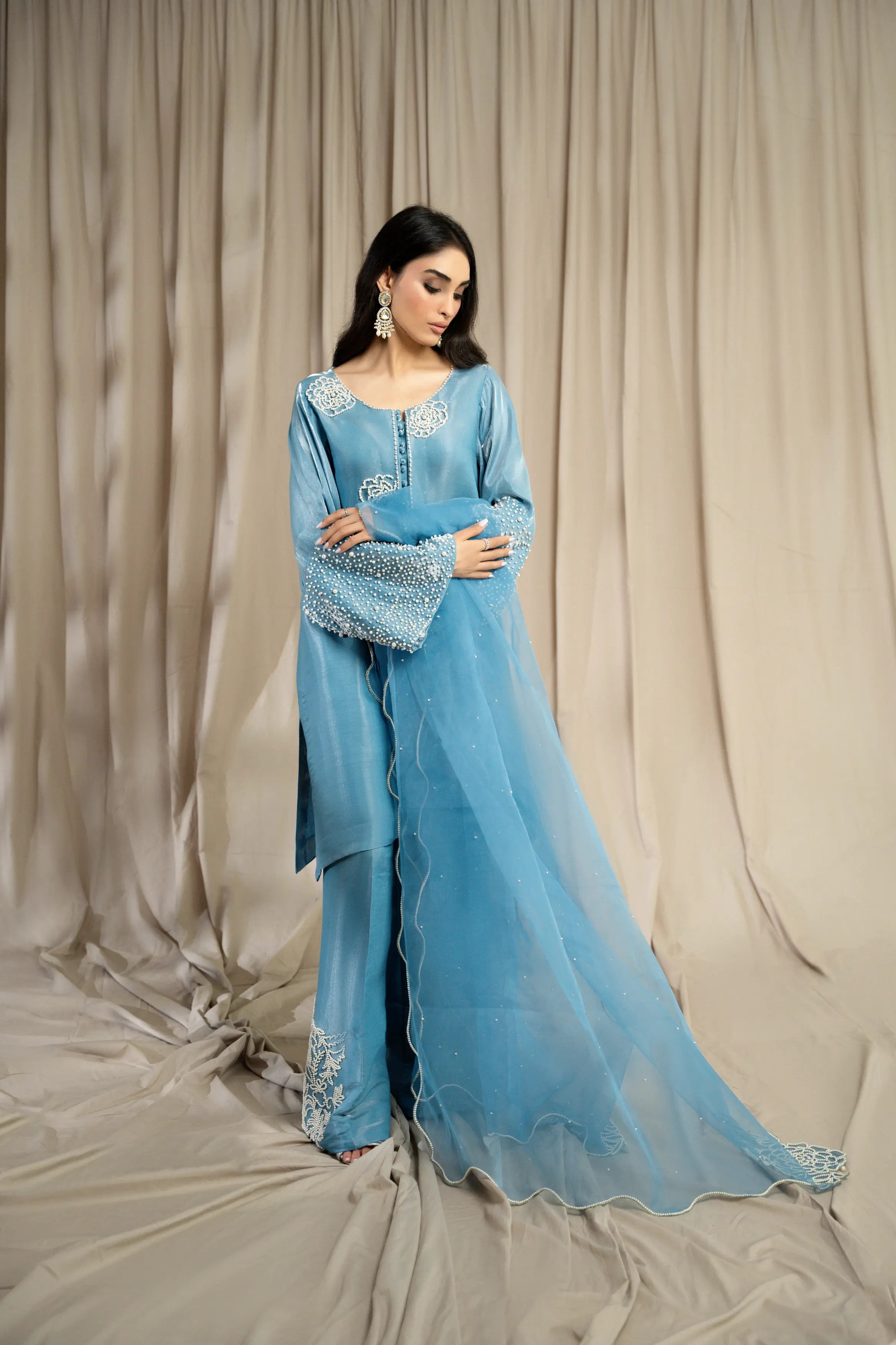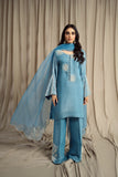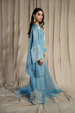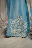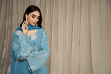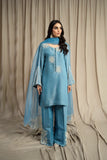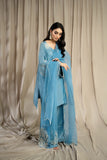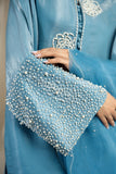 LIA - Festive Formal: The ensemble features a Cinderella blue sheesha silk short shirt with round neckline finished with fabric buttons paired with wide leg shalwar embellished with delicate floral pearl embroidery. Organza dupatta adorned with pearl embroidery and cutwork edges. Perfect for daytime soirées or after dark edits.