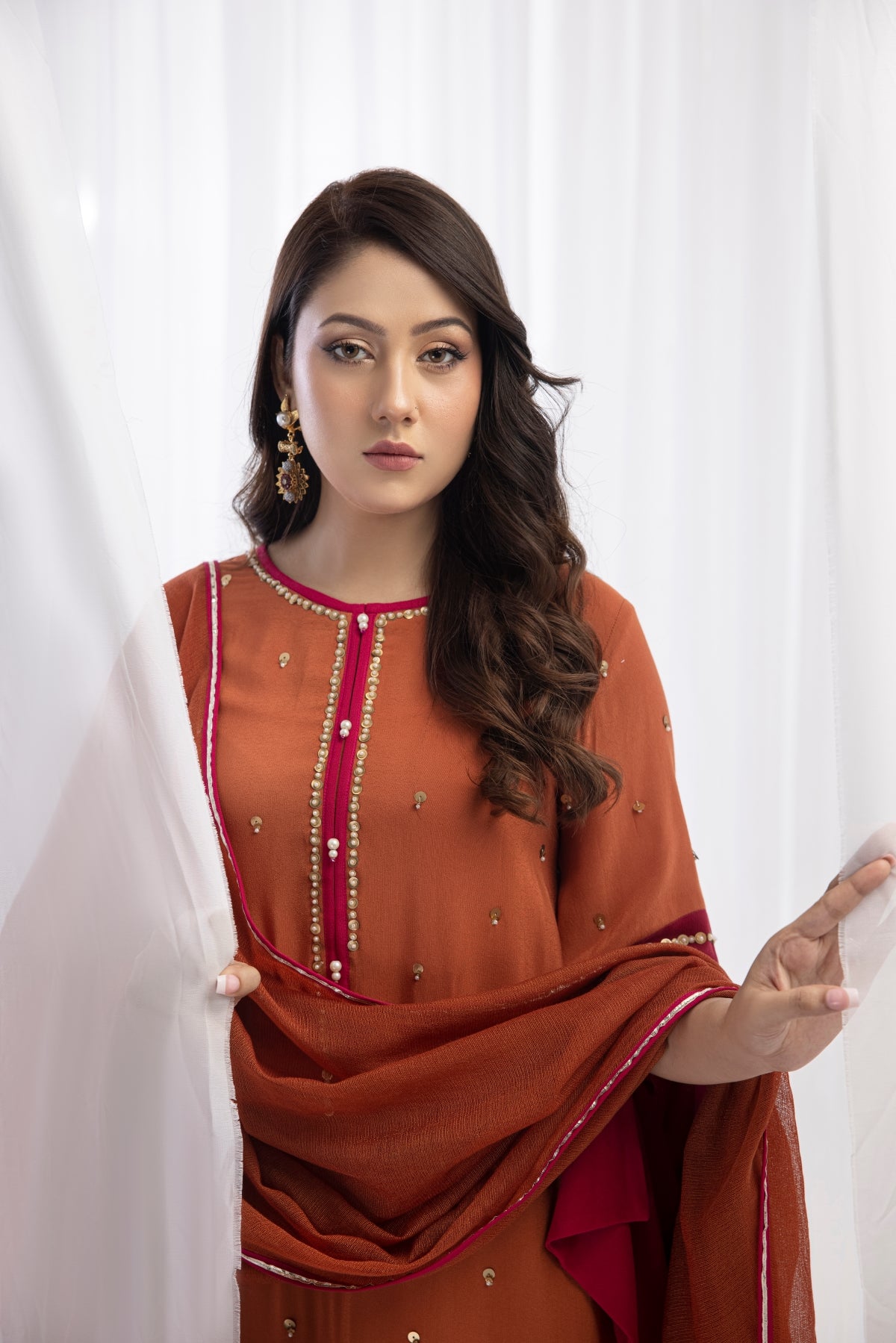 Jahaan'23: Burnt Orange pure crepe georgette shirt color blocked with magenta. A line long shirt adorned with pearls & sequins hand embroidery all over. Paired up with the burnt orange pure crepe georgette oversized straight shalwar and cotton net dupatta with lace and magenta fabric finishing. A perfect chic look for this festive season.